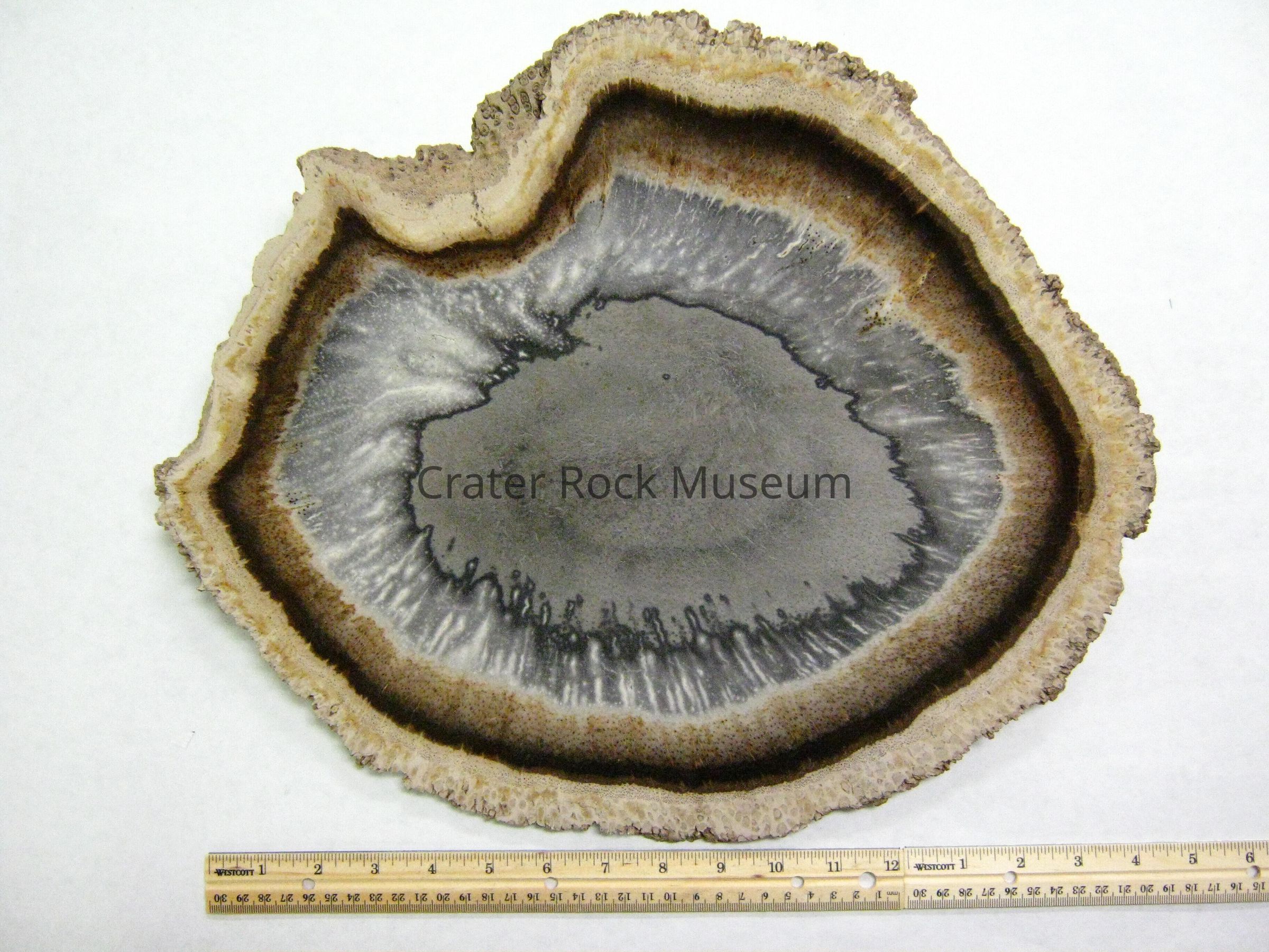 Description: Thin slab with polished face. Tan and beige band on outer perimeter with a dark brown band next to it fading to beige to a crystalline grey with solid grey in the center.