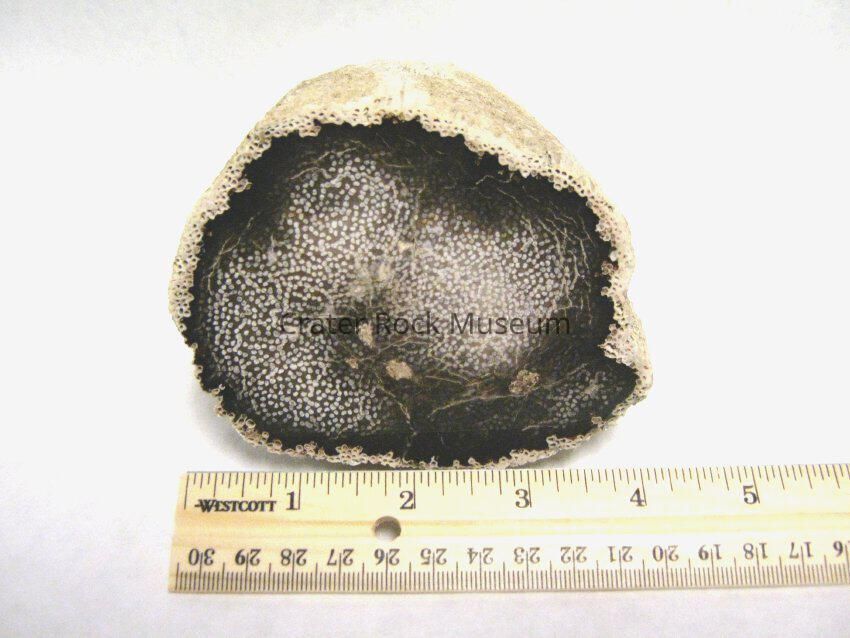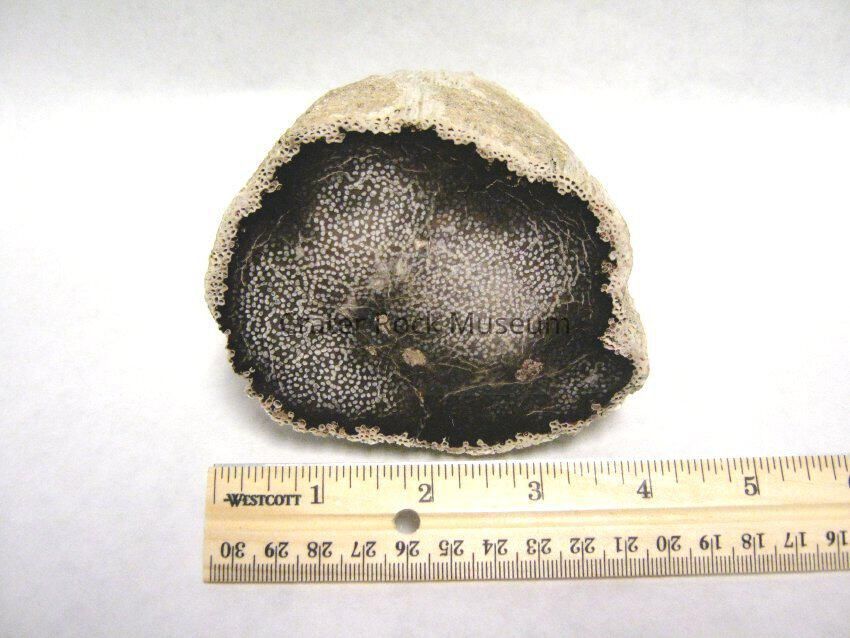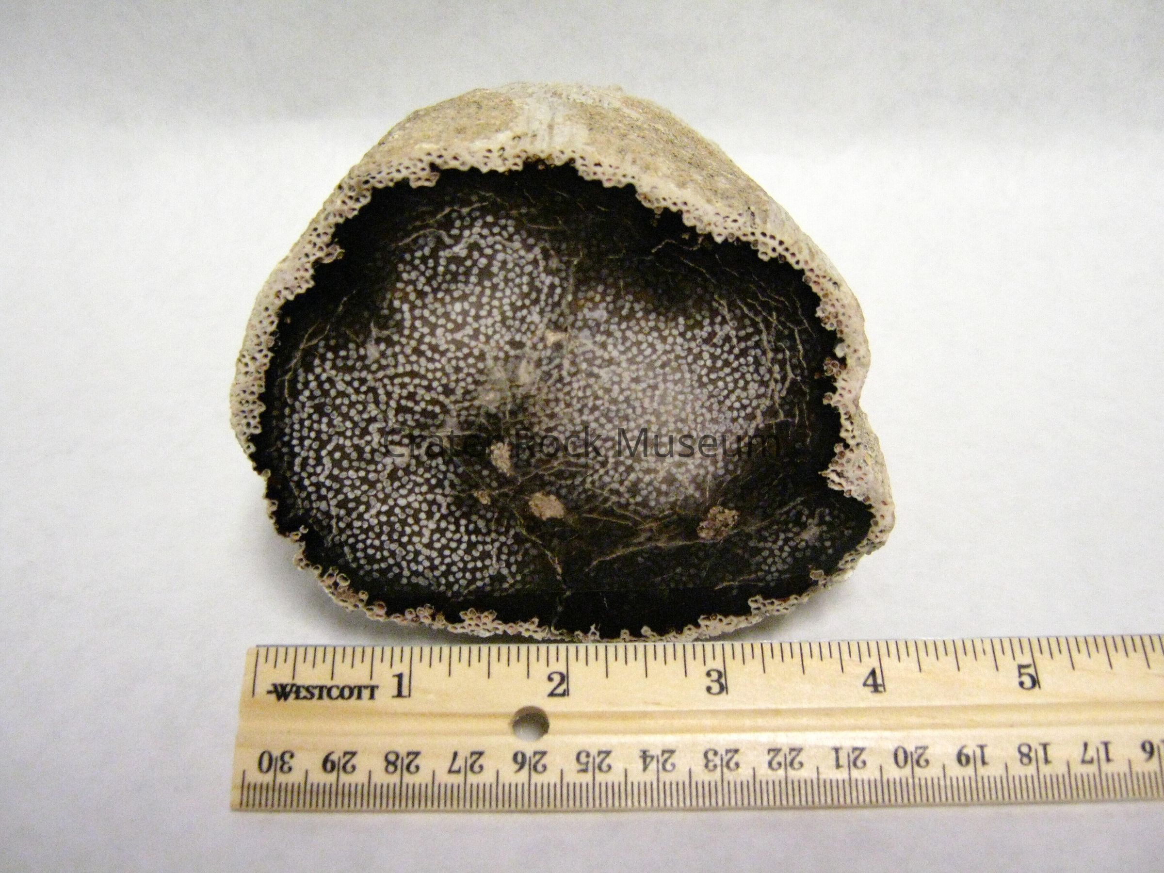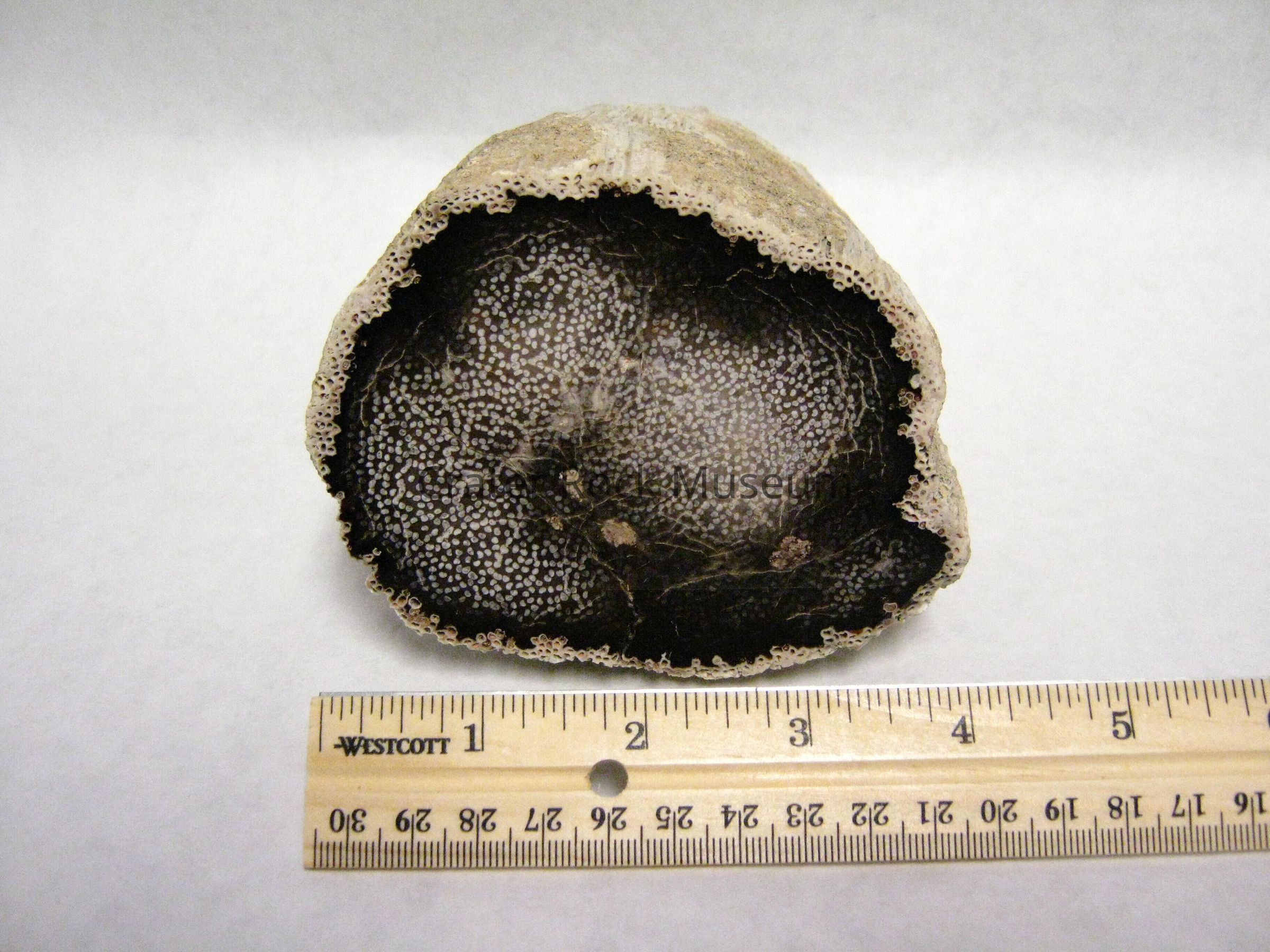 Description: Cylindrical specimen with one end cut and polished. Light tan porus outer layer with dark brown to black inner area with a spotted center area beige in color.