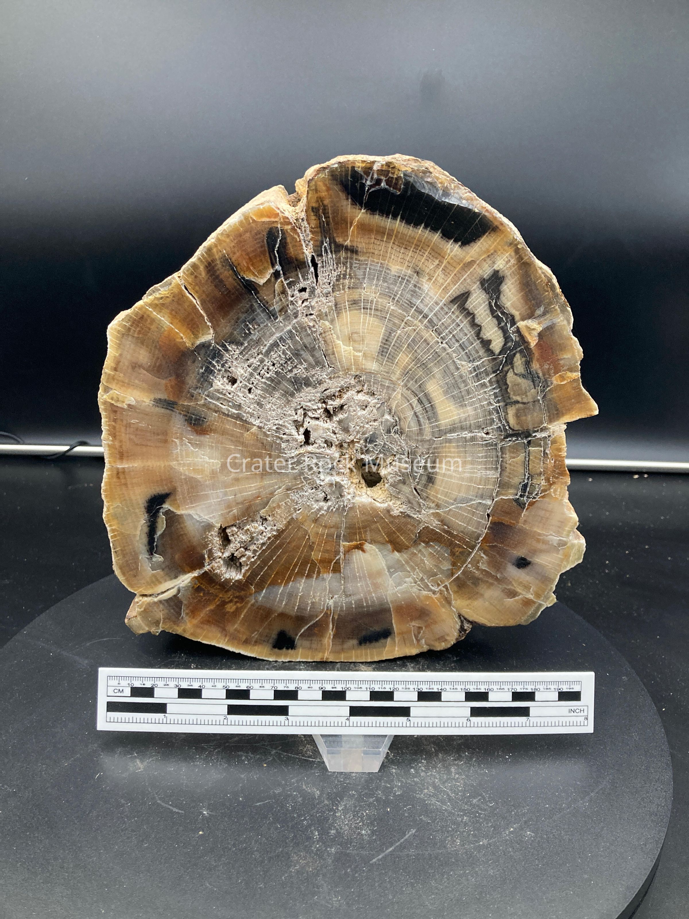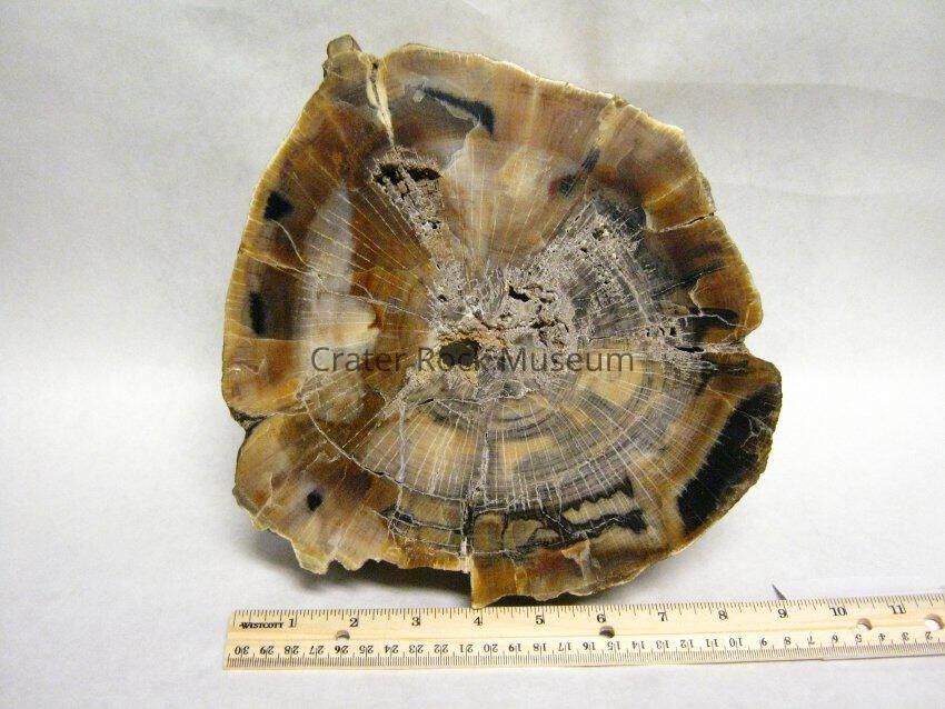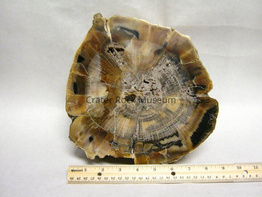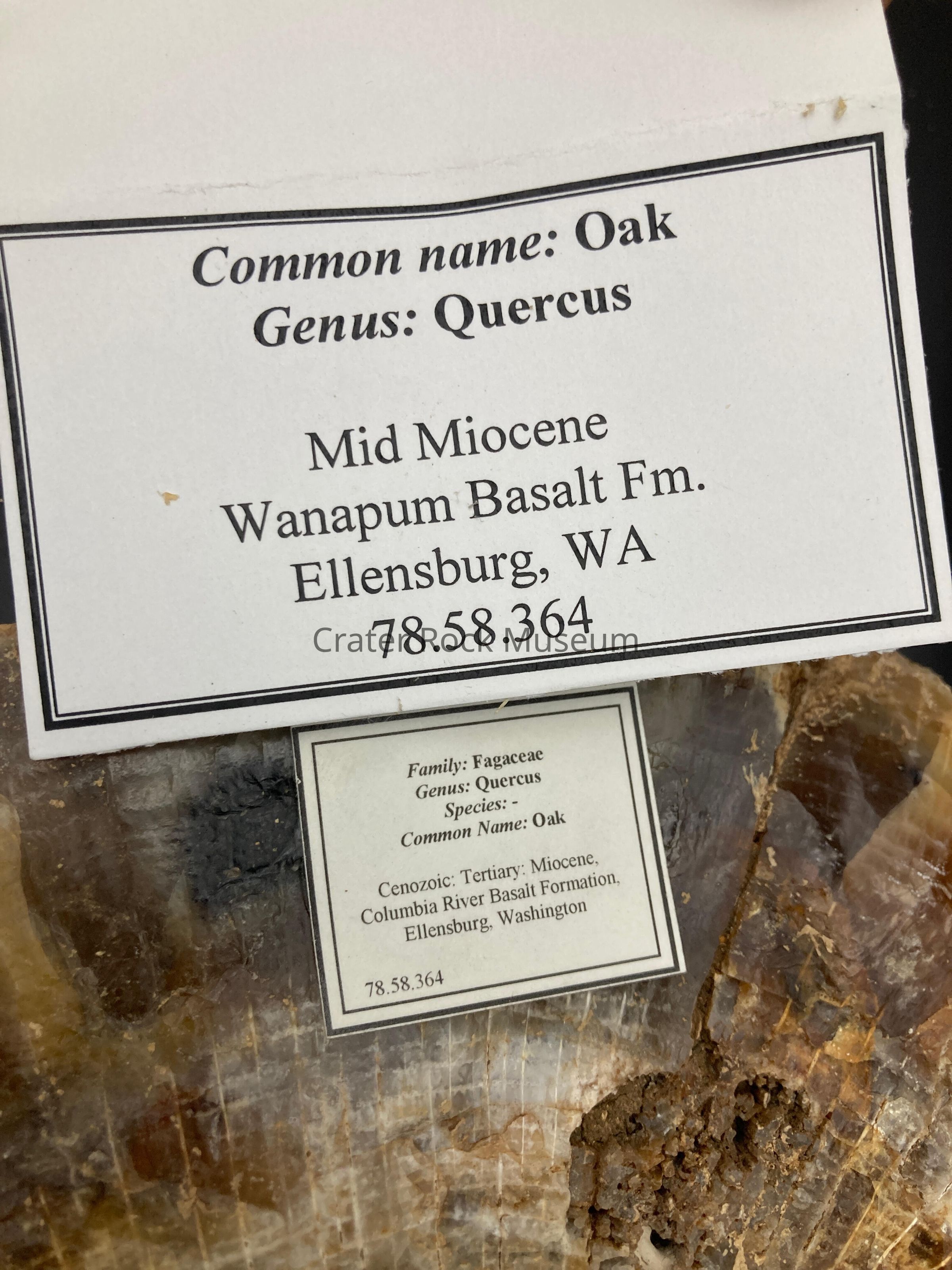 Description: Thick slab with polished face. Colors range from creams, browns, greys and some black. Piece is filled with cracks and open areas. Rays are seen. Tropical tree. Delmar described this specimen as a Washington Sycamore, whereas Doug Foster described it as an Oak.