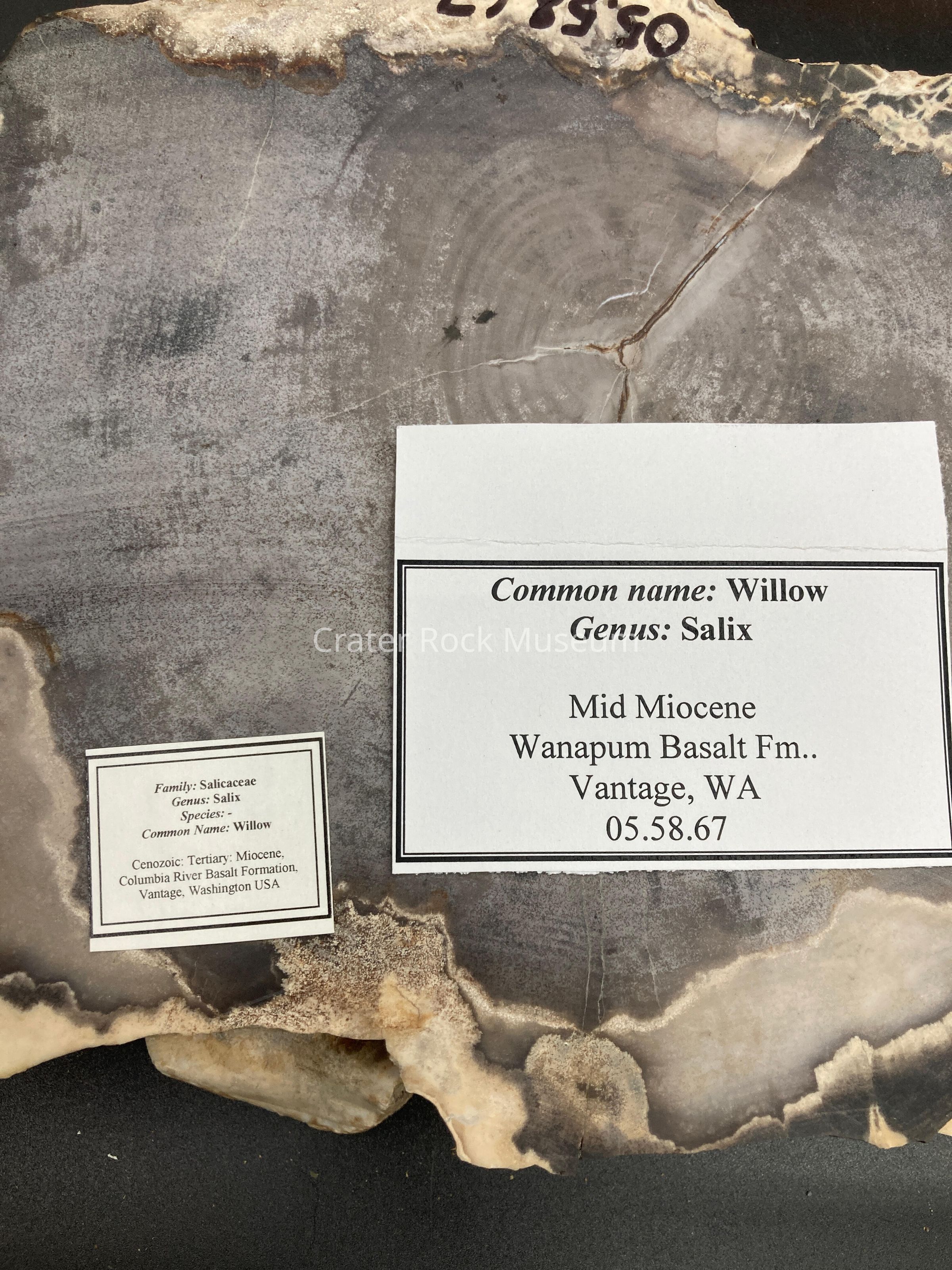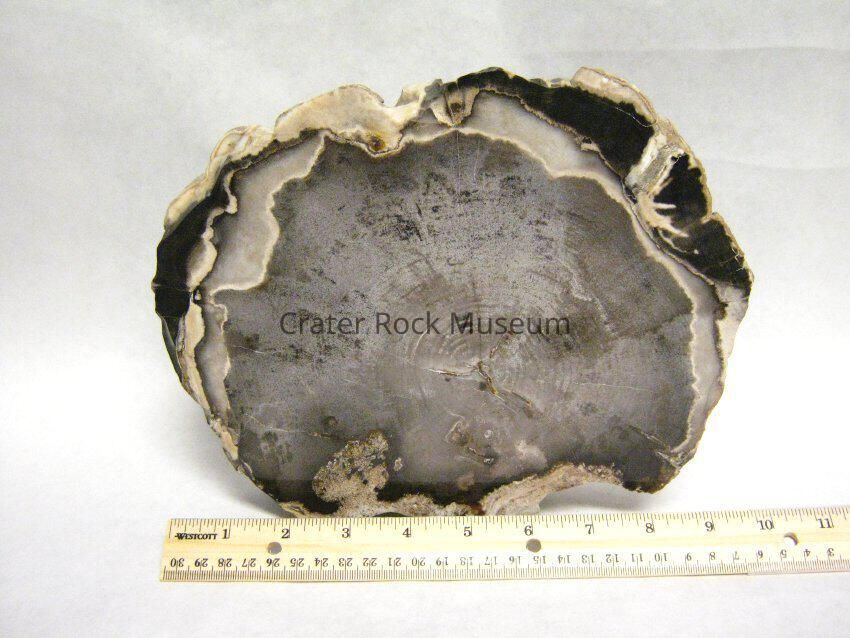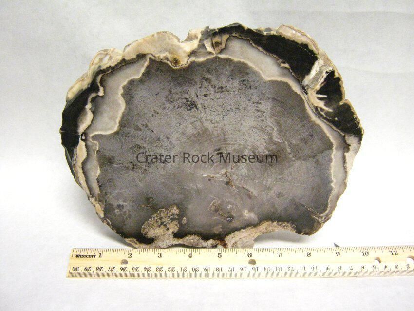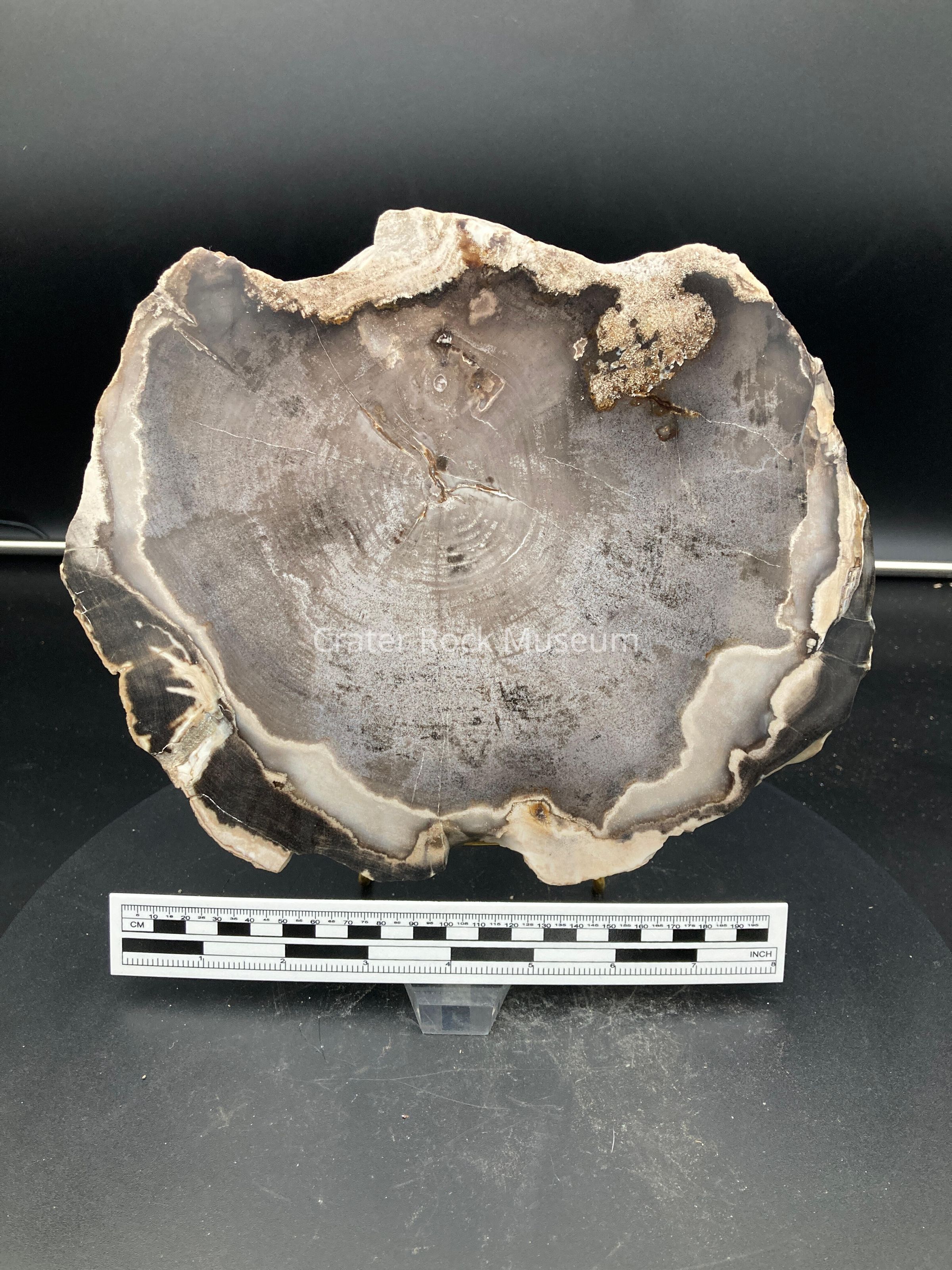 Description: Thick slab with polished face. Beige and black irregular bands surrounding outer area with a creamy-white and tan irregular band below the outer bands and this surrounds a grey and black inner area with visible growth rings.