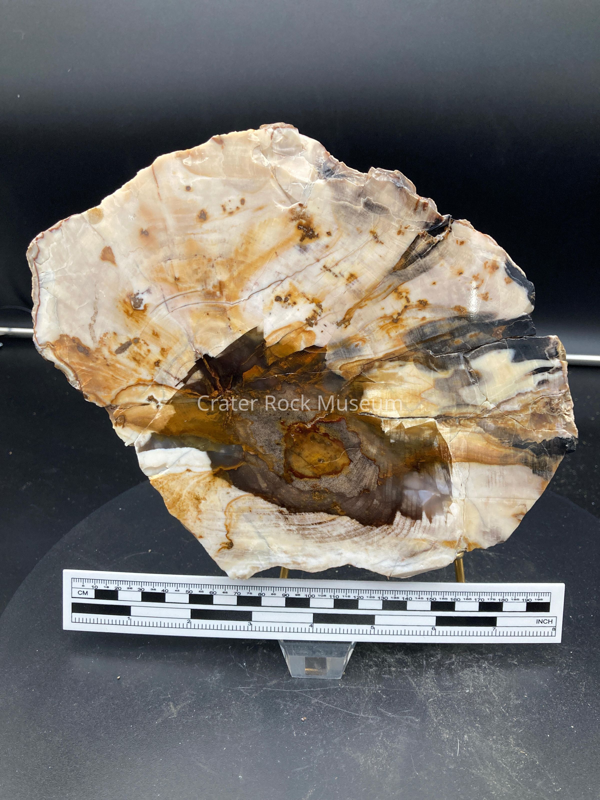 Description: Thick slab with polished face. Beige,tan and orange throughout the face, with some thick black streaks and a large black spot towards the center.