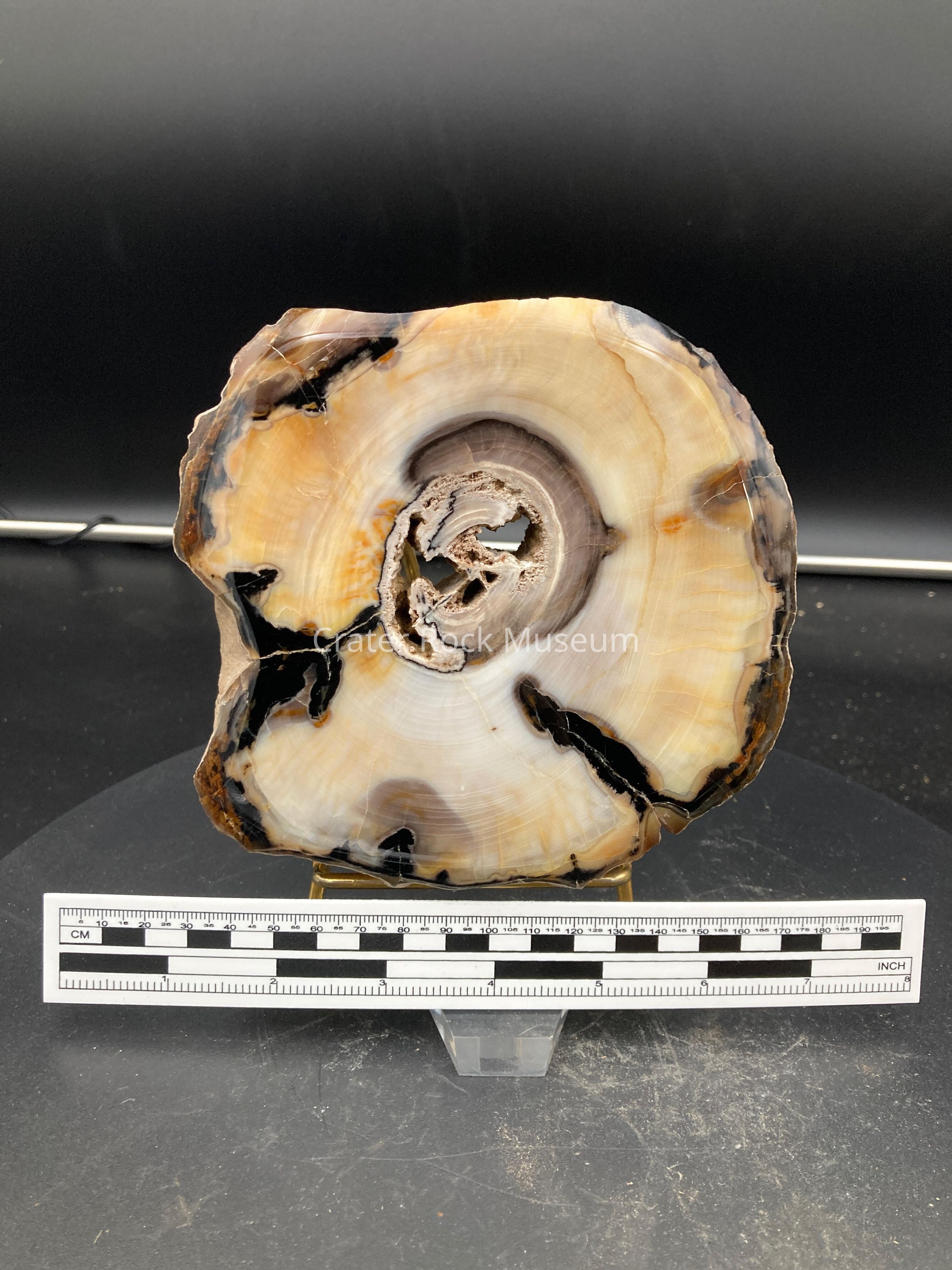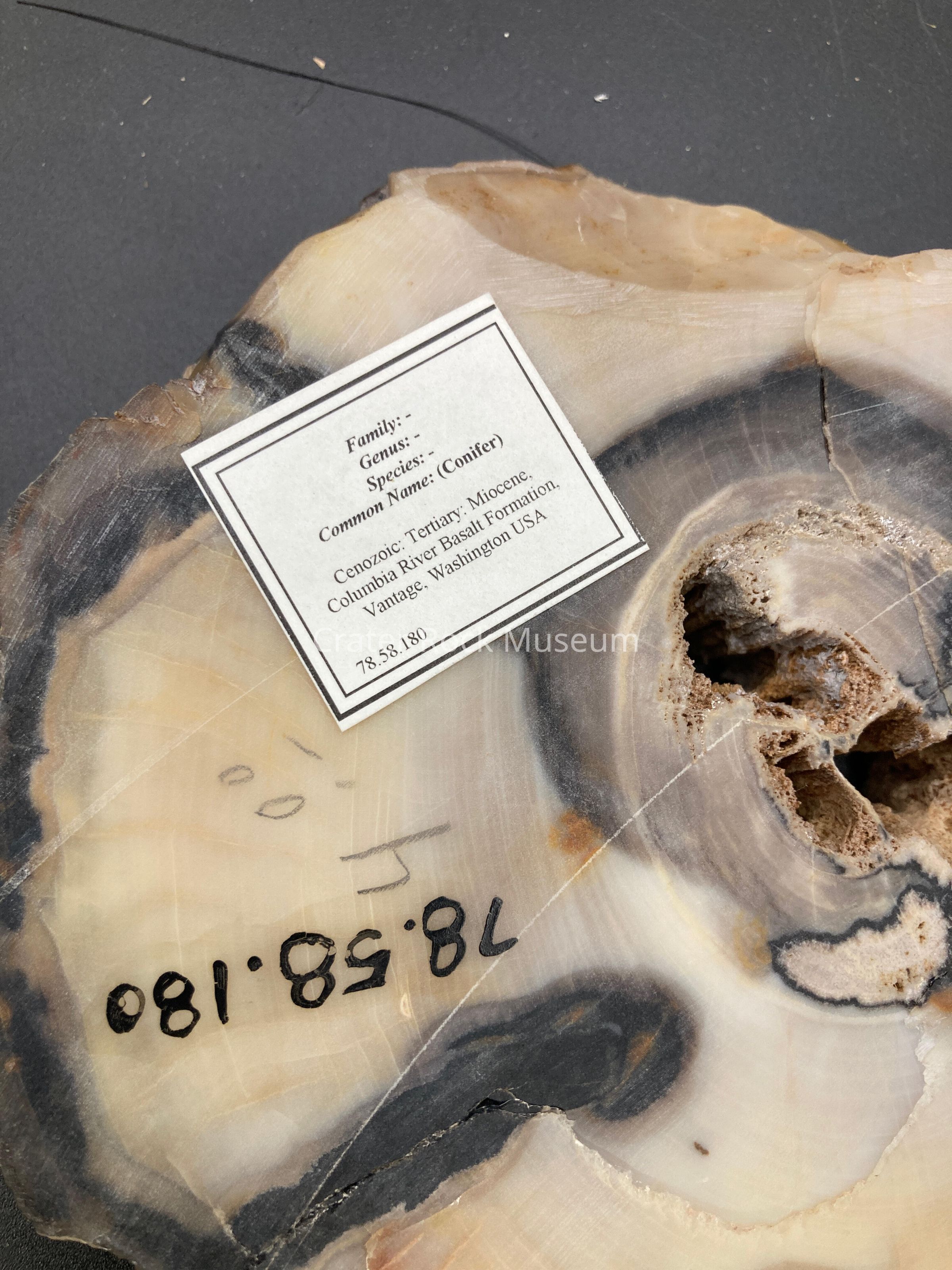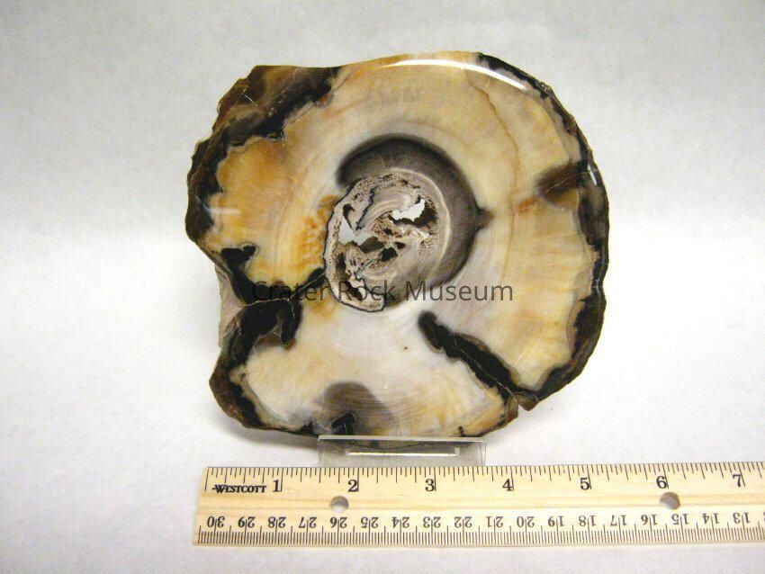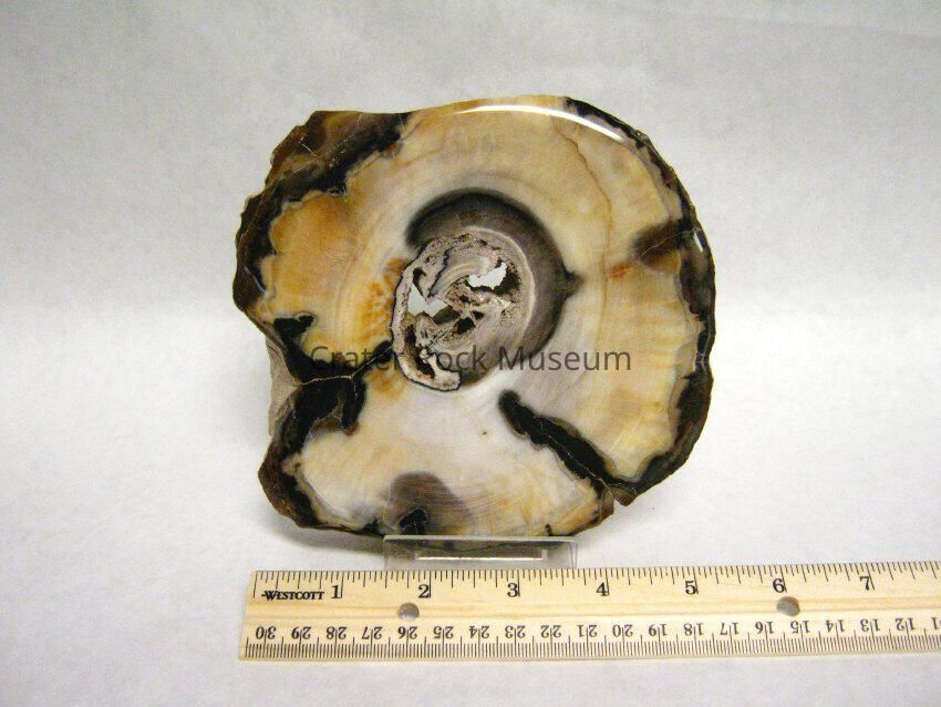 Description: Thick slice of petrified wood, varying in thickness from Badger Pocket, or "Gopher Pocket" near Ellensburg, Washington. Wood is Opalized. Colors: Center contains several holes, surrounded in wood in browns and black with white, yellow and beige opalized wood (the majority of the piece) . Probally from Ogliocene Epoch. According to Doug Foster this piece is from the Columbia River Baslt Formation near Vantage, Wahington.