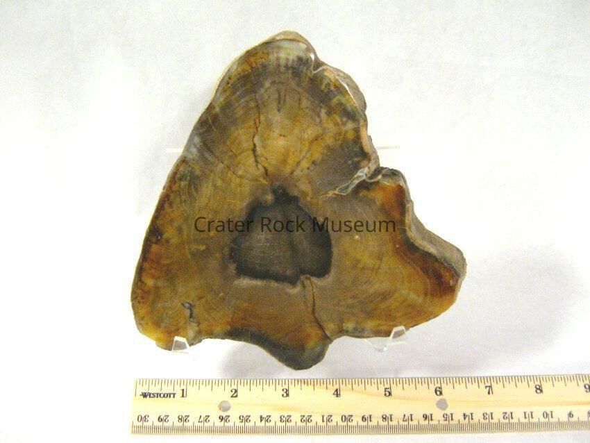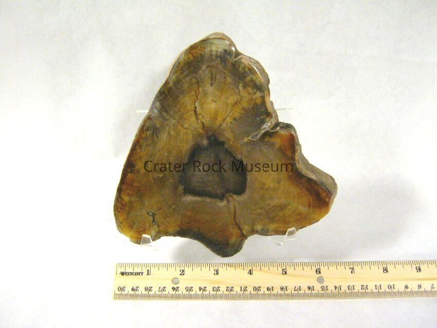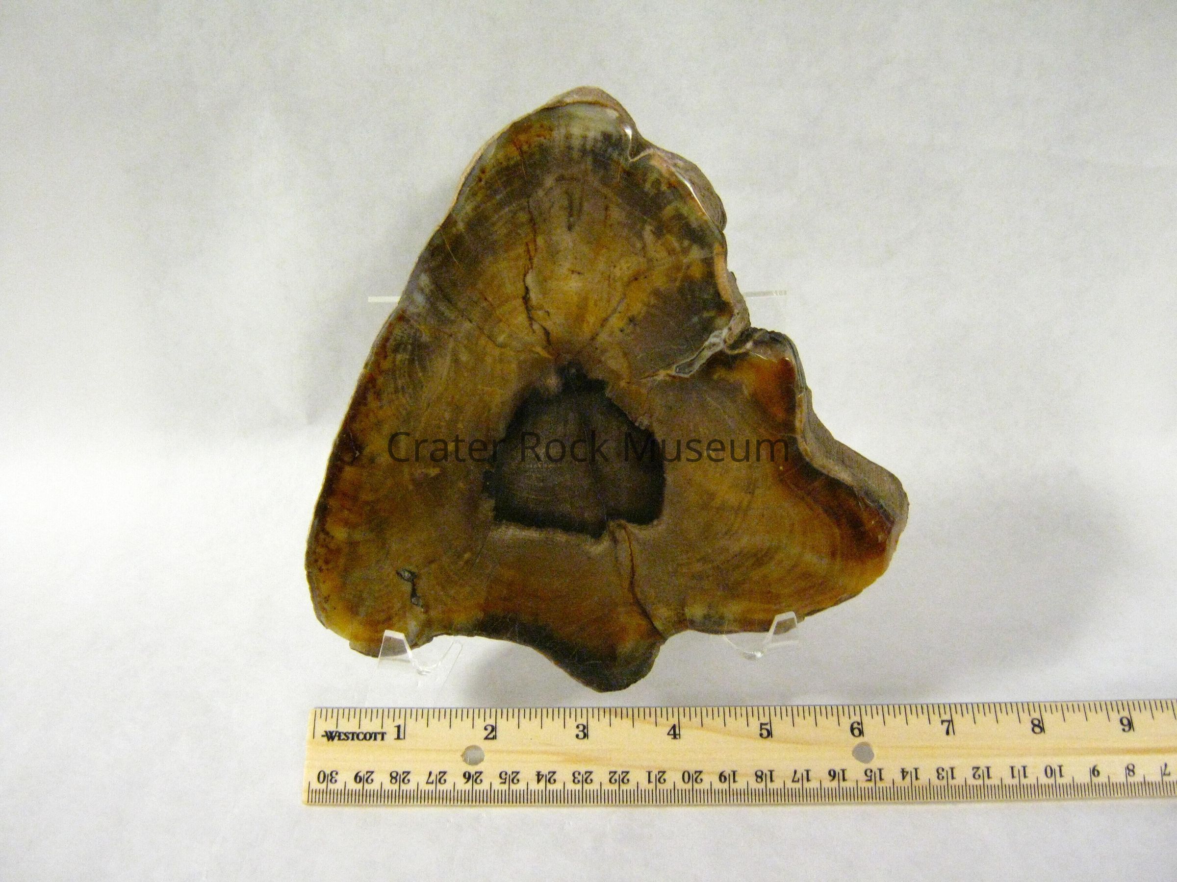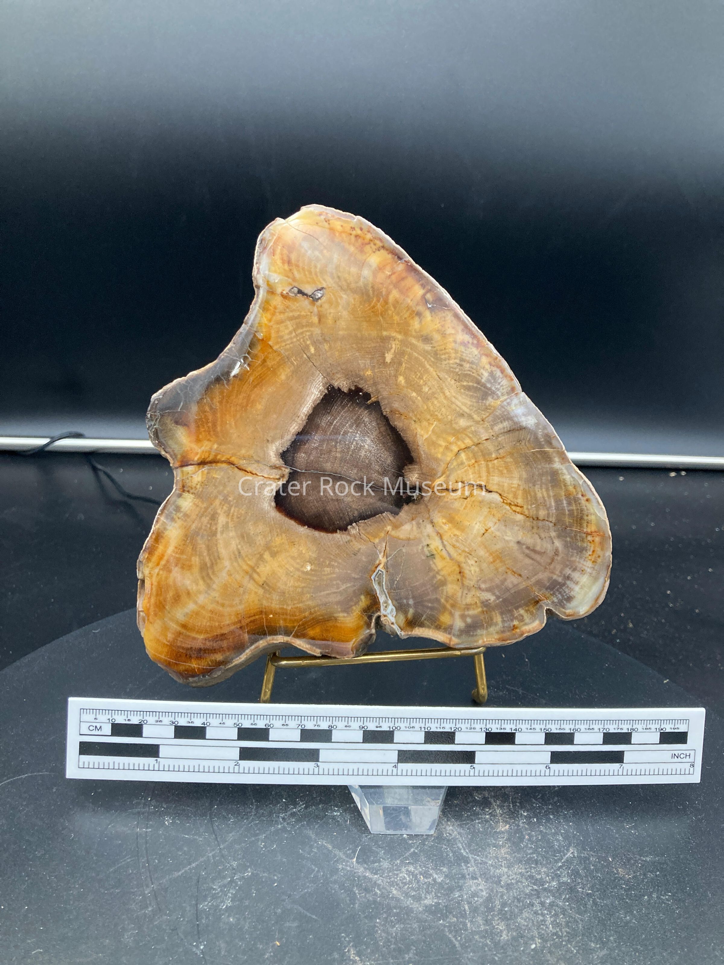 Description: Polished side shows dark center in brown and black, surrounded by wood in oranges, lighter browns, yellows and grey. Crystalline spot is to one side. Surface cracks visible. Growth rings apparent. Piece is roughly triangular in shape.