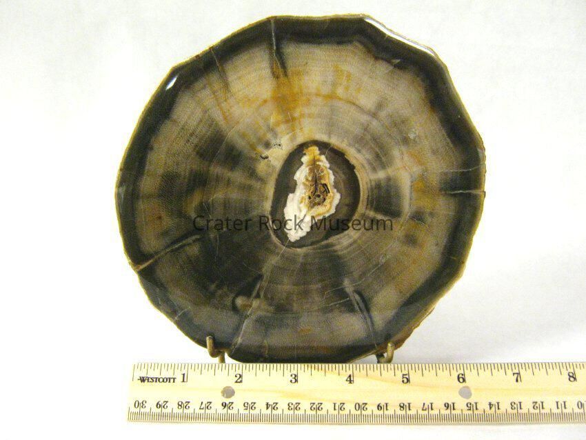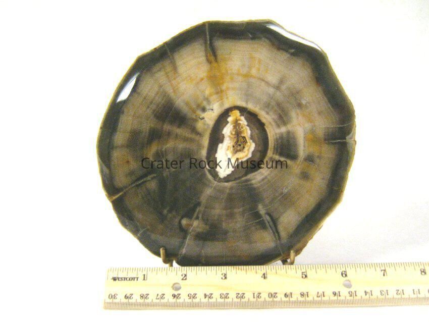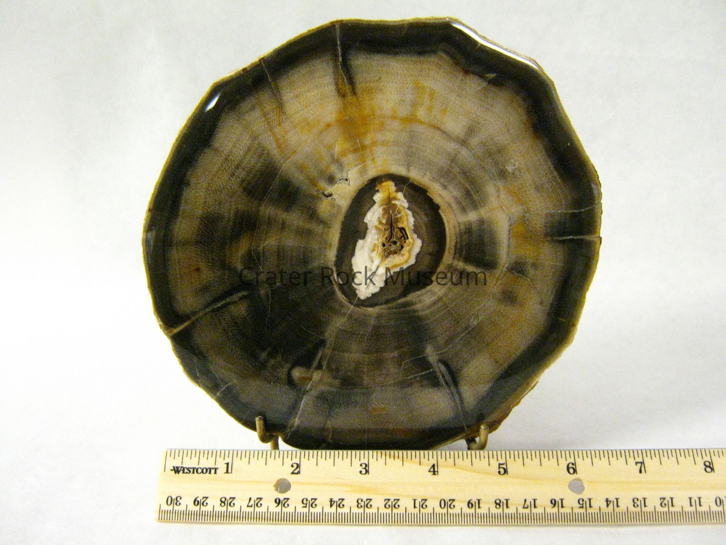 Description: Thick slice with polished face. Polished side shows white and brown center surrounded by beige, yellow and black wood. Center contains small holes. Surface cracks are present. Grain shows a "herringbone" pattern. Growth rings visible.