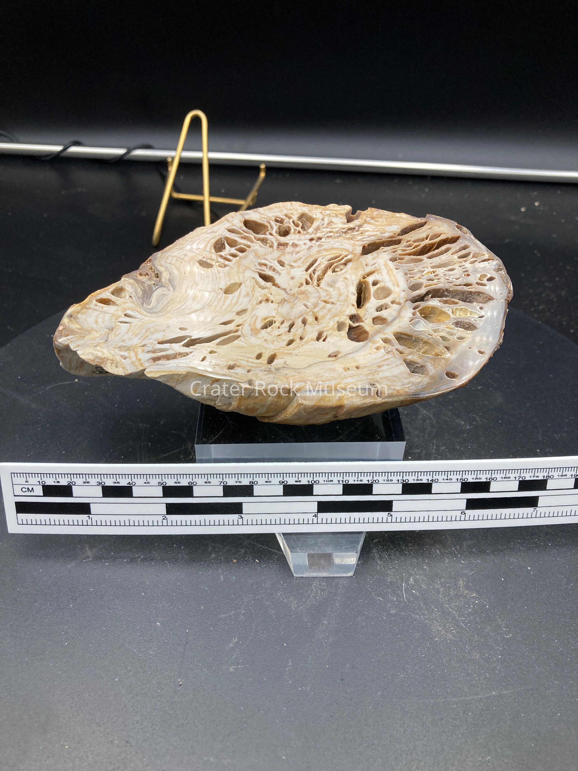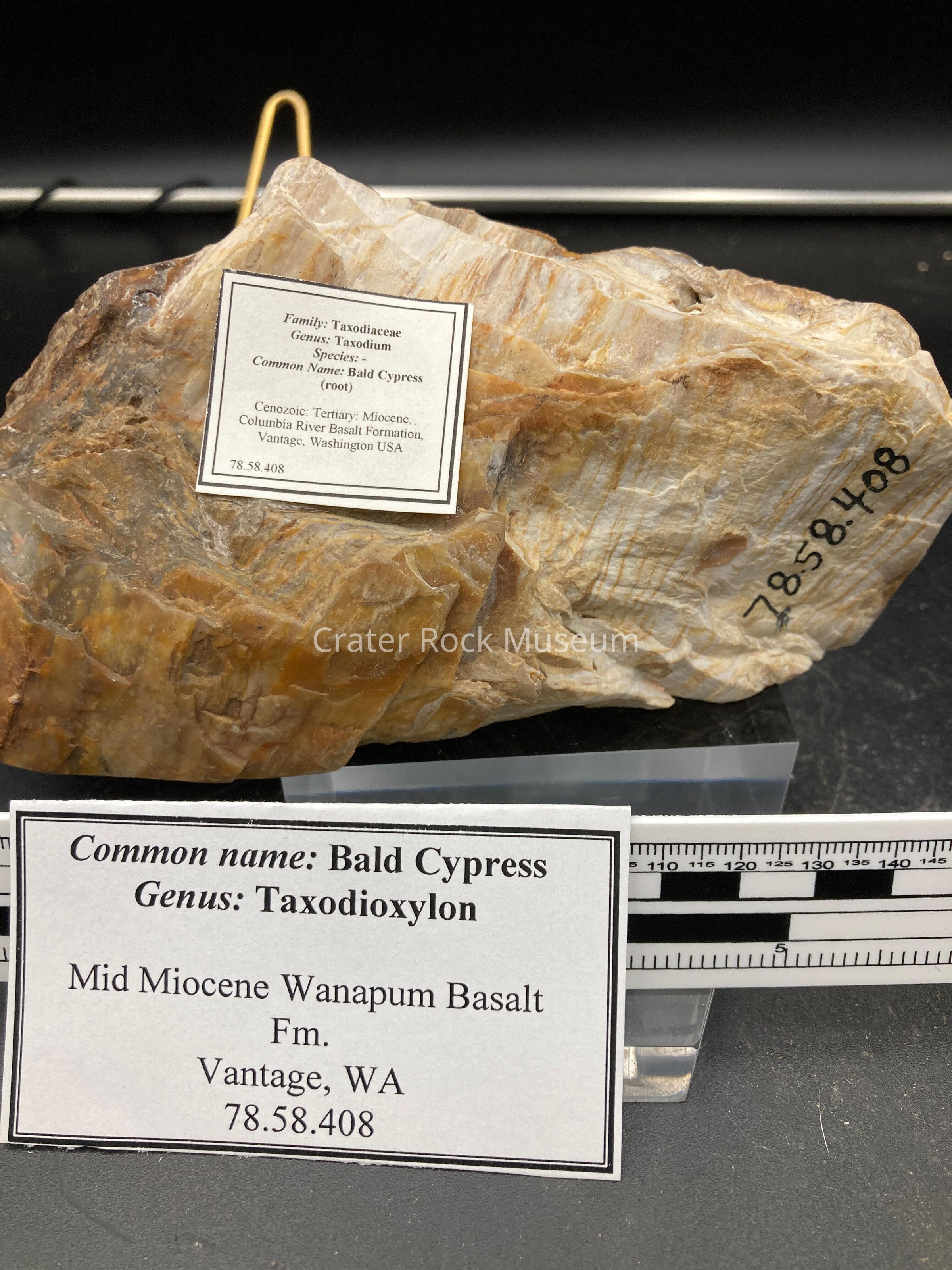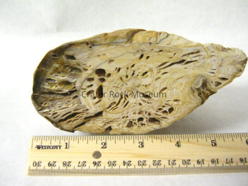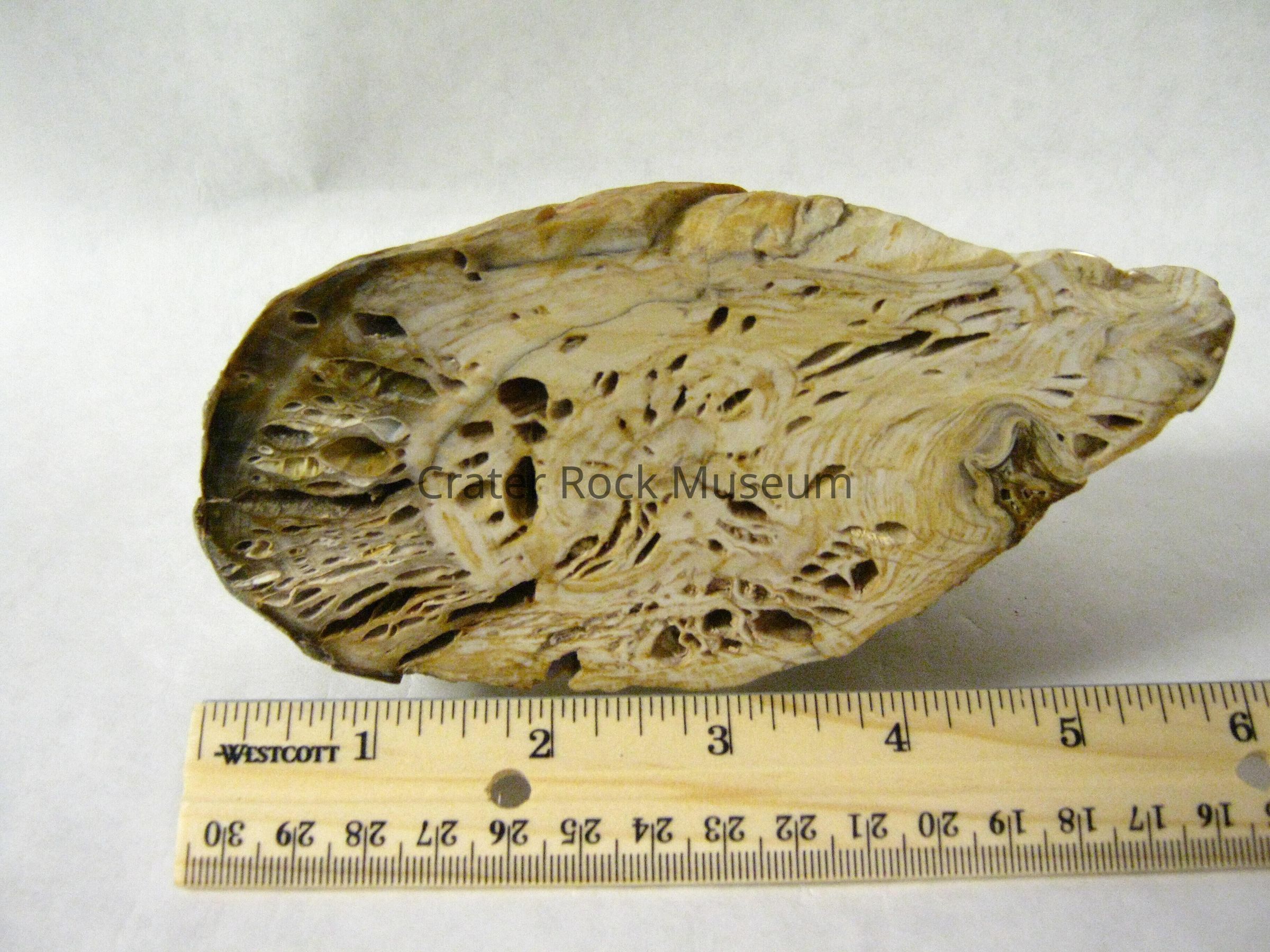 Description: According to Delmar Smith this is a tear-shaped piece of petrified Swamp Cypress from Washington. Cut side shows blond and yellow wood with some brown and grey with numerous tear-shaped holes. According to Doug Foster this is a Bald Cypress.