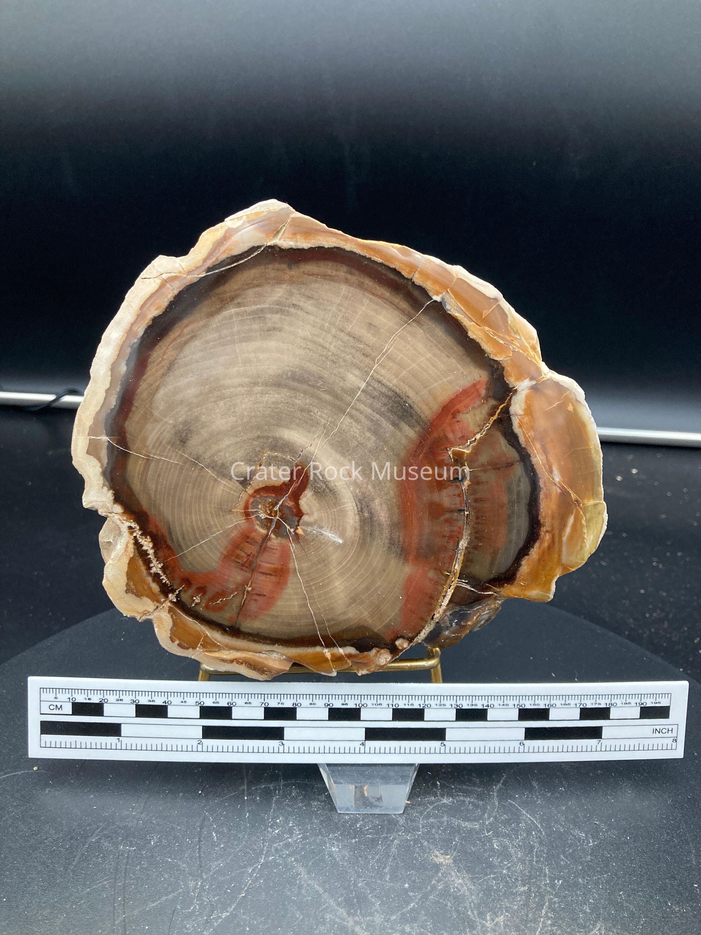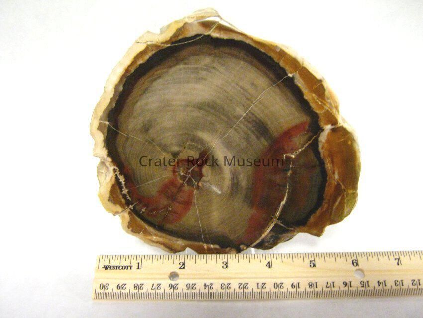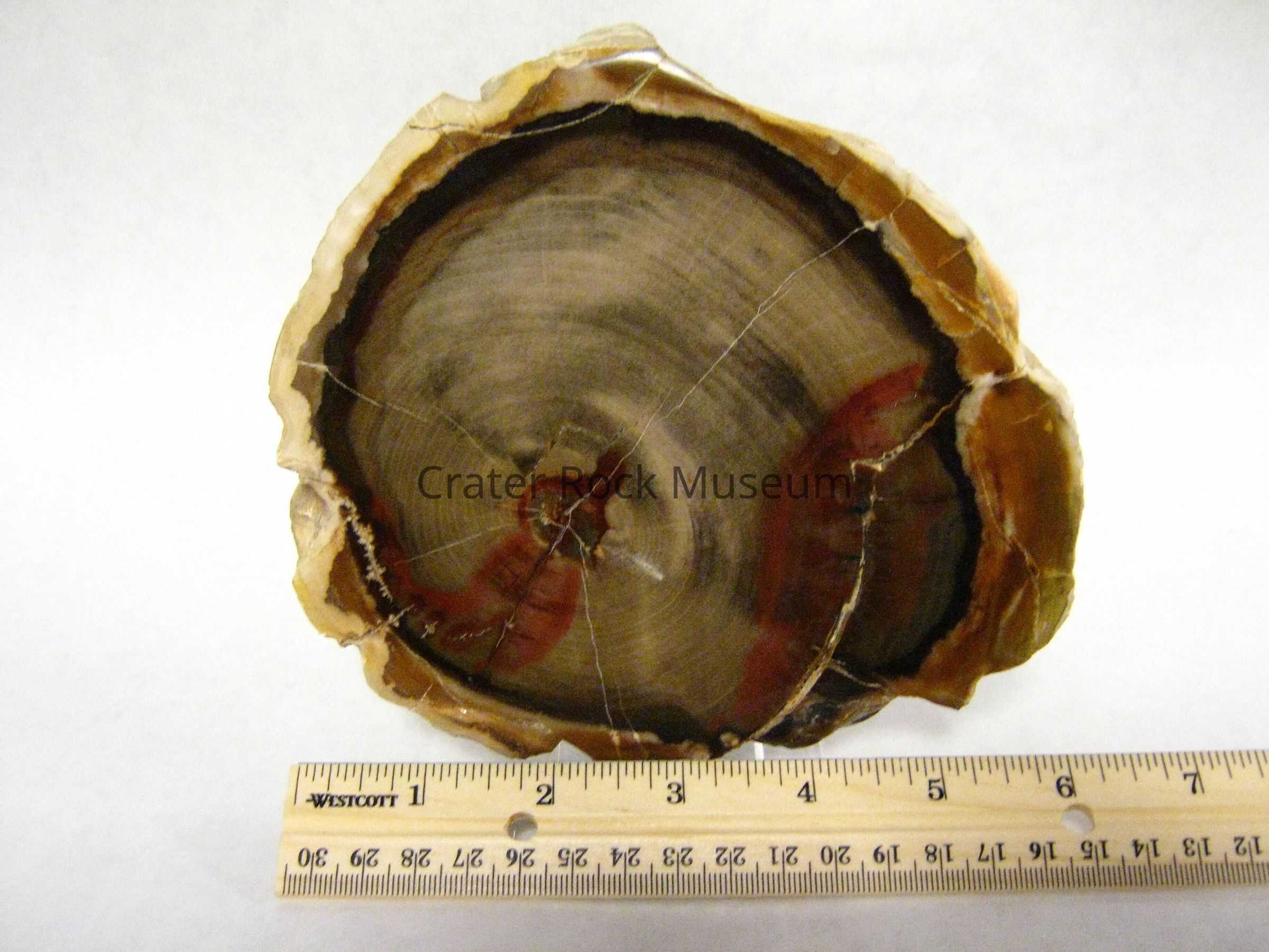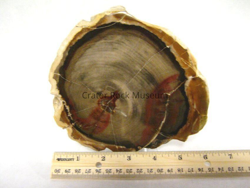 Description: Thick slab with polished face. Yellow, reddish-brown and black outer bands surrounding a beige, tan and red inner area. Growth rings are visible.