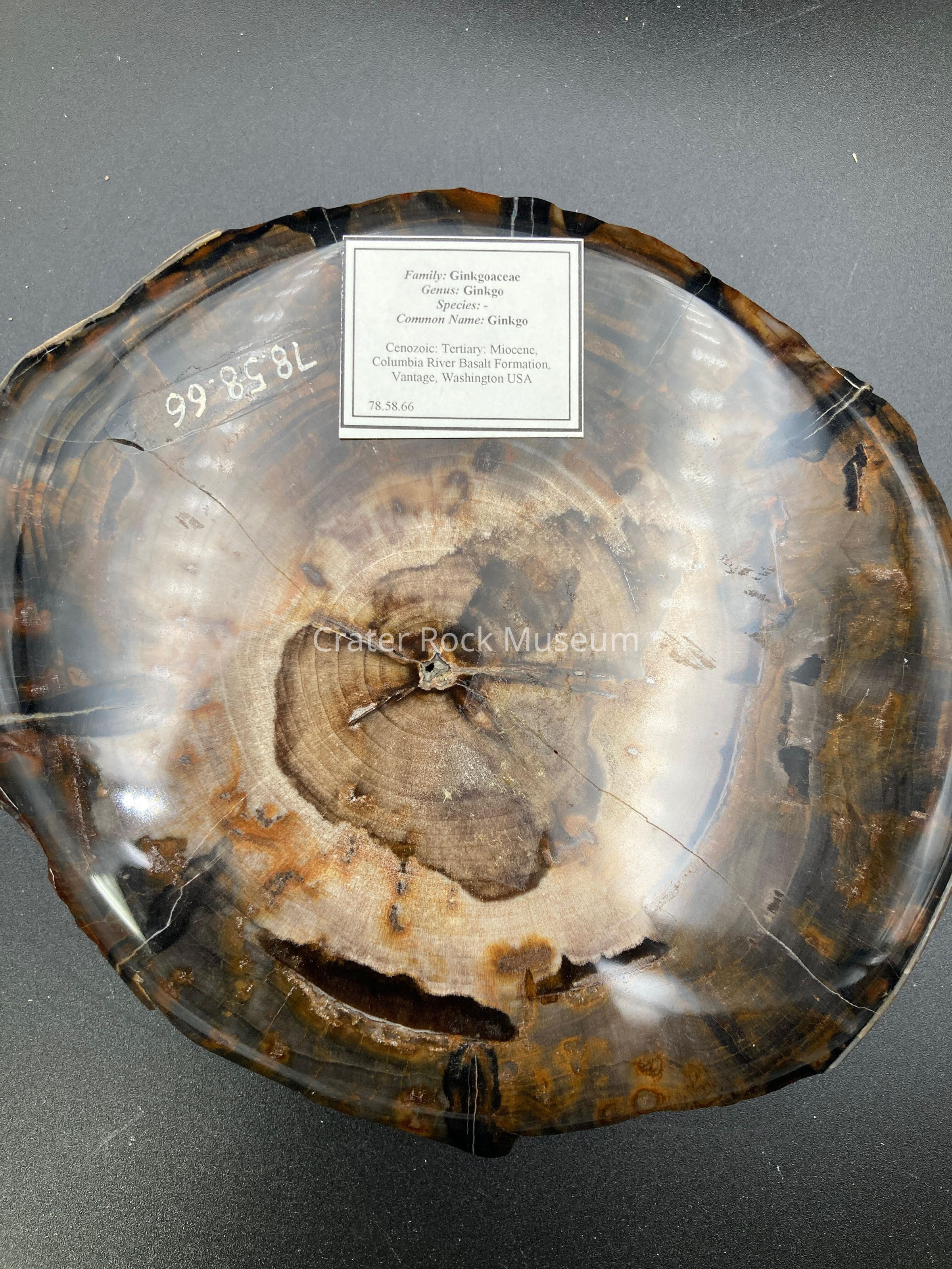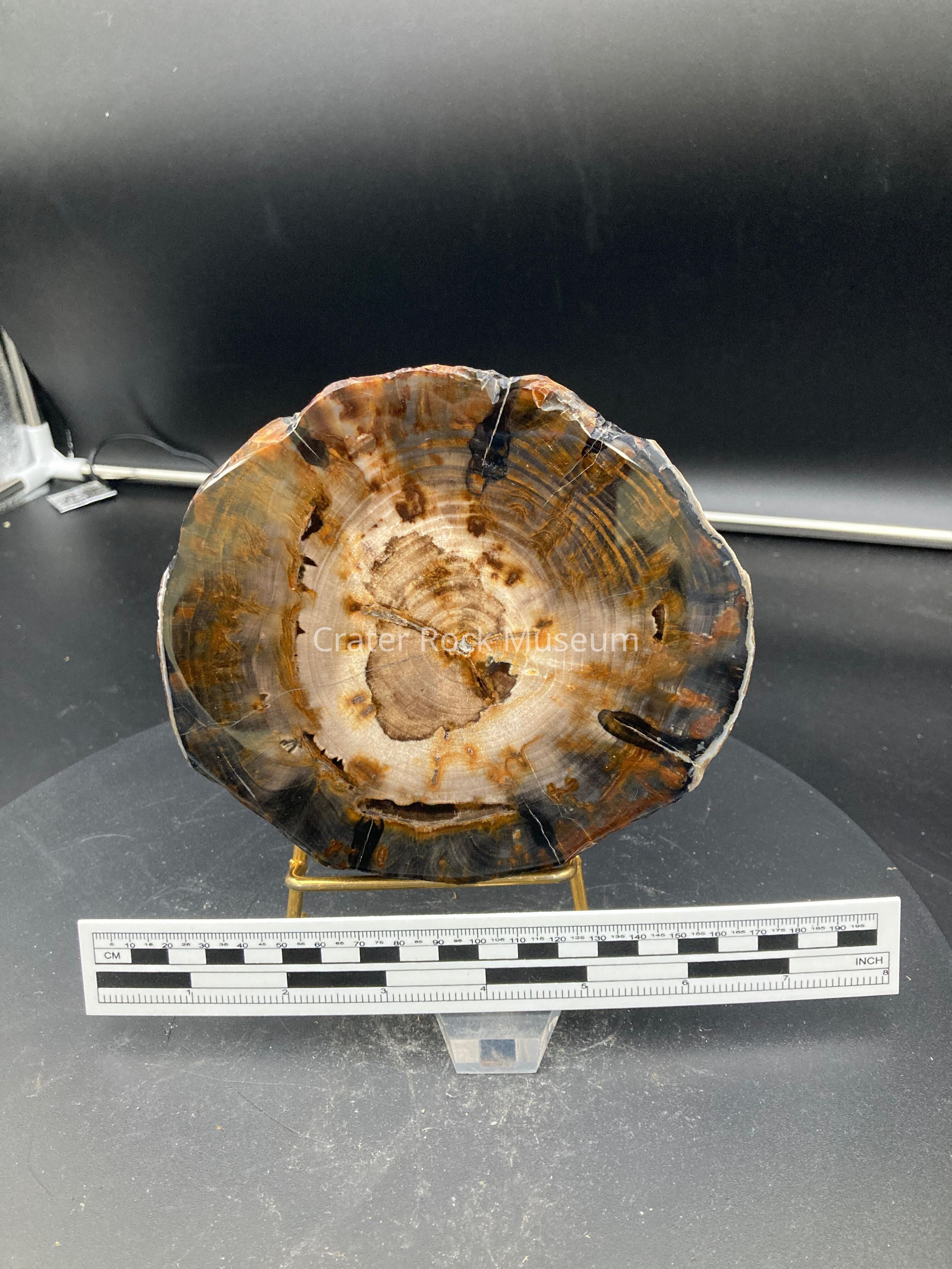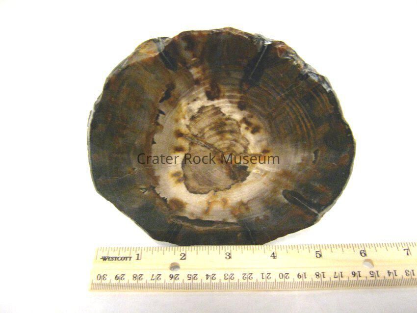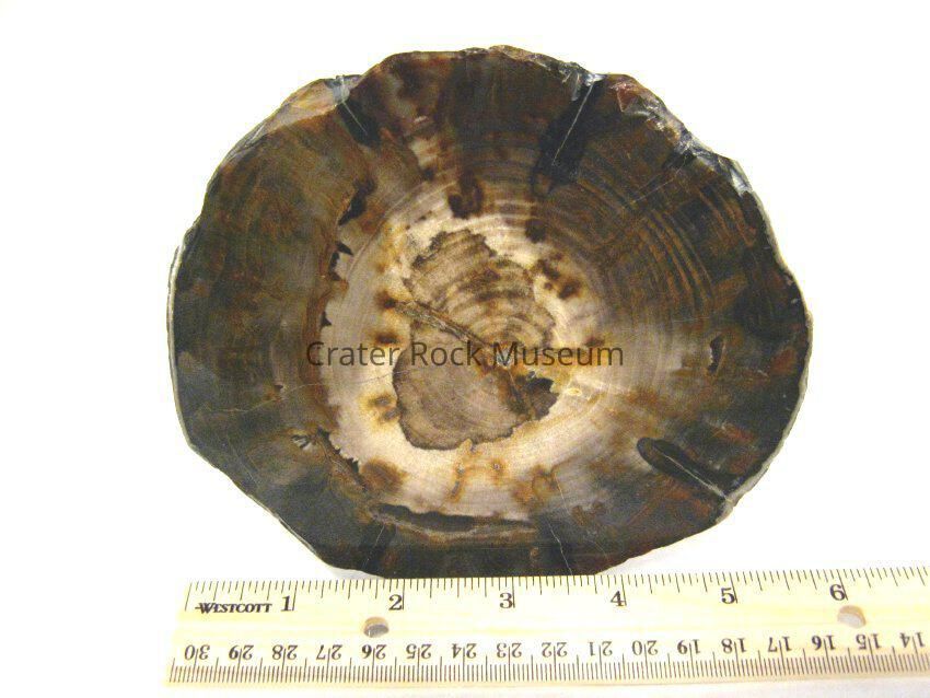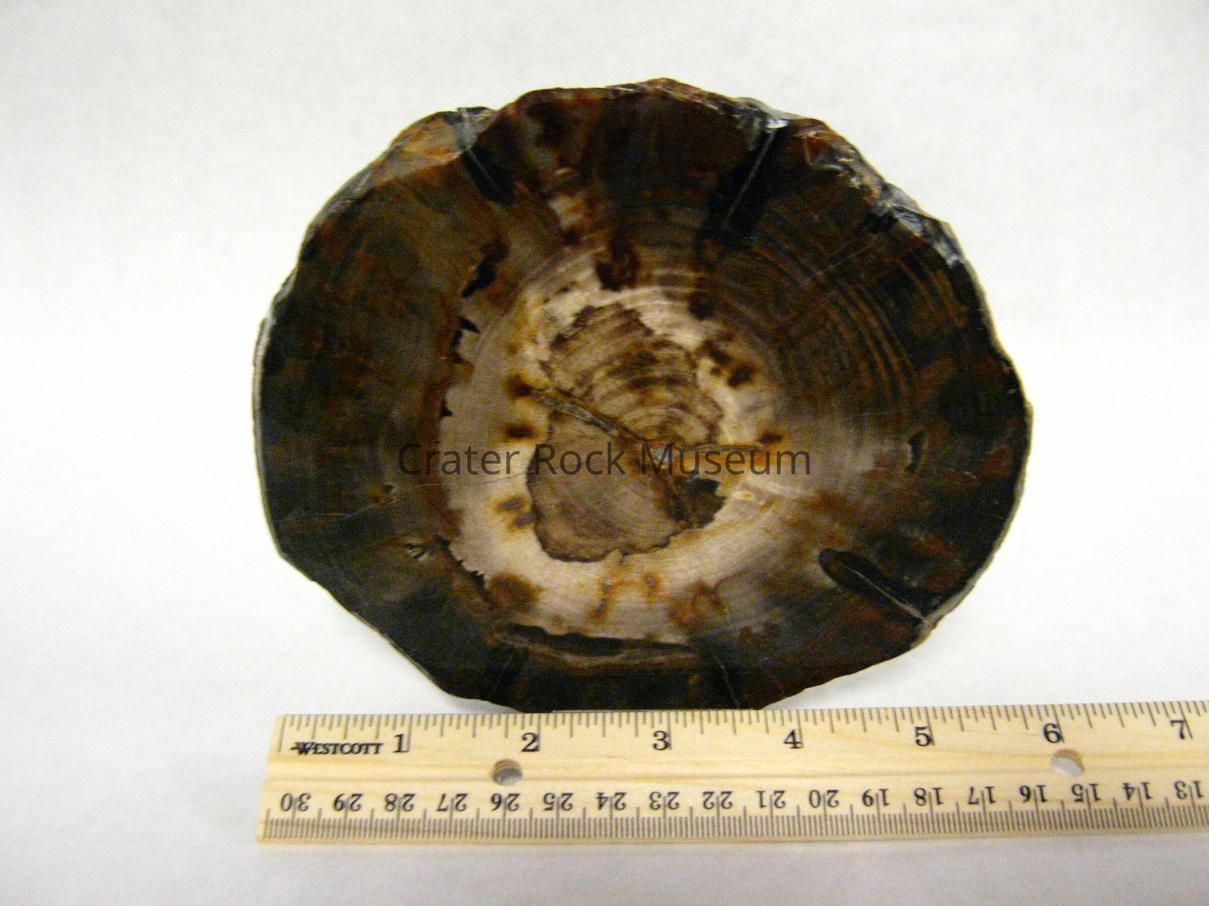 Description: Thick slab with polished face. Black, reddish-brown and some grey outer areas with a white and tan inner area. Growth rings are visible.