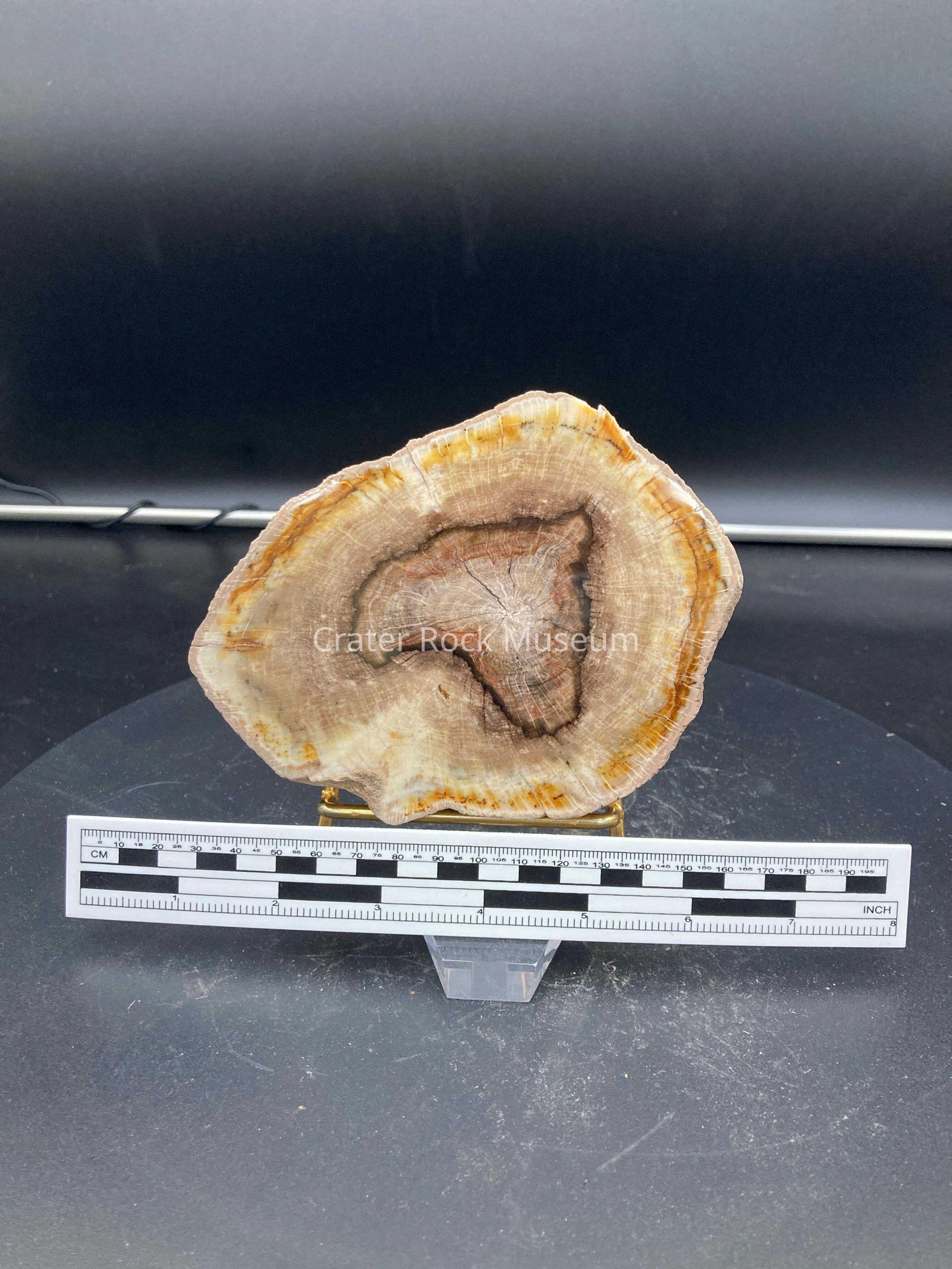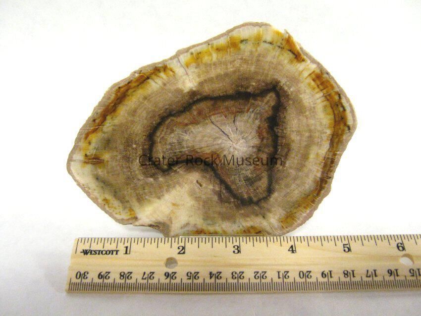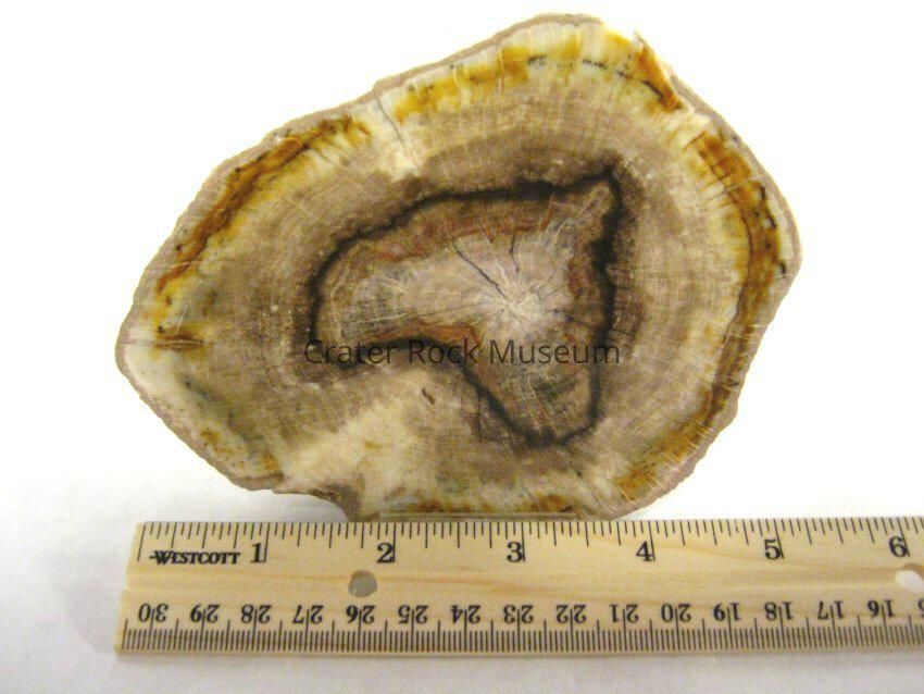 Description: Thick slab with polished face. Yellow and reddish-brown on outer edges with a yellowish-grey on the inner regions and a black band surrounding a reddish-brown and beige in the center.