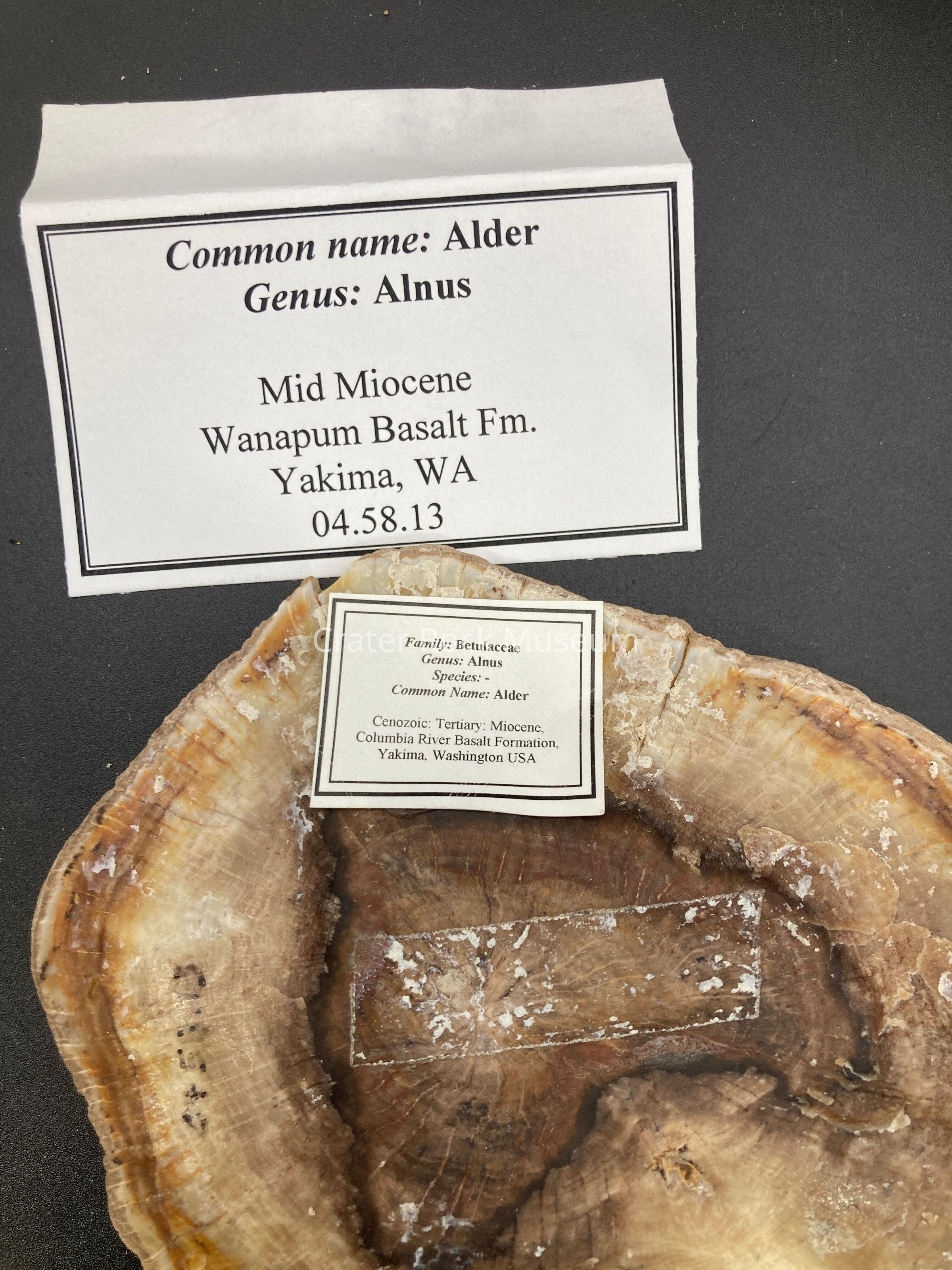 Occurrence: Silicified wood, which is the fossilization and/or opalization of organic woody matter by the deposition of SiO2 in a anaerobic environment to prevent decay. This means that the wood must somehow be buried in an oxygen free enviroment, possibly in the silt-laden river or the bottom of a lake or buried by volcanic ash or volcanic related mudflow. The organic material in the wood is then replaced by silica, other minerals determined the colors of the petrified wood.
