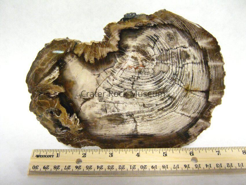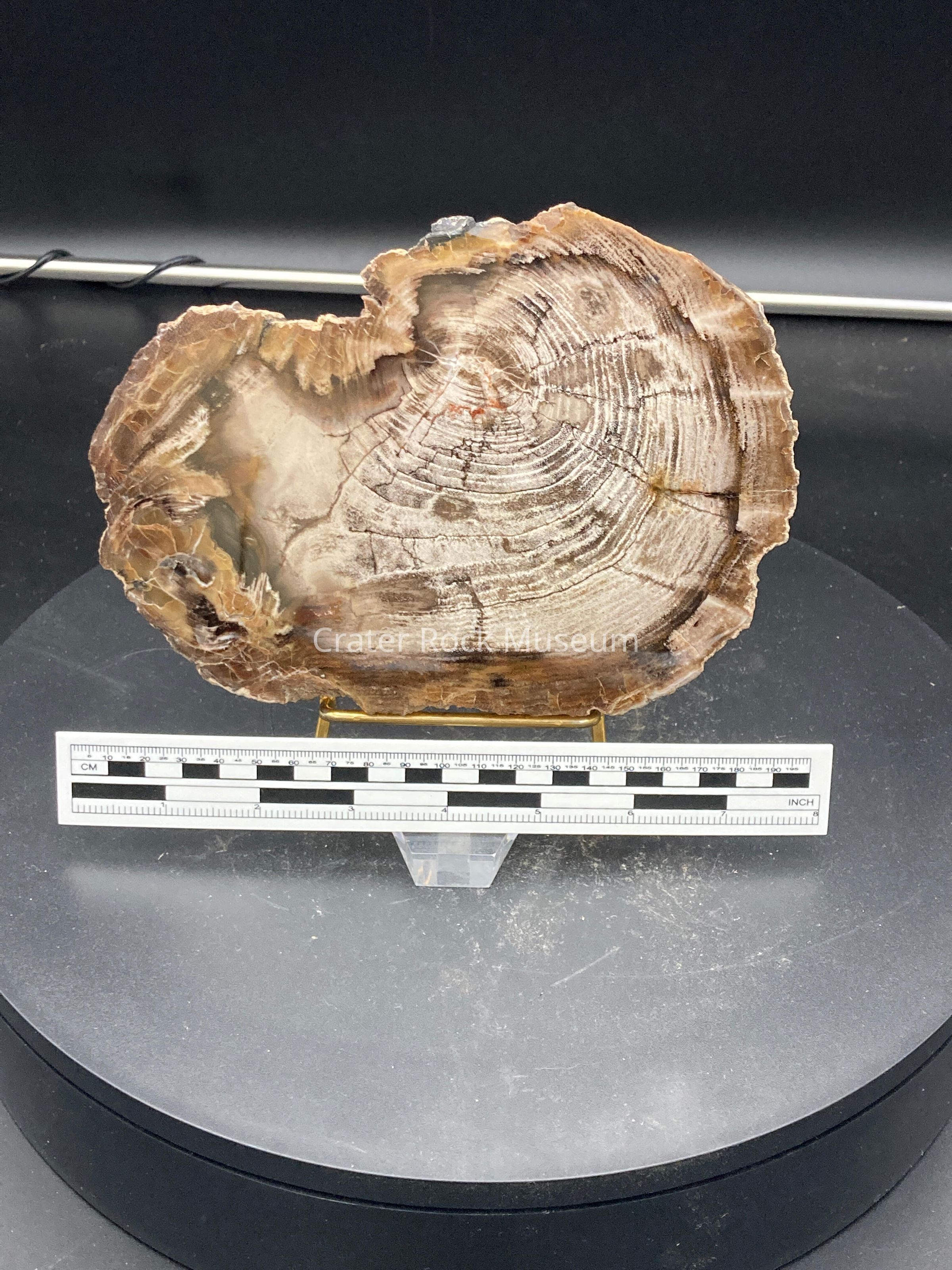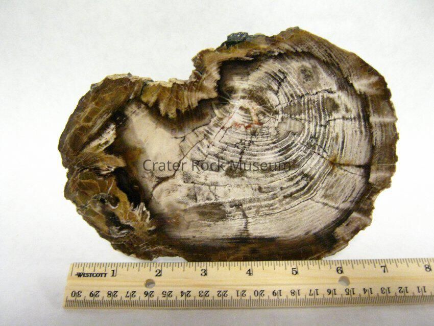Description: Thick slab with polished face. Polished side shows wood in white, creams, tans, browns, black with traces of red. Growth rings are distinct. One side contains a circular wood area, possiby a knot.