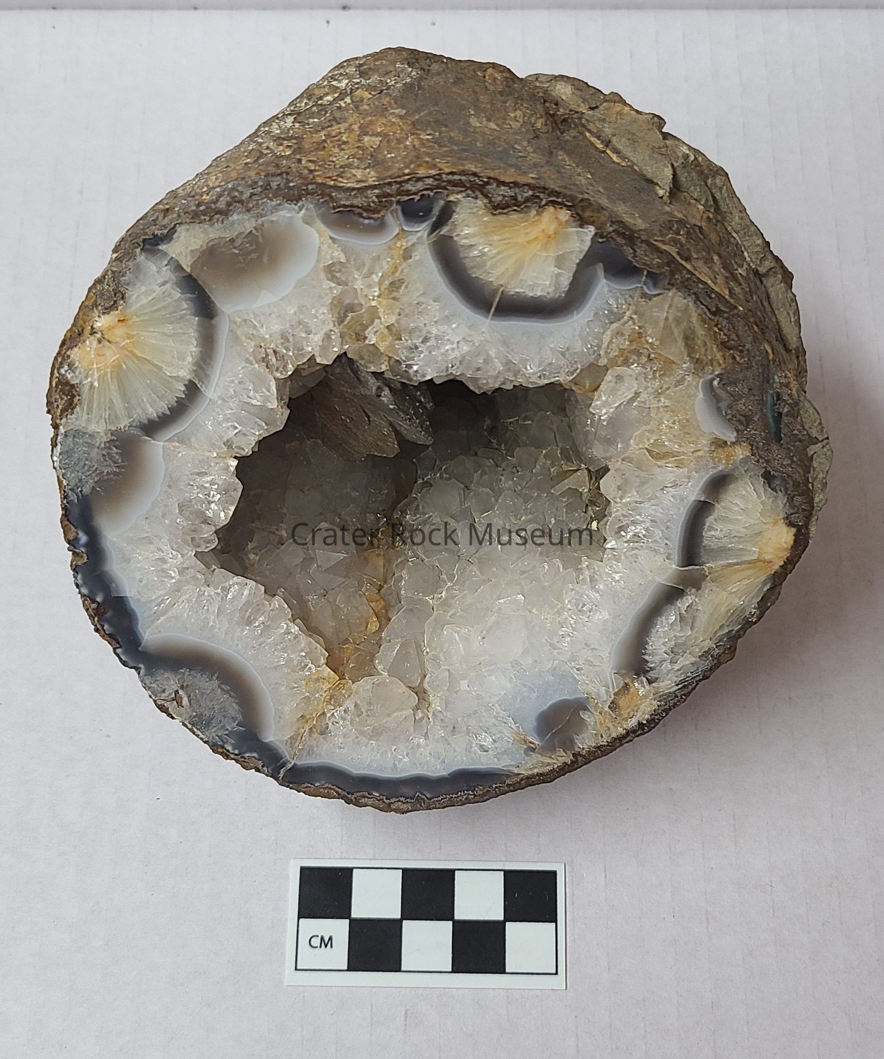 A Nodule from Red Mountain, North of Ellensburg, WA. Polished side shows a large open Crystalline center in White and some Yellow. A protruding piece of another mineral in Grey is found in center. Surrounding rock is in Whites, Greys and Blues in small Fan-like designs around center. Outer rock is in Brown.Dimensions