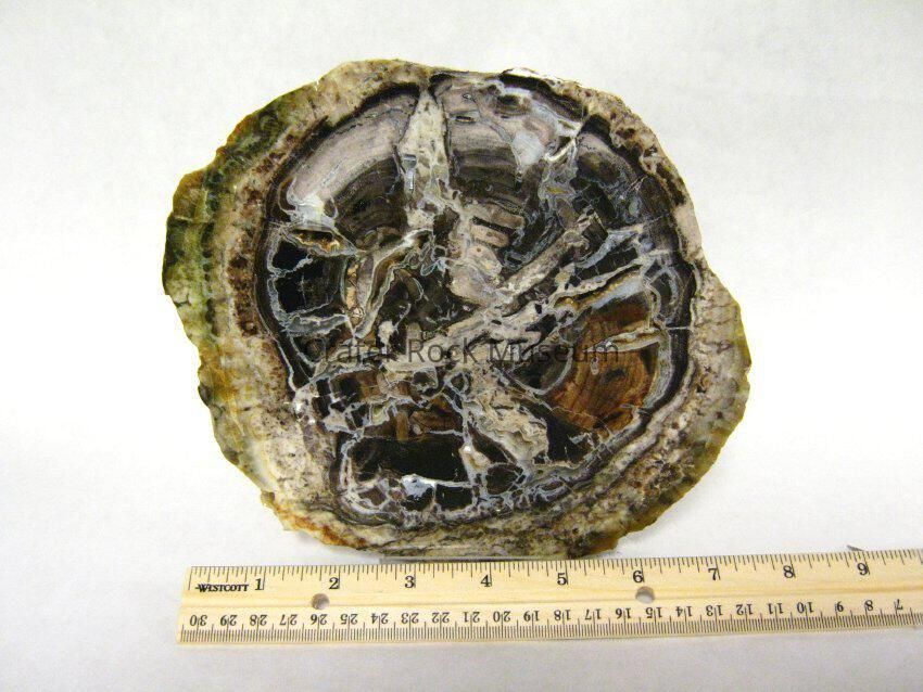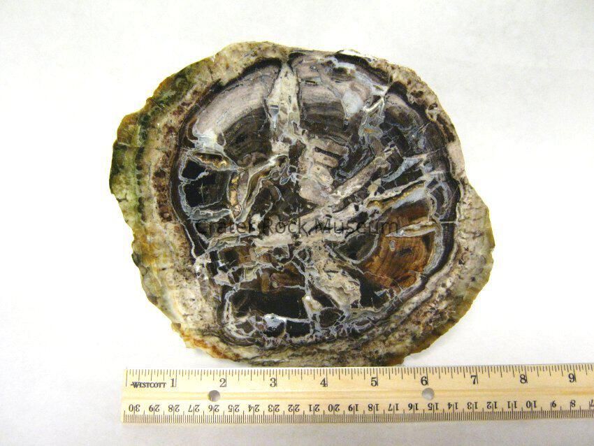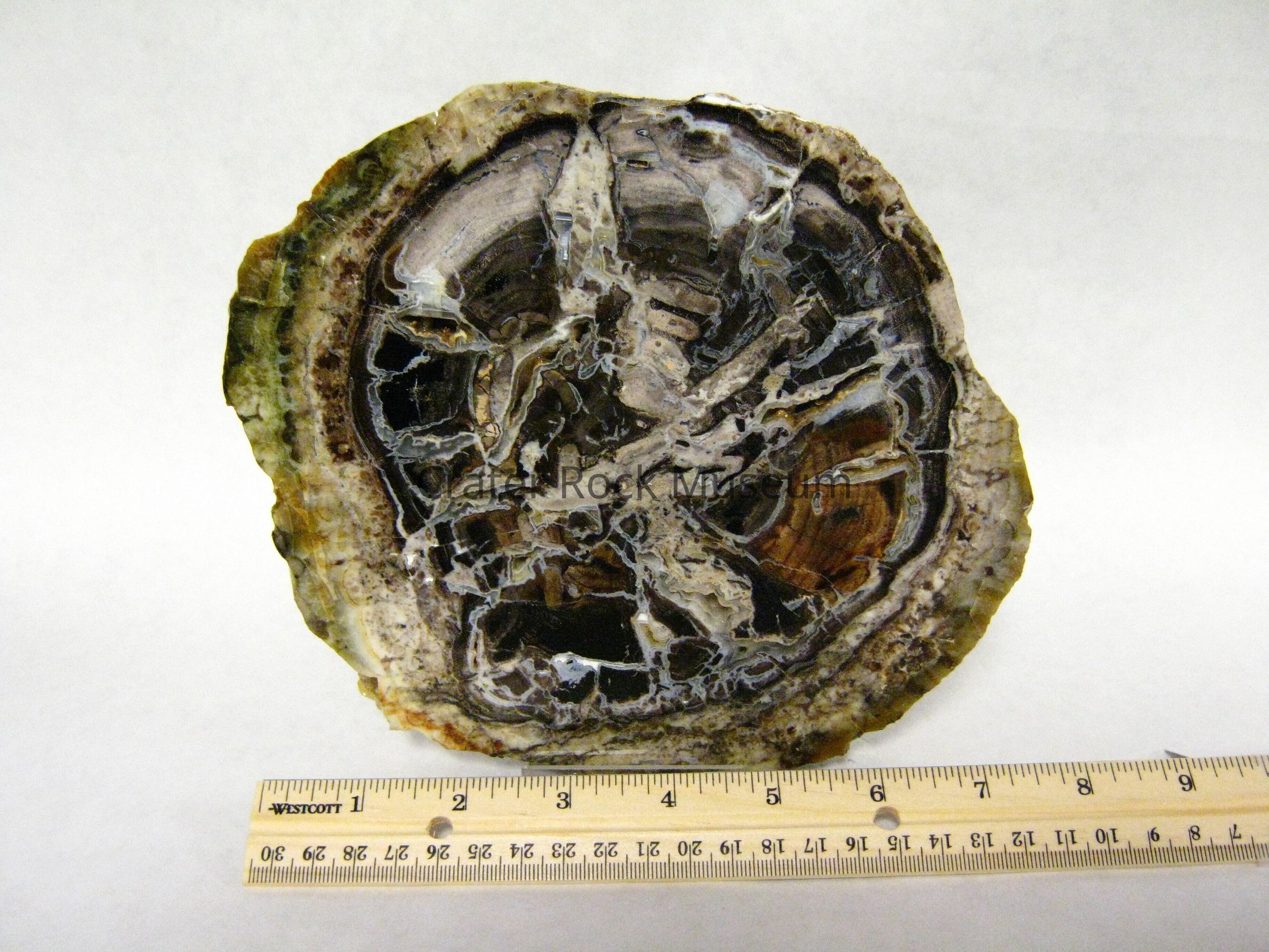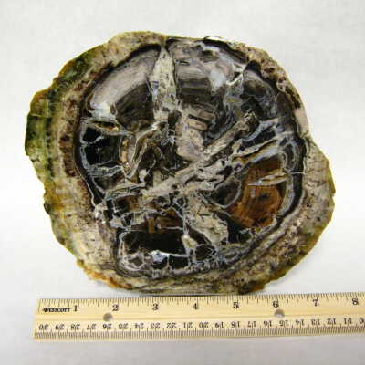 Description: Thick slab with polished face. Beige, green, brown and tan thick outer band with a segmented inner area with black, grey, tan and reddish-brown. Growth rings are visible.