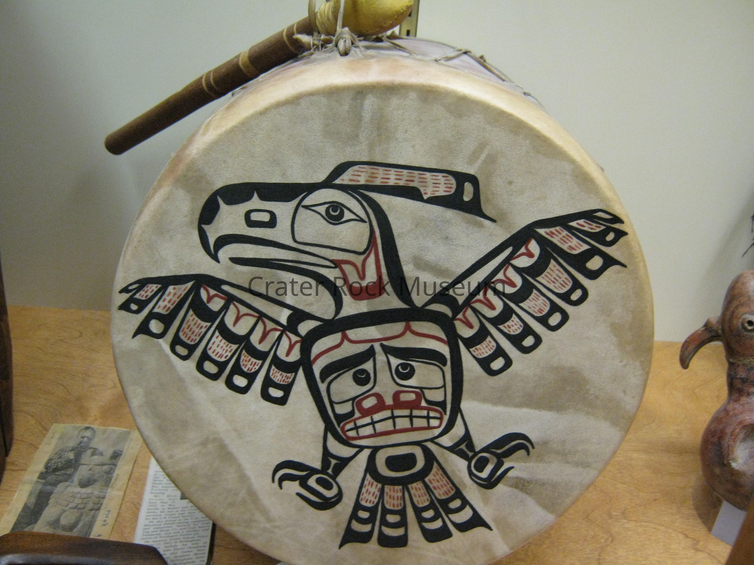 Description: Large painted drum orange base, tan with black and red drawingsCollection