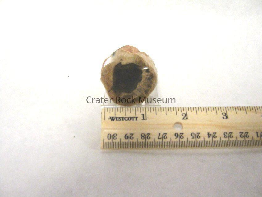 Description: Small, short branch, reddish-orange on the outside with tan, beige and black outer band with a dark spot in the center. Growth rings are visible on outer band.