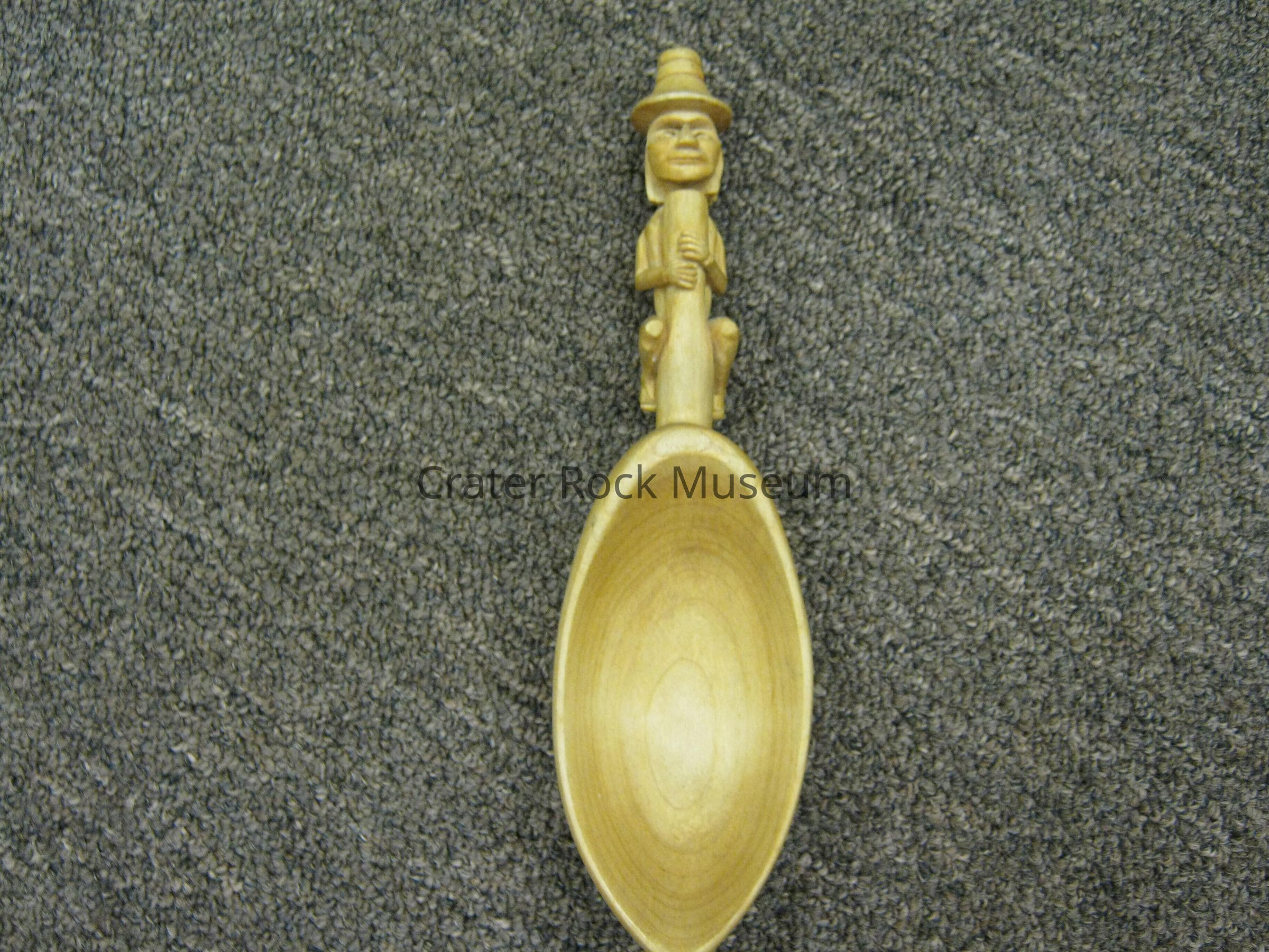 Description: A carved wooden spoon 10" long with a little man carved into the handleCollection
