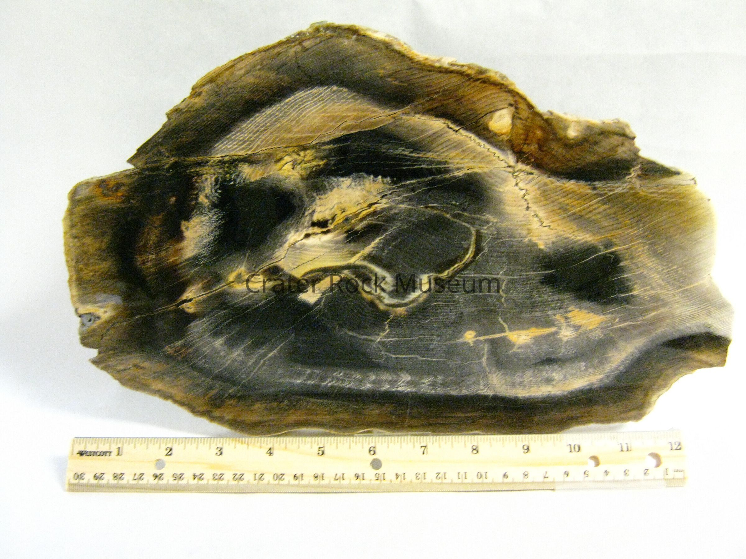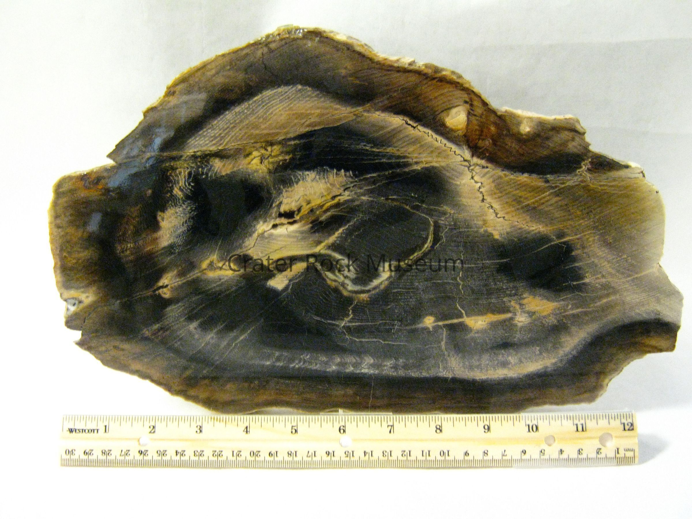 Description: Thin slab with polished face. Thick beige and tan outer band with a light tan, beige, creamy yellow and black inner area. Growth rings are visible.