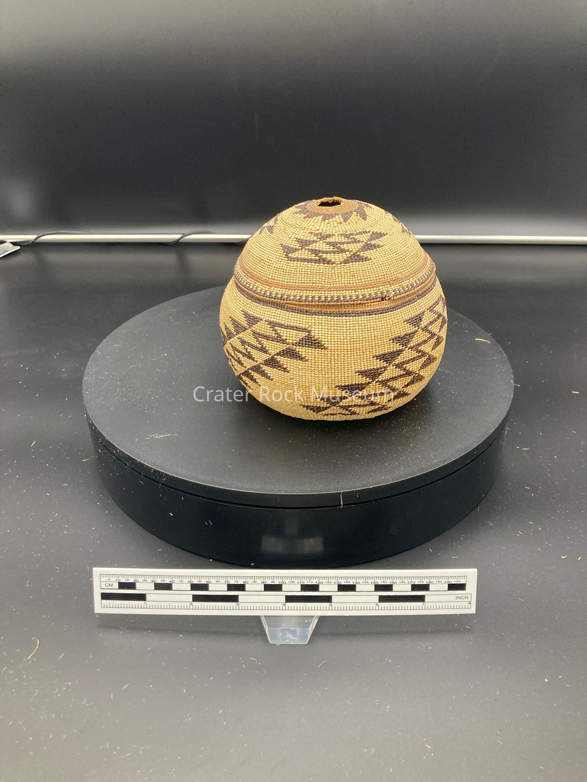 Description: Small brown woven basket with black pattern around itCollection