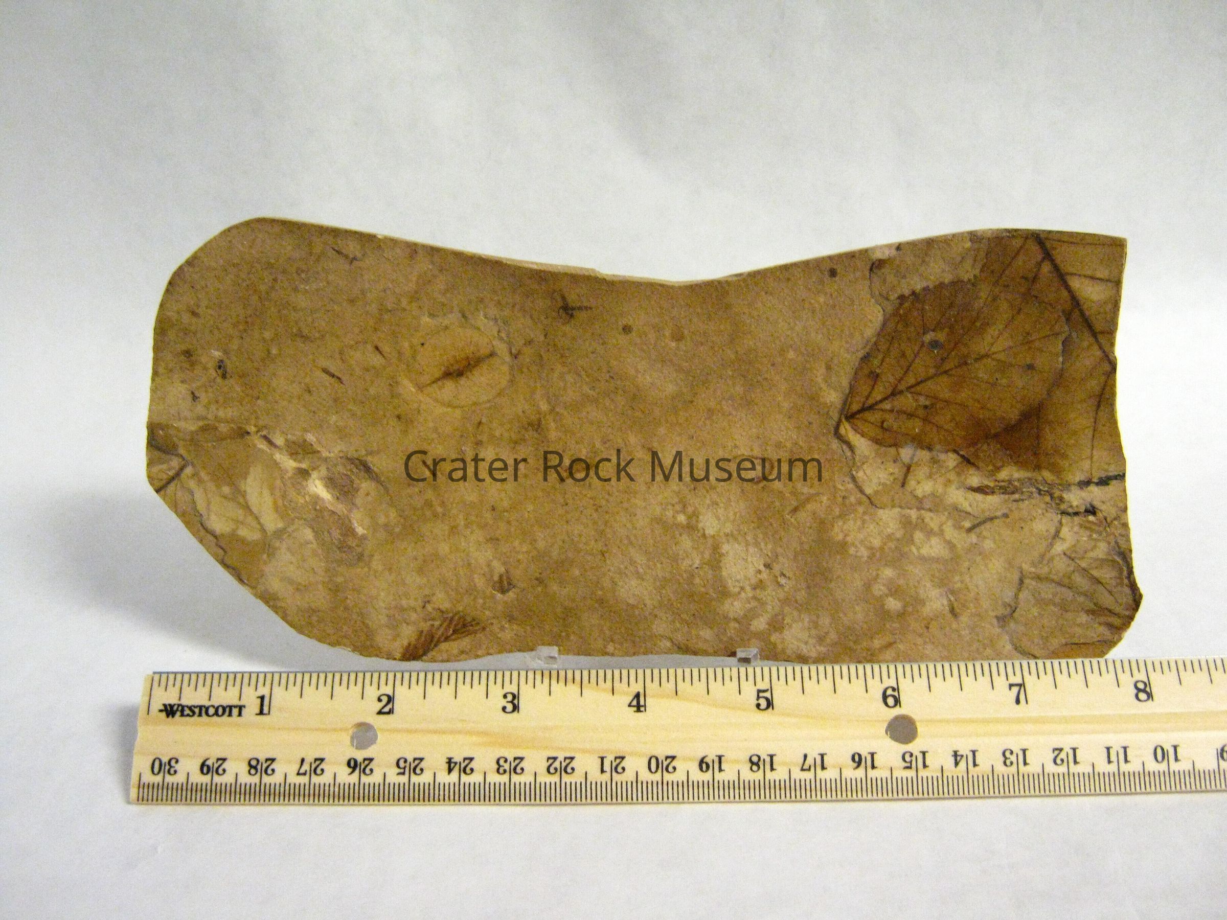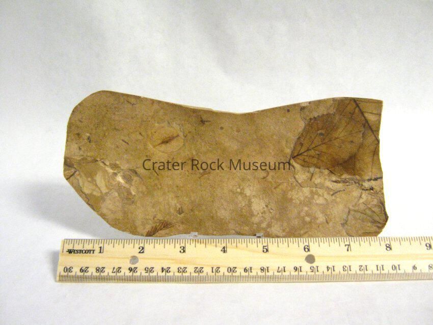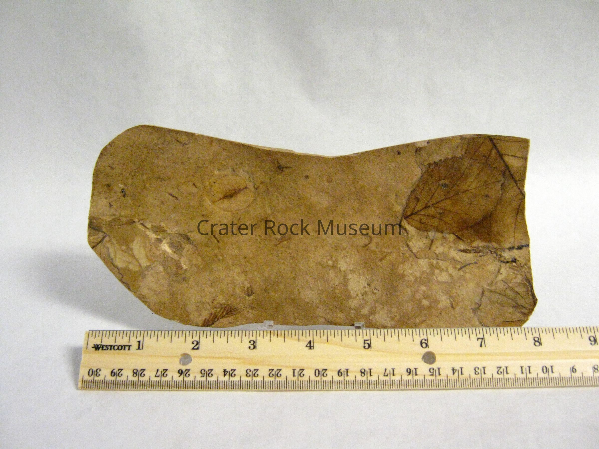 Light brown and tan base rock with three distinct fossil leaf impressions (two in upper right are Betula; third is Craigia?), a fruit/seed (Craigia oregonensis), stem and branch fragments (Metasequoia), and conifer needles (Metasequoia).