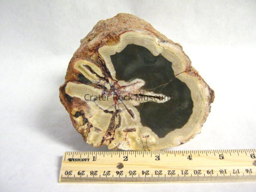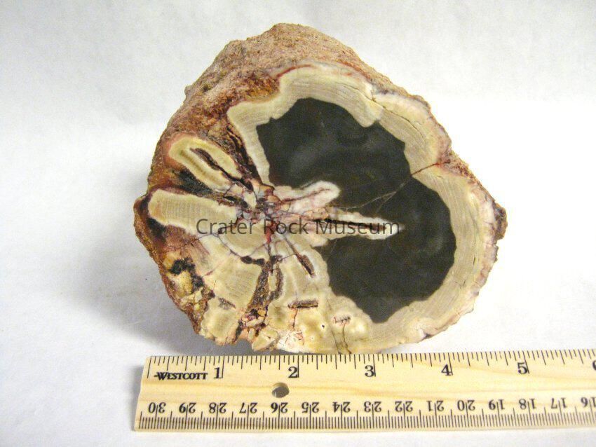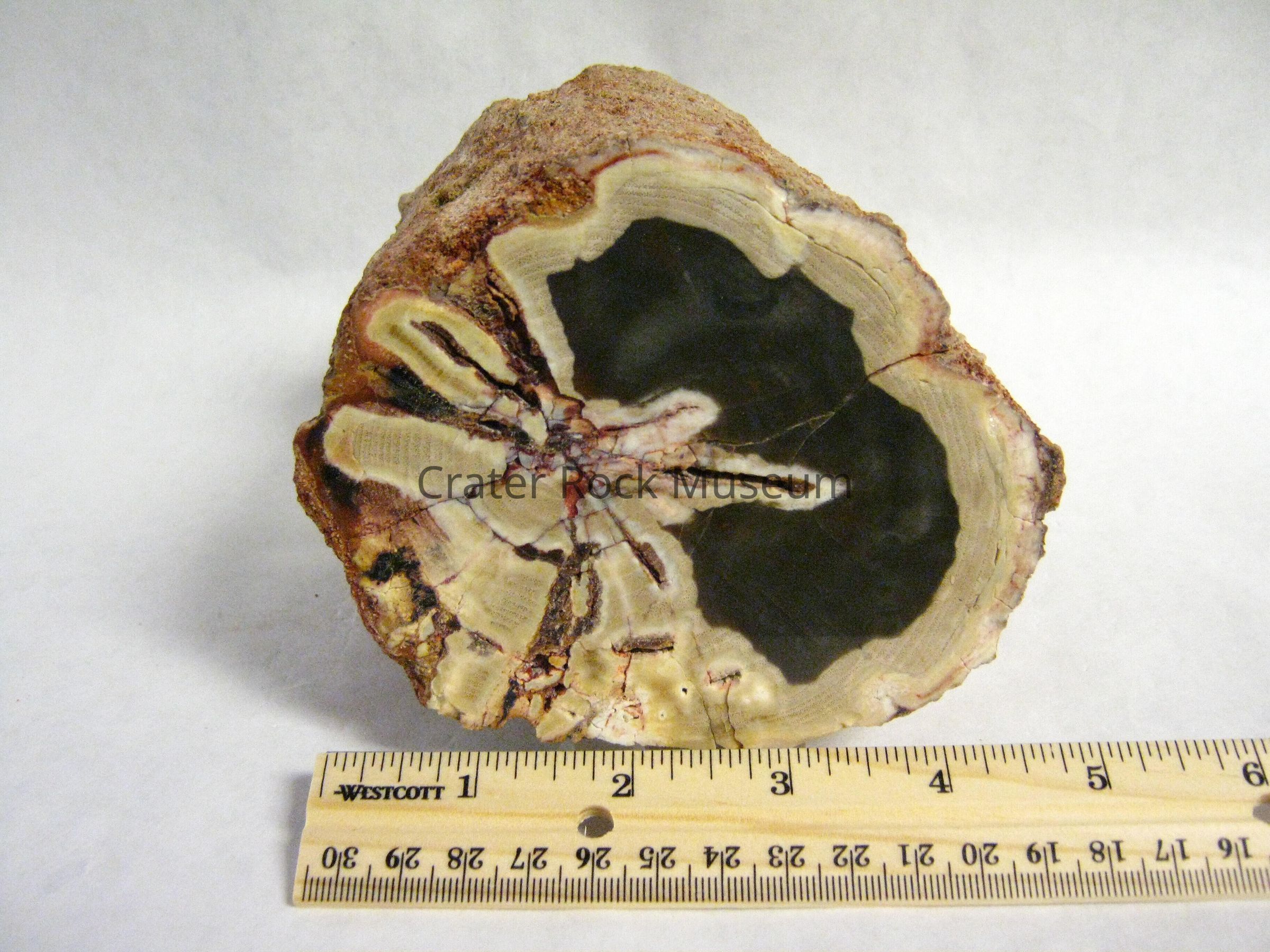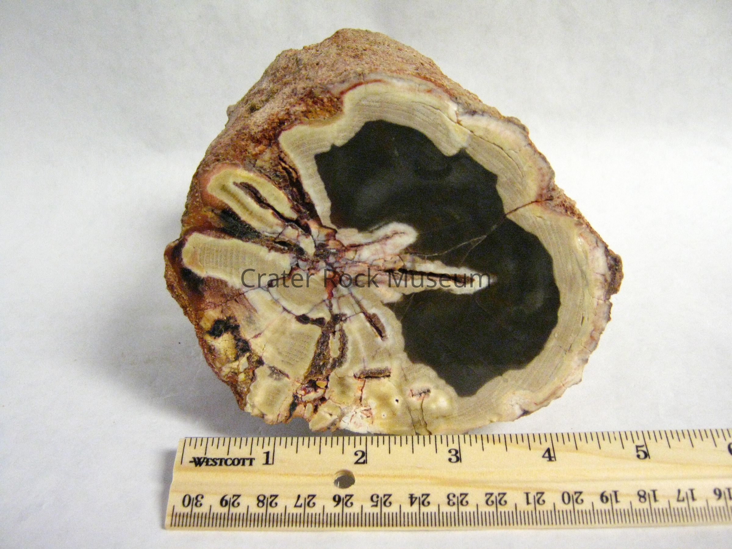 Occurrence: Silicified wood, which is the fossilization and opalization of organic woody matter by the deposition of SiO2 in a anaerobic environment to prevent decay. This means that the wood must somehow be buried in an oxygen free enviroment, possibly in the silt-laden river or the bottom of a lake or buried by volcanic ash or related volcanic mudflow. The organic material in the wood is then replaced by silica (SiO2), other minerals determined its colors.