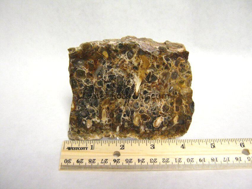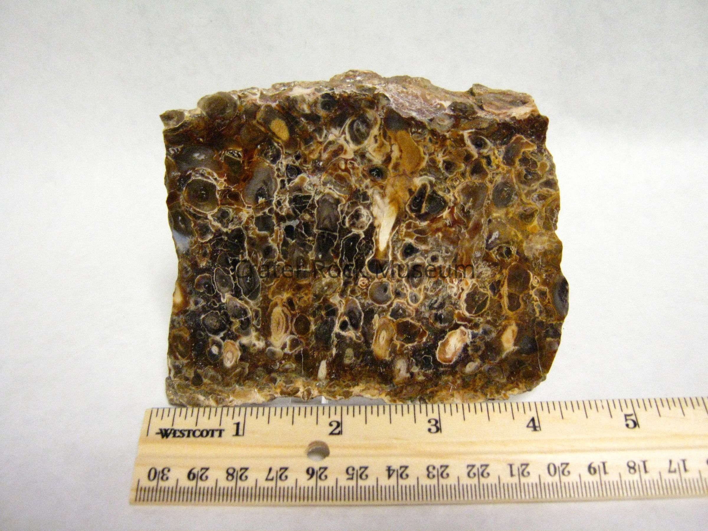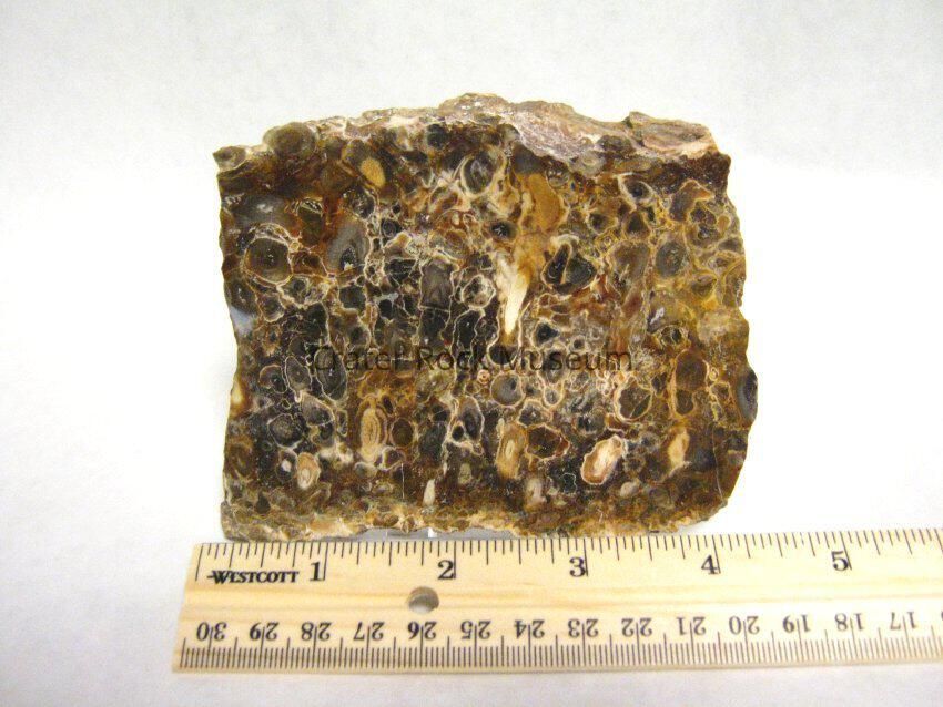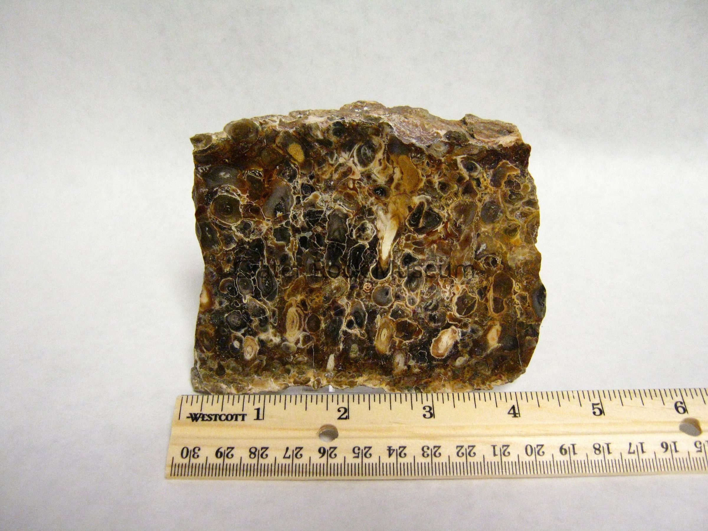 Description: Thin slab with polished face. Entire face shows "plant bundles" of varying colors from white, brown, grey and black.