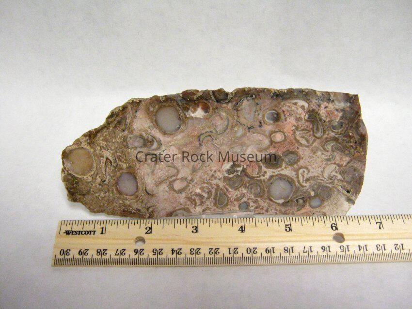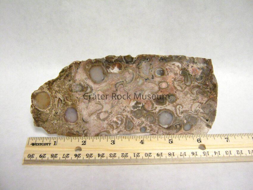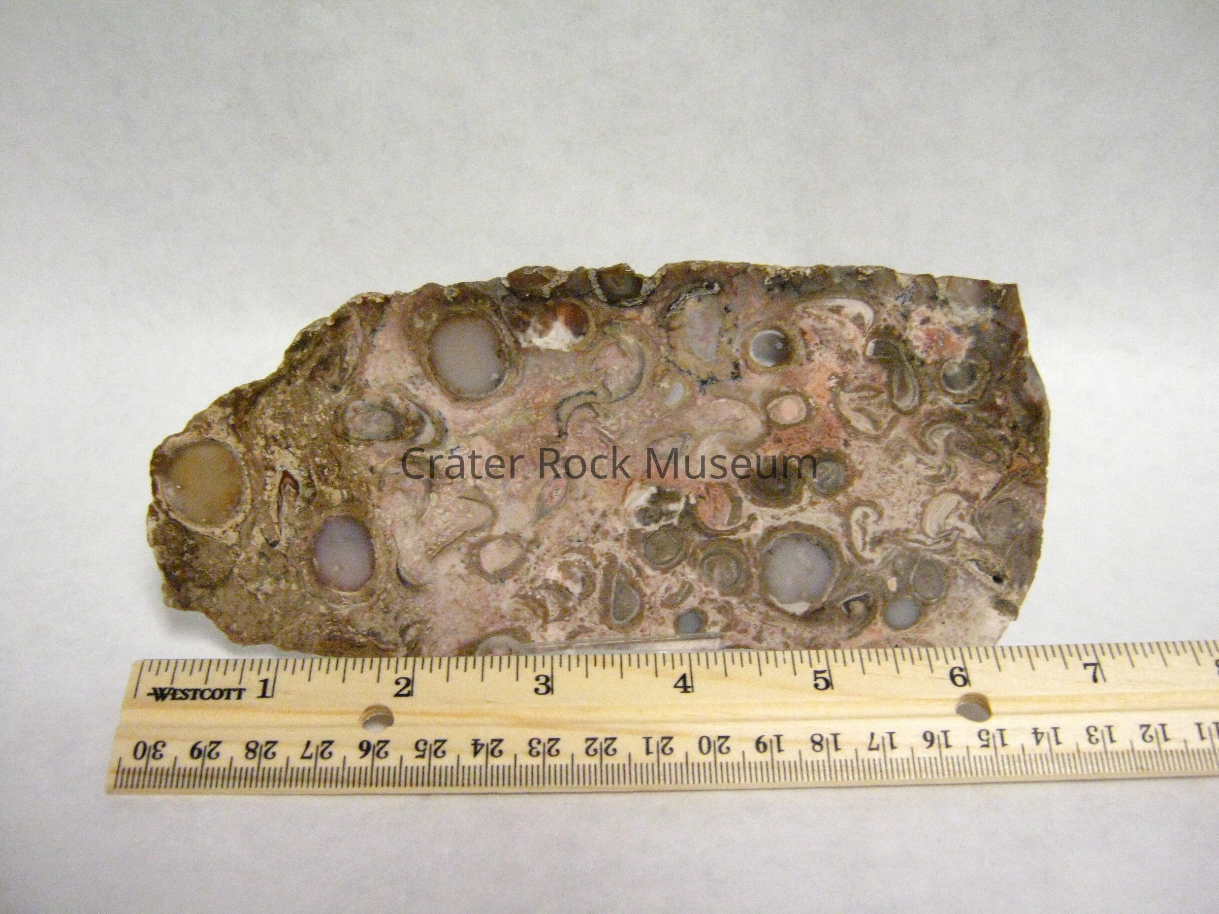 Description: Thick, roughly rectangular slice of petrified wood, polished on both sides. Coloring is pink,brown and grey with balls of agate and eyes in grey and brown.