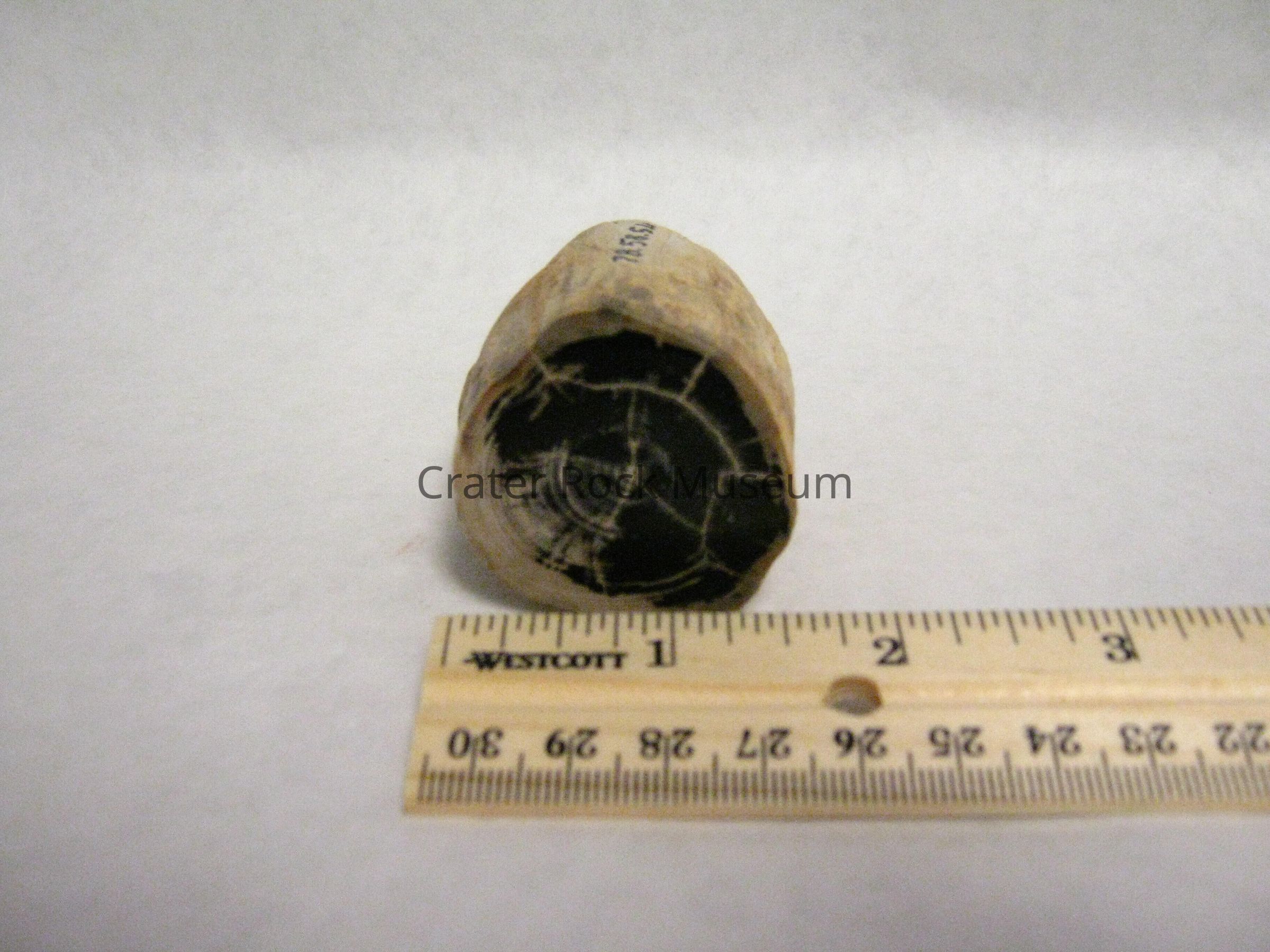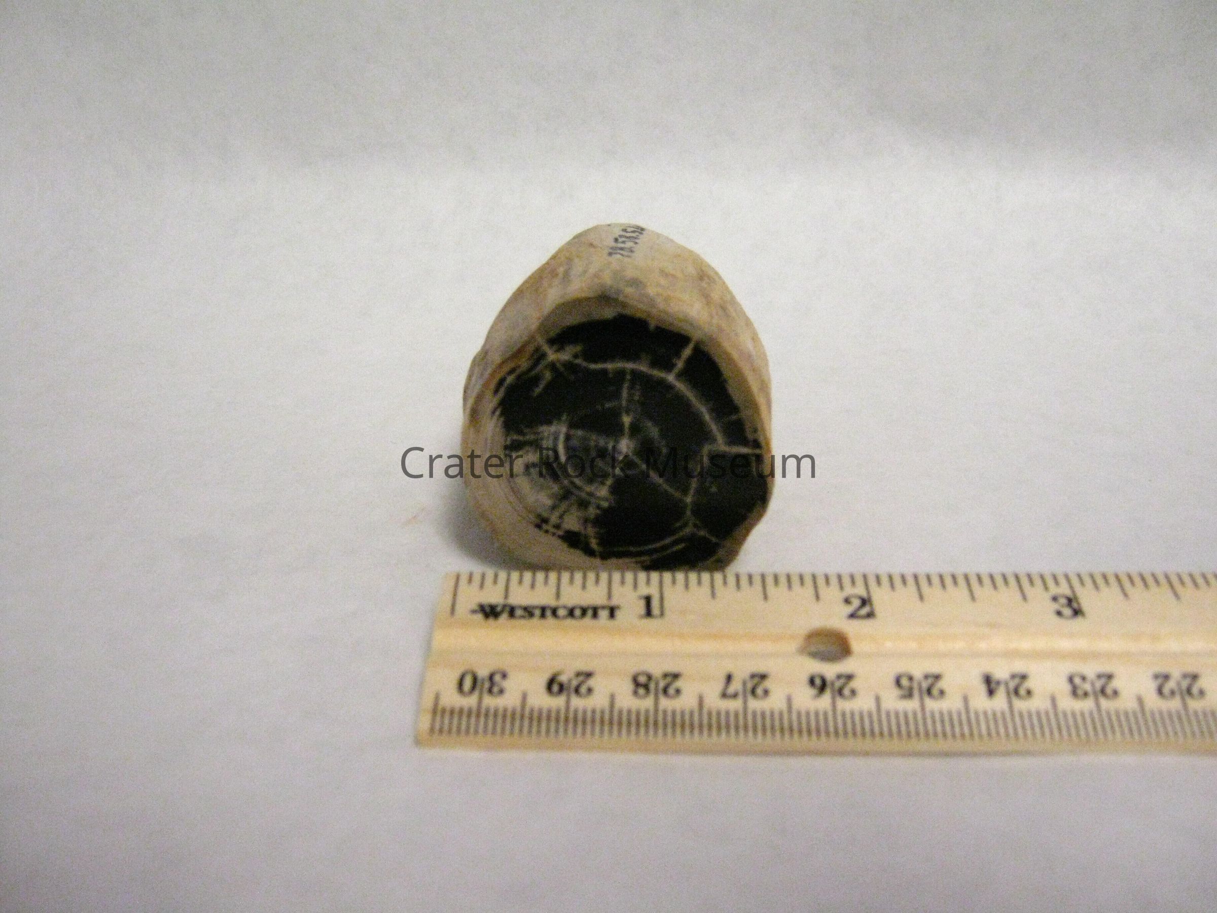 Description: Complete round, tan on the outside, blue-clear botryoidal agate on uncut face; cut face, black and white after bleaching. Tramatic resin cracks (from frost damage) on several outer growth rings.( per Doug Foster)
