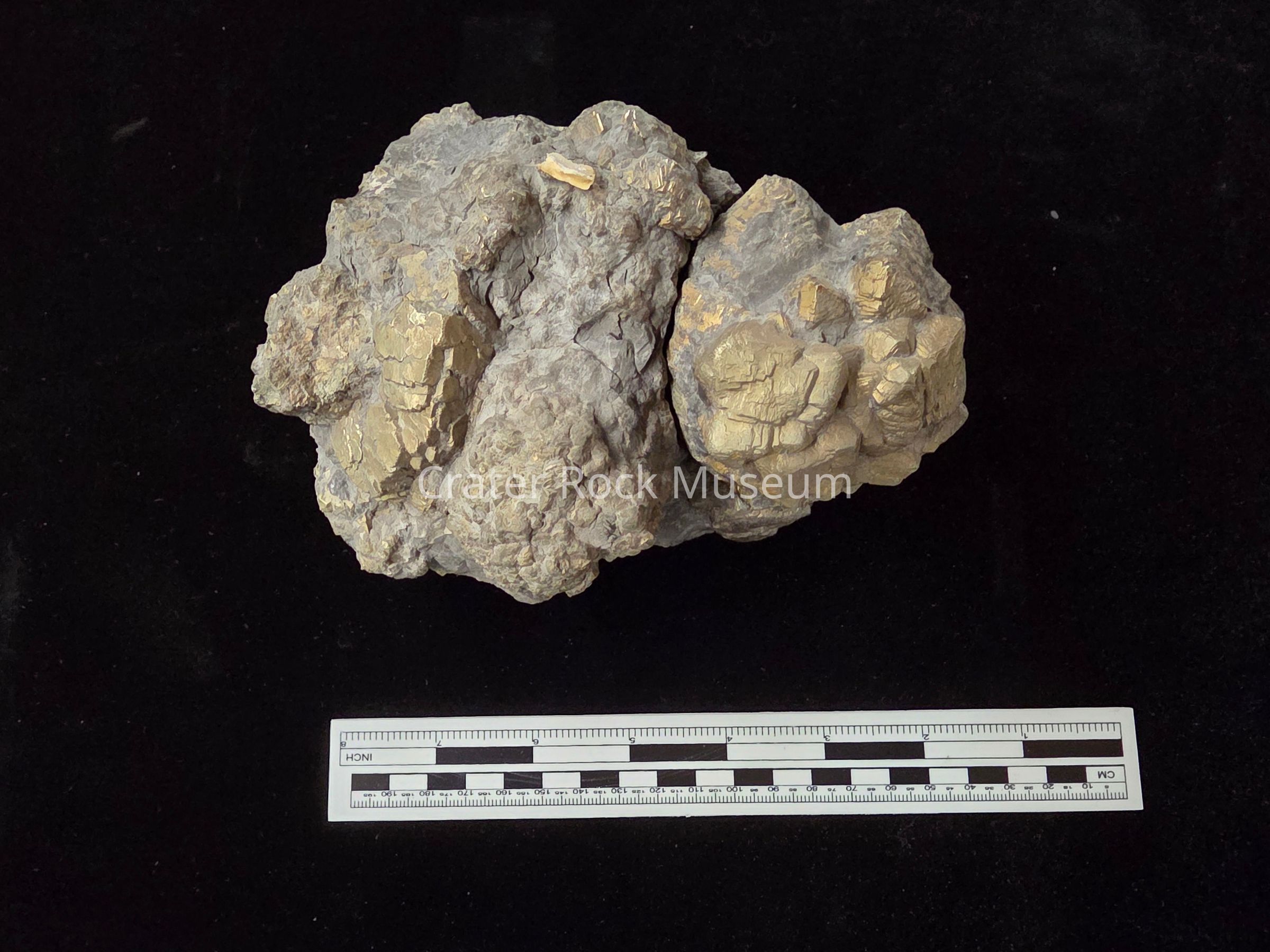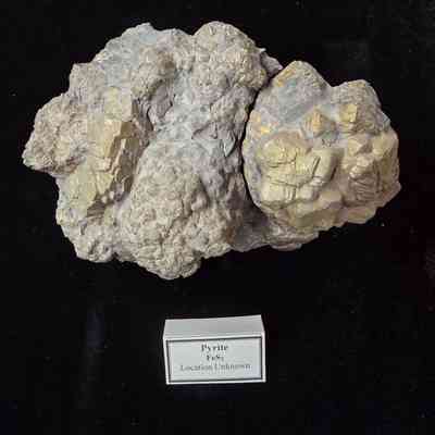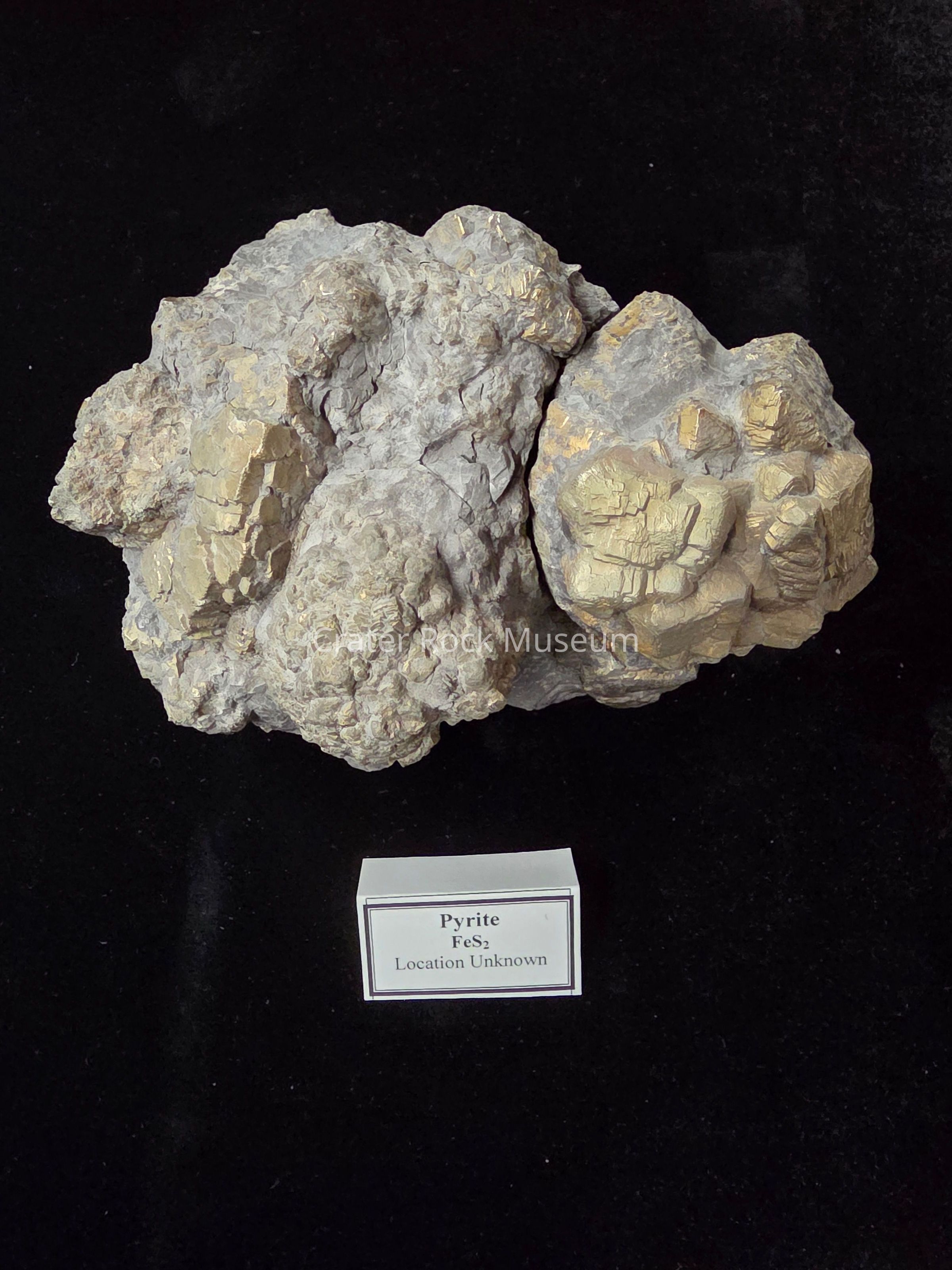 Pyrite on matrix on pale grey matrix. It has been treated to prevent degradation and the spread of pyrite disease.Location