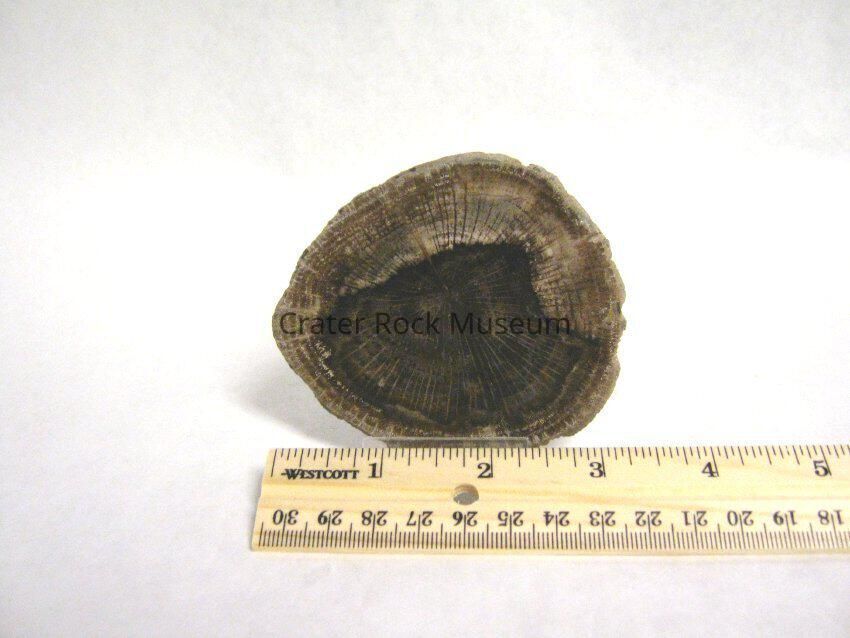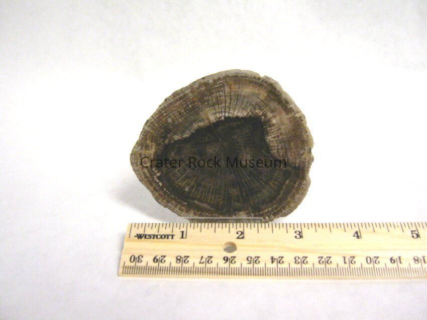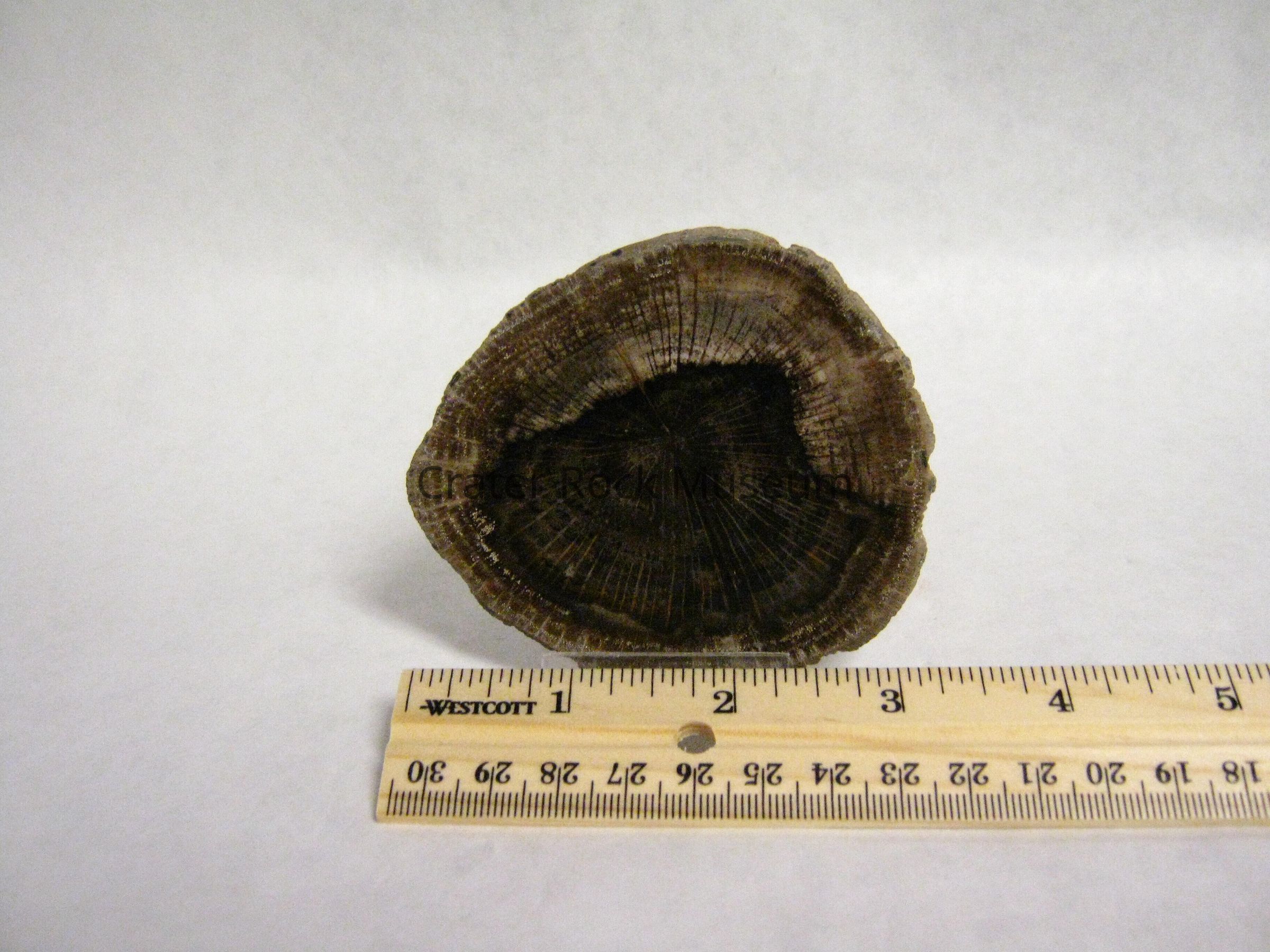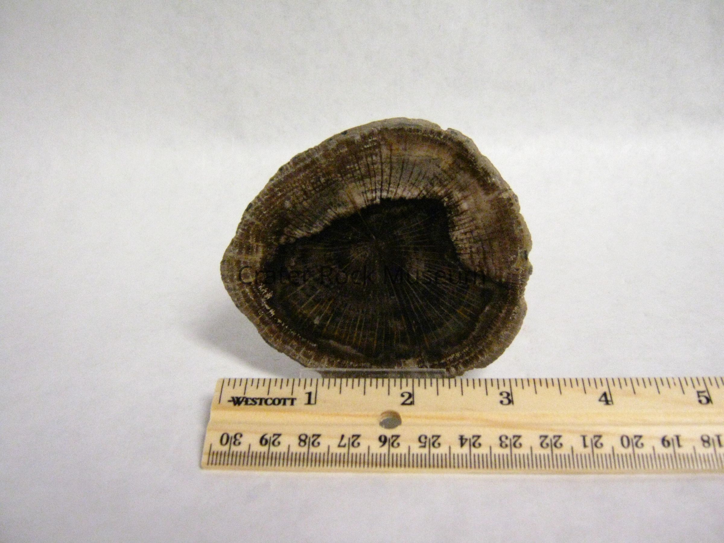 Description: Thin slab with polished face. Grey, tan and brown in bands on outer areas with a dark brown spot towards the inner area. Streaking visible in a burst pattern coming from the center outwards.