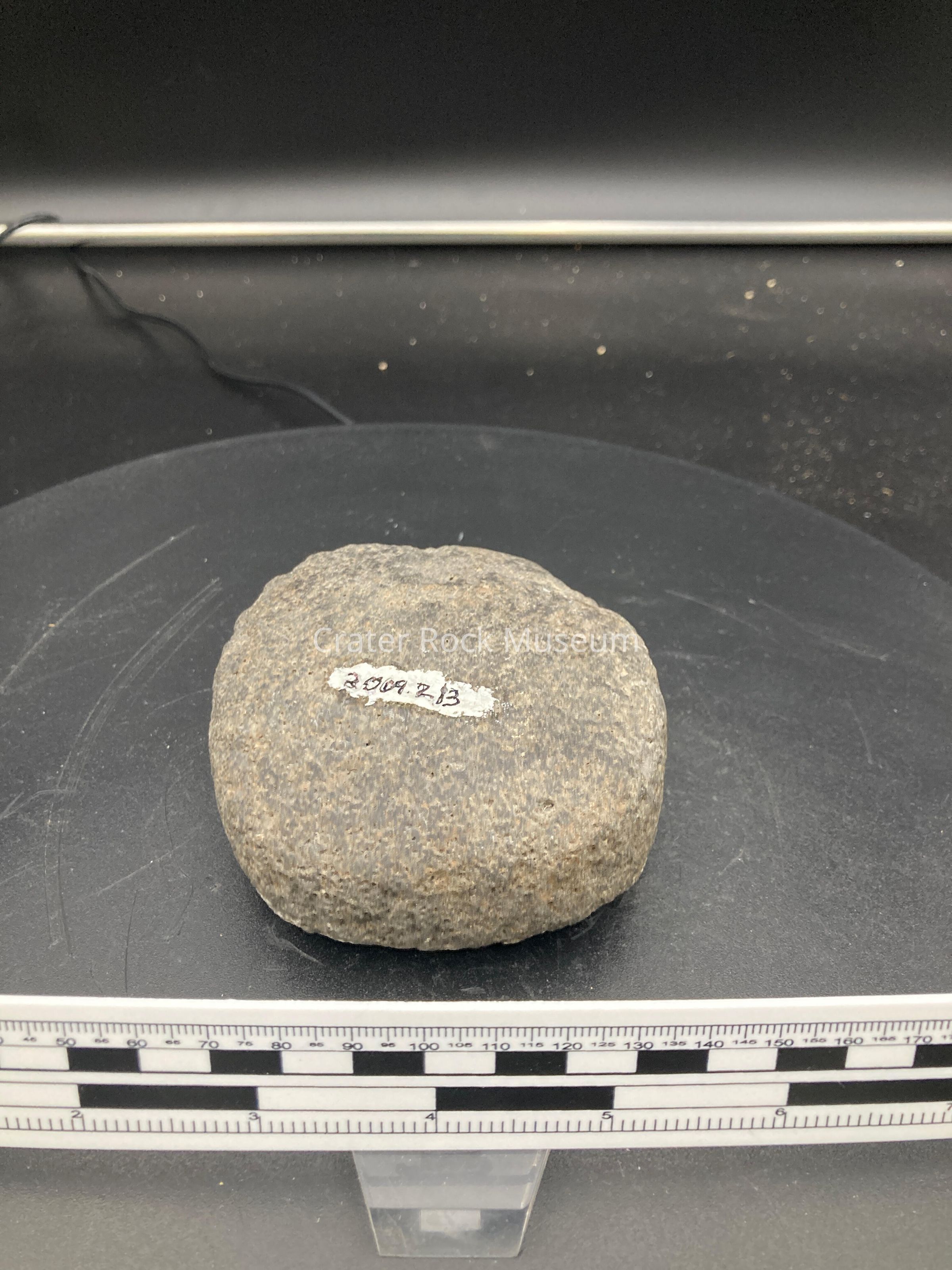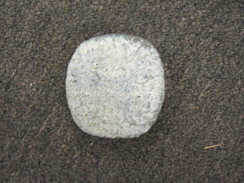 Description: Flat rounded stone with white on top grey on bottom. Desert Manos.