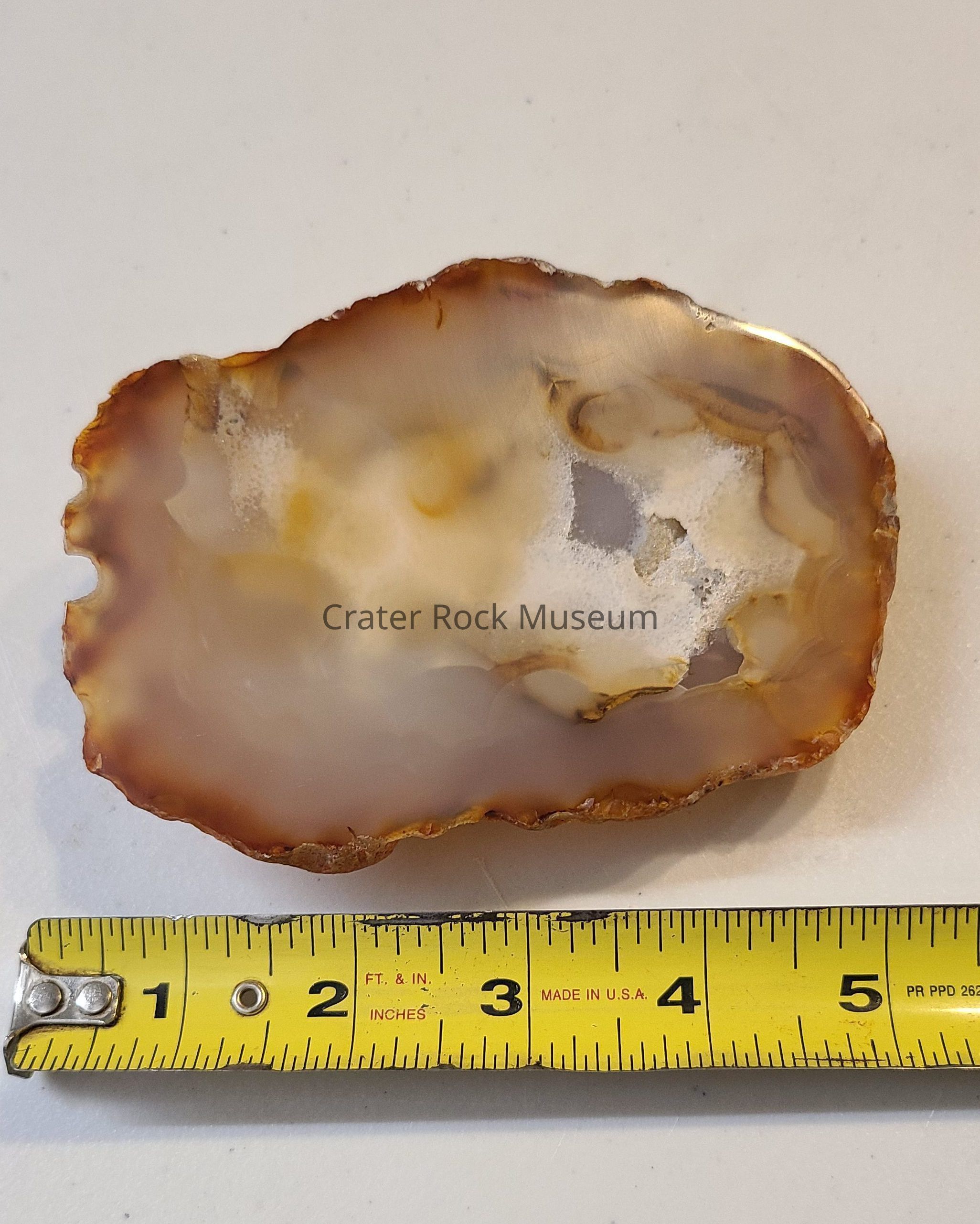 An Agate from Bear Creek, Jackson County, OR. Polished side shows a blotched Agate in porous White, Yellow, Brown and Grey in a Grey semitransparent Agate with Carnelian edging. Surface of cut side shows orbital formation (when held at an angle to the light), referred to as Turtle Back.Dimensions