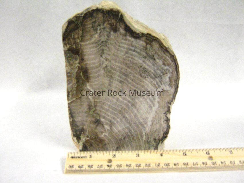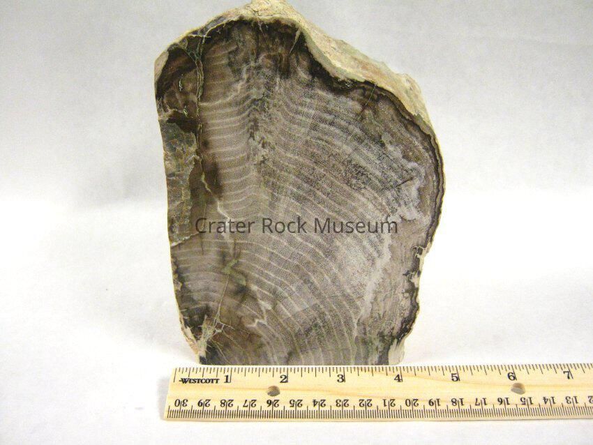 Description: A piece of petrified wood (Fig) from Barstow, California. Cut on three sides. Polished side show wood in greys, beiges, pinks and some green. Few surface cracks. Doug Foster says this specimen is from Last Chance Canyon, California.