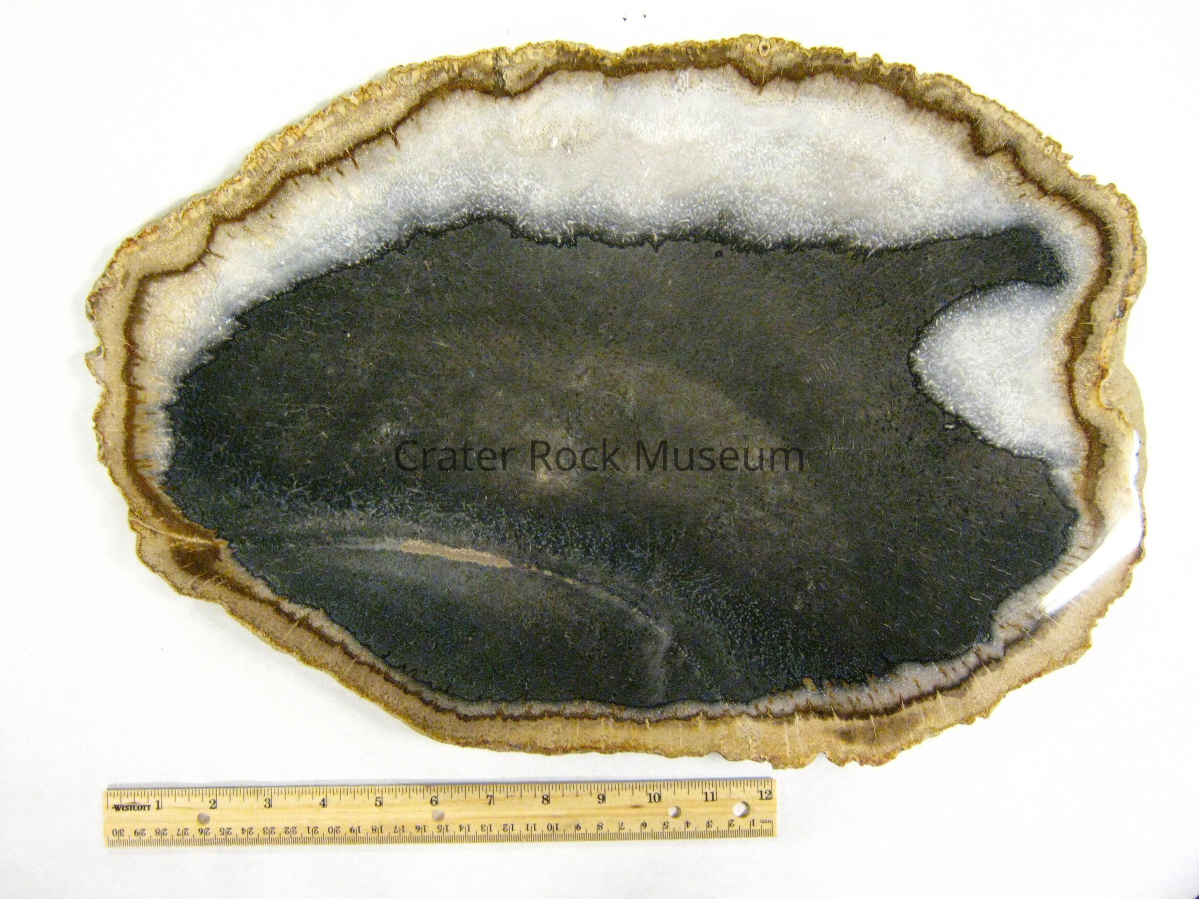 Occurrence: Silicified wood, which is the fossilization and opalization of organic woody matter by the deposition of SiO2 in a anaerobic environment to prevent decay. This means that the wood must somehow be buried in an oxygen free enviroment, possibly in the silt-laden river or the bottom of a lake or buried by volcanic ash or related volcanic mudflow. The organic material in the wood is then replaced by silica (SiO2), other minerals determined its colors.