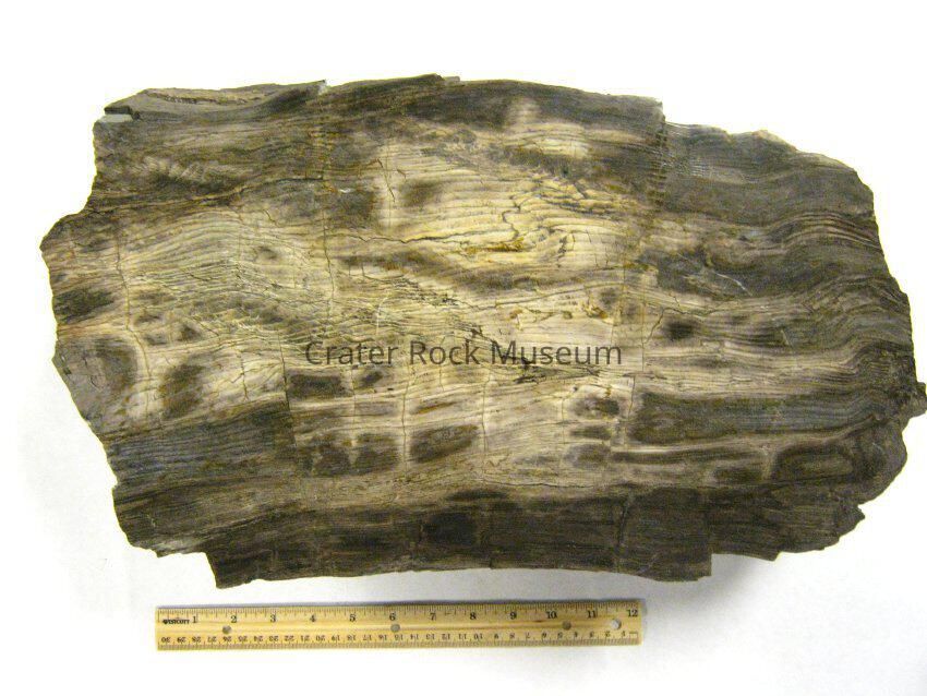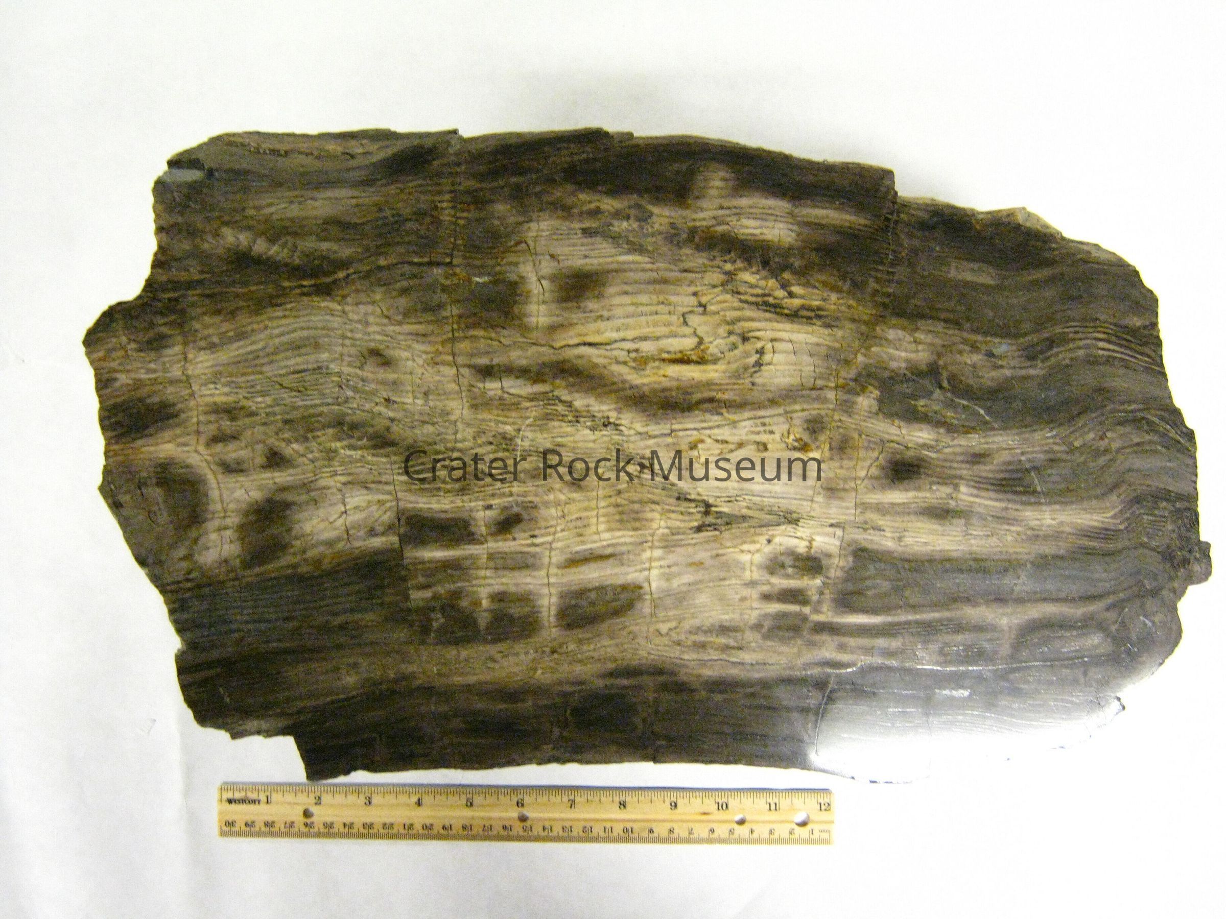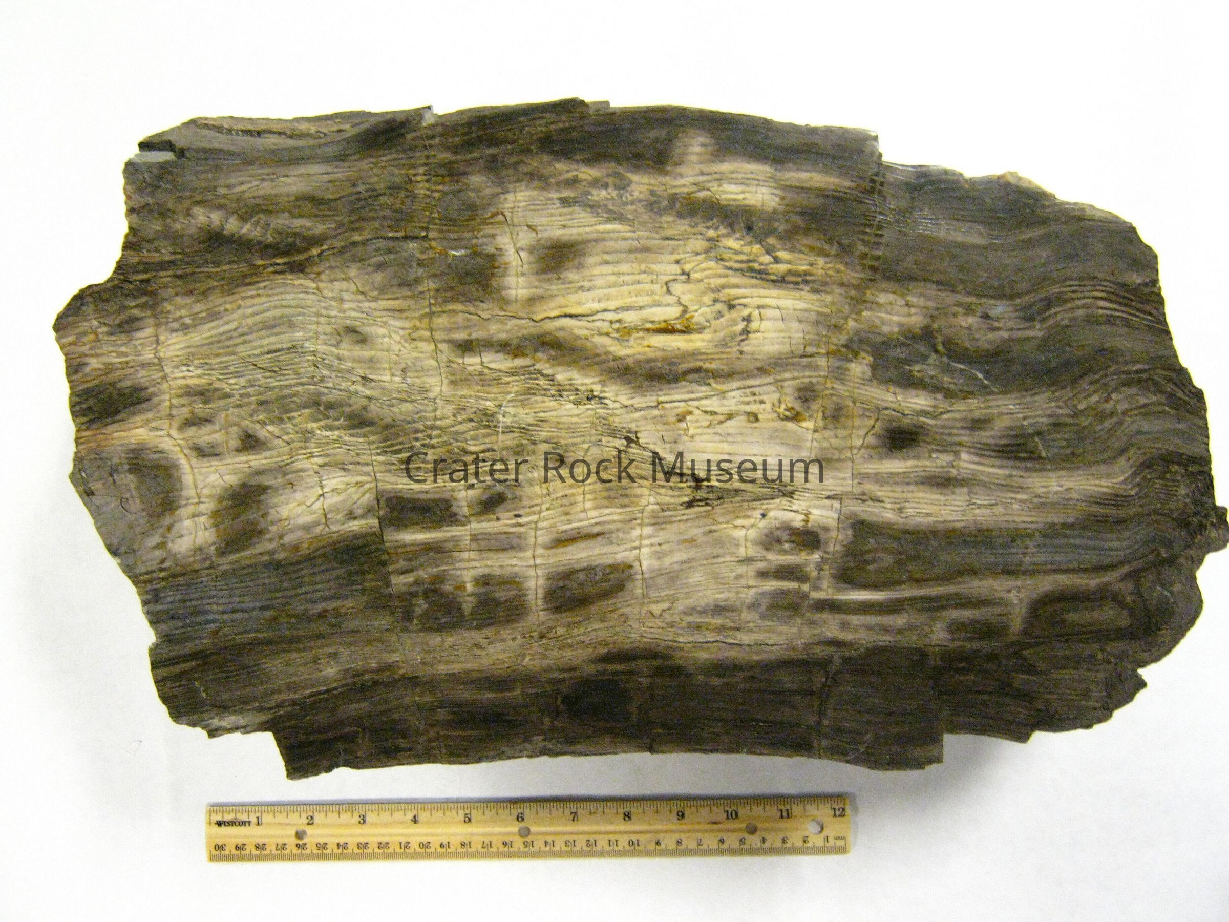 Description: Thick slab with polished face and rounded back. Dark and light greys on outer areas with dull yellows on the inner areas. Growth rings are visible.