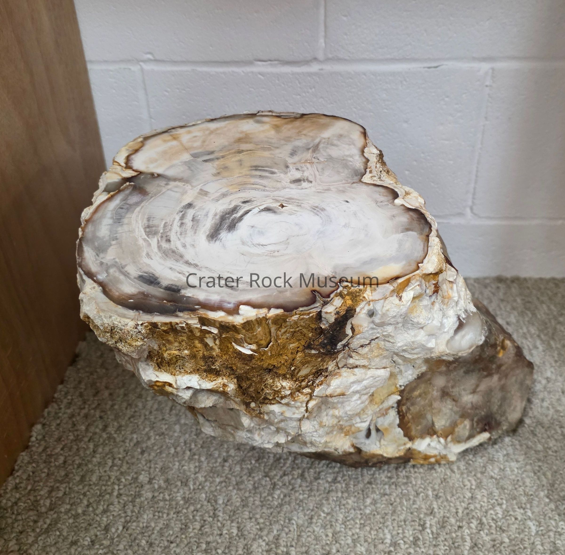 Description: Large stump (log) with a cut and polished face. Outer bark area has yellows, whites, browns and reddish -browns covering it. The face has a white and bluish-grey translucent pearlessence look, with some growth rings visible.