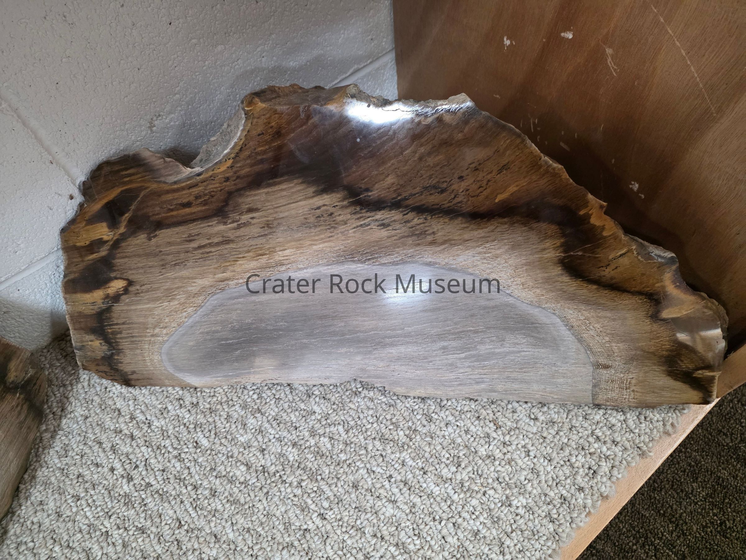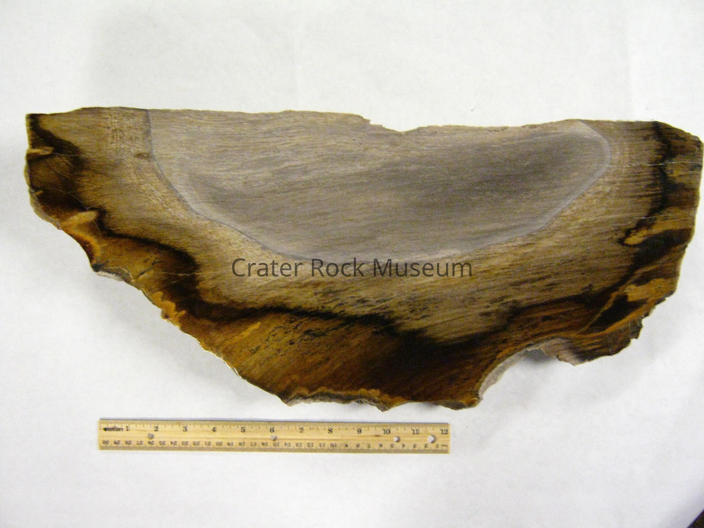 Description: Thin slab with polished face. A half-round specimen with dark and light reddish-brown outer edges and a distinct light greyish-brown center area with light striations. Some growth rings are visible.