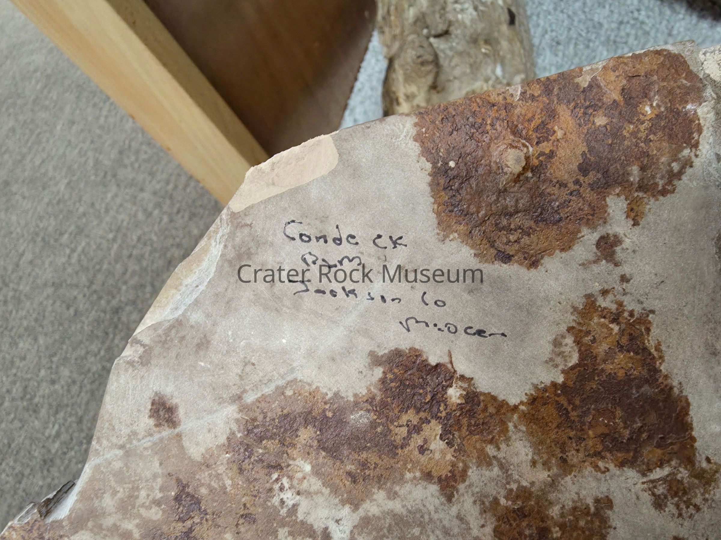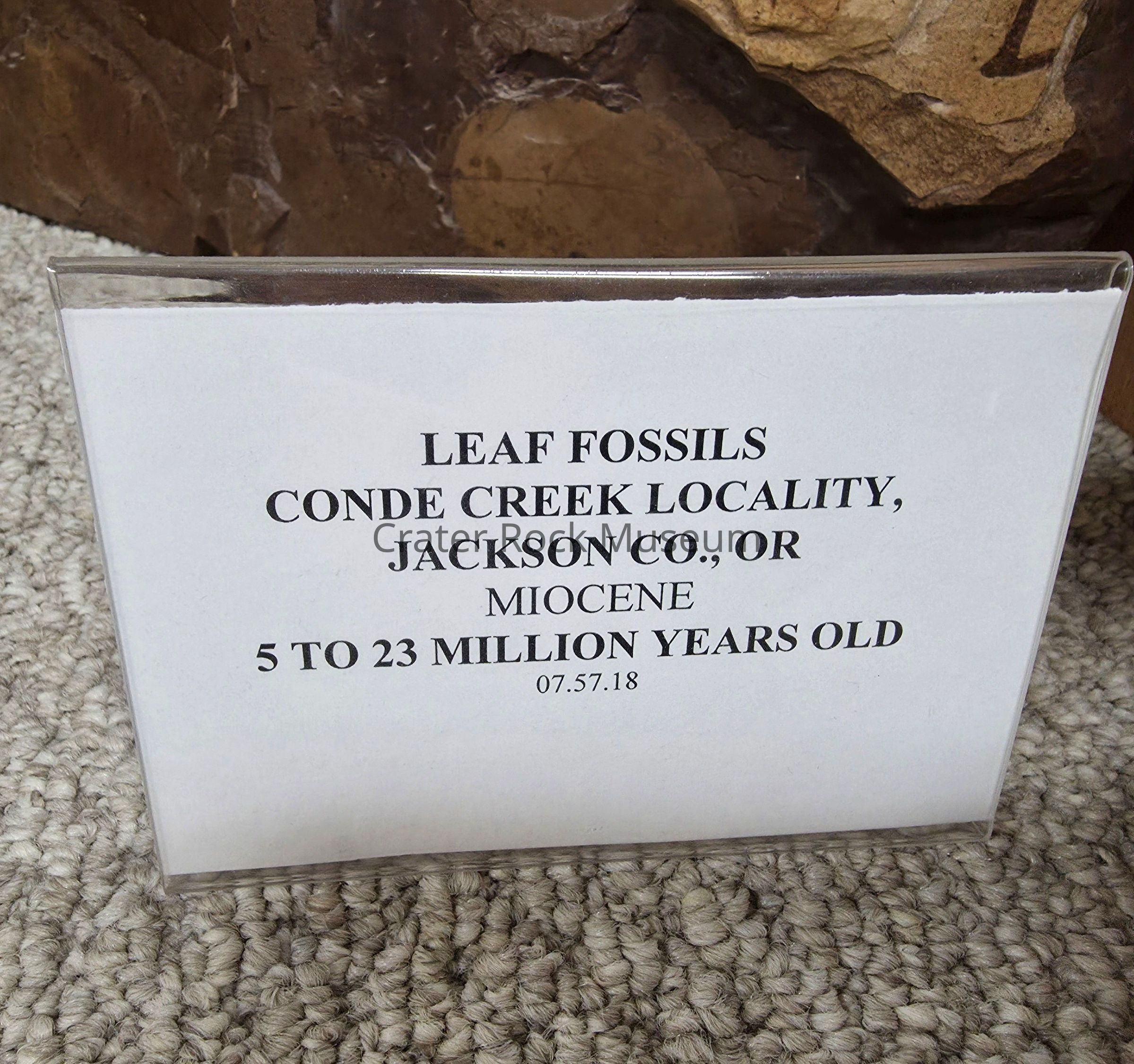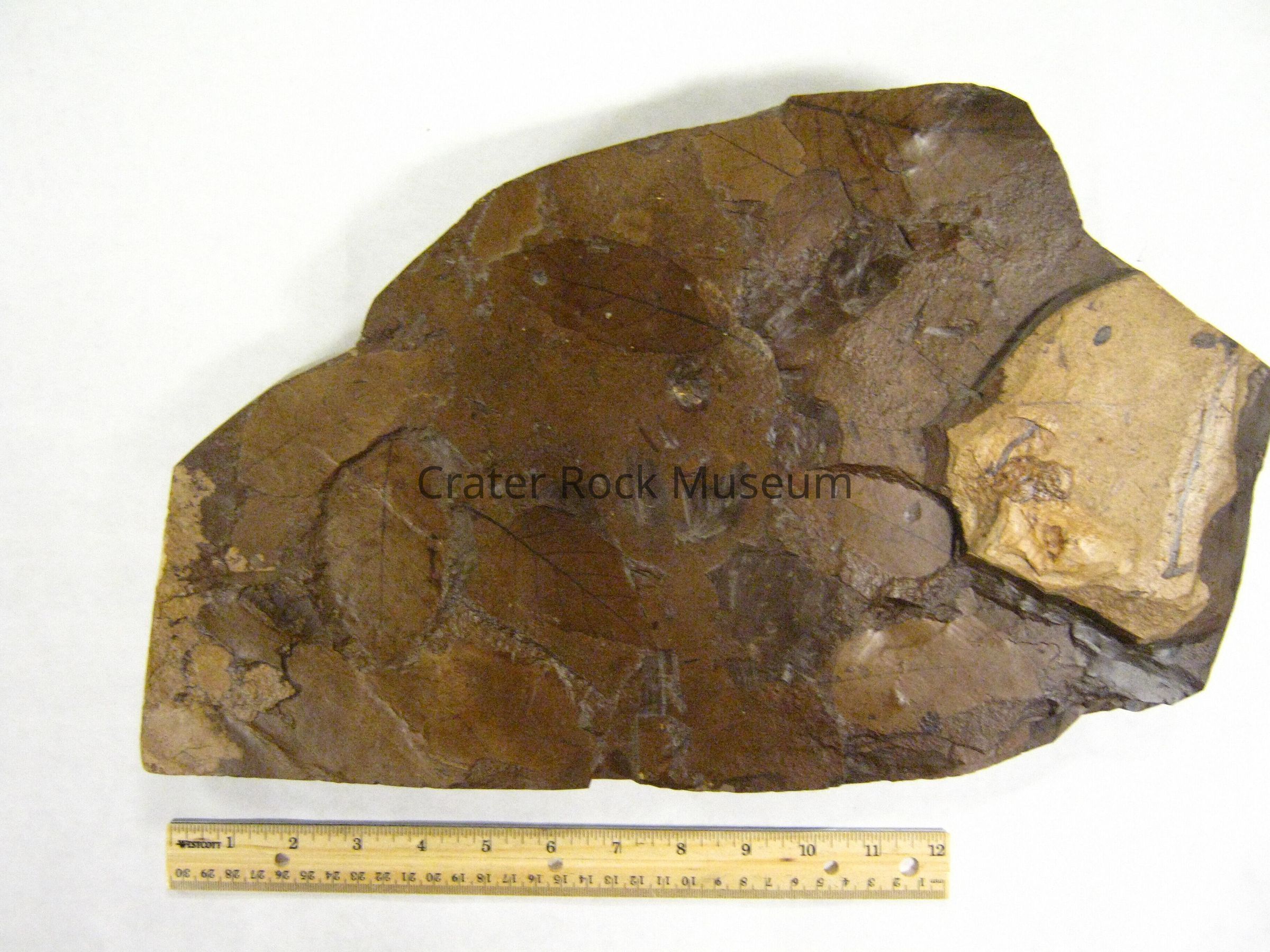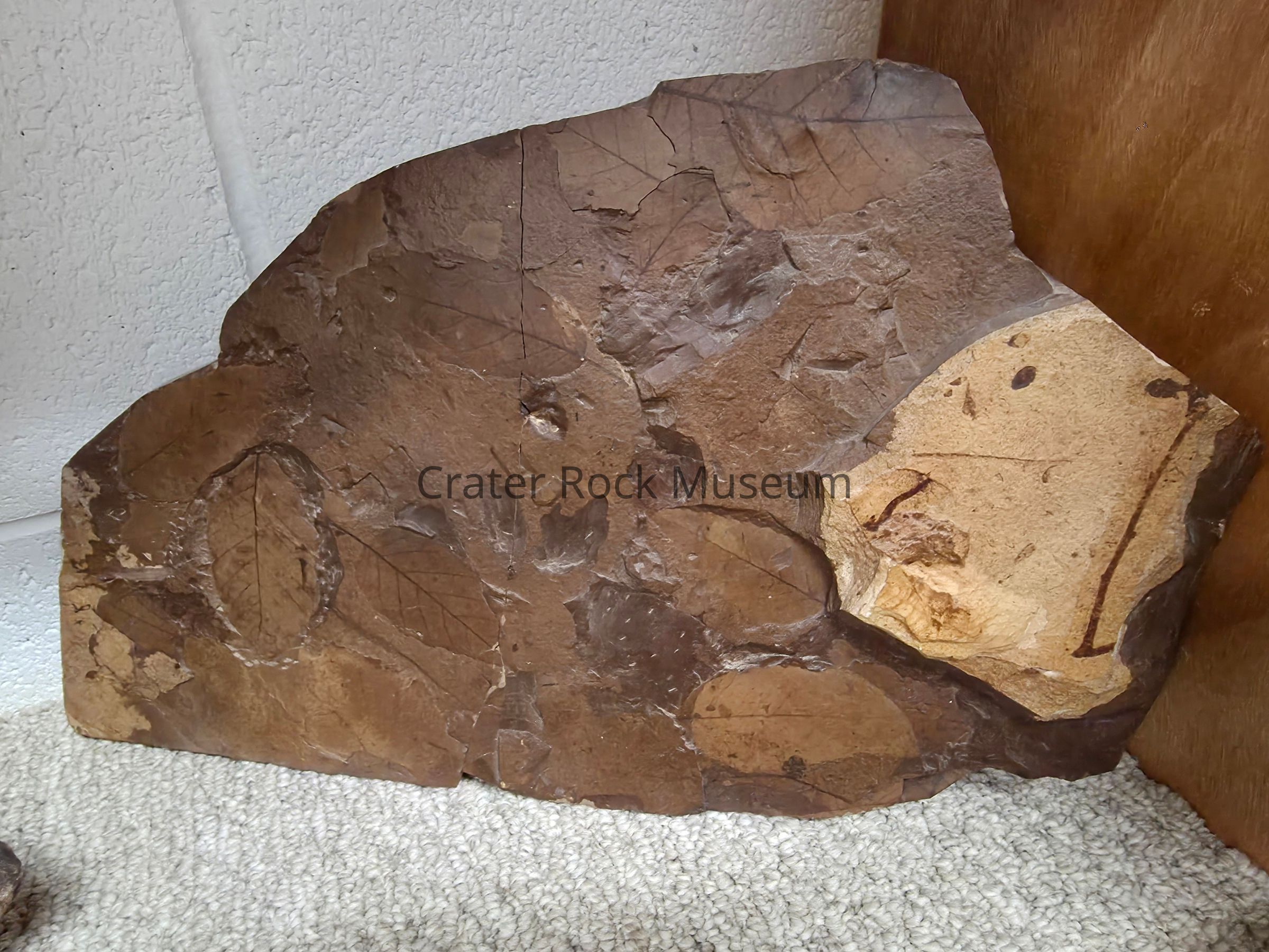 Light brown and tan irregularly shaped slab with one corner being a lighter tan (a fossil leaf) and a darker brown towards the center. Several fossil leaves are located throughout.