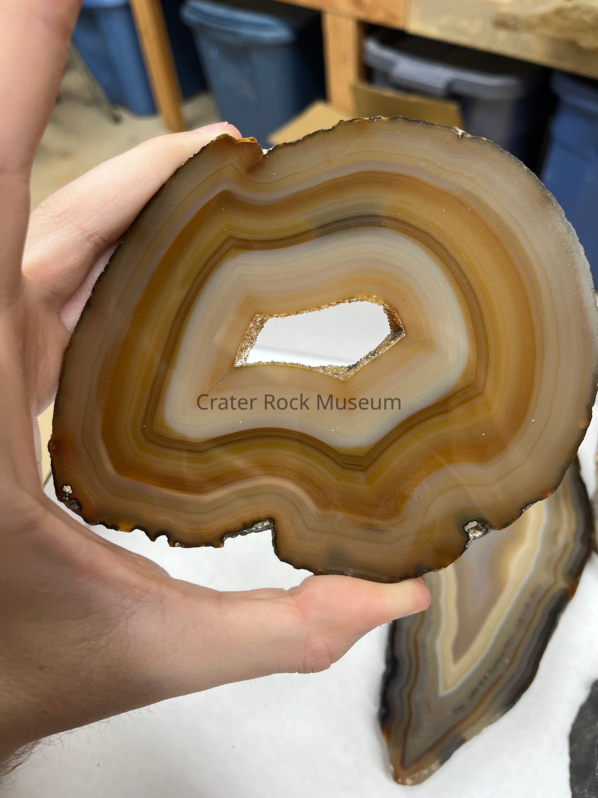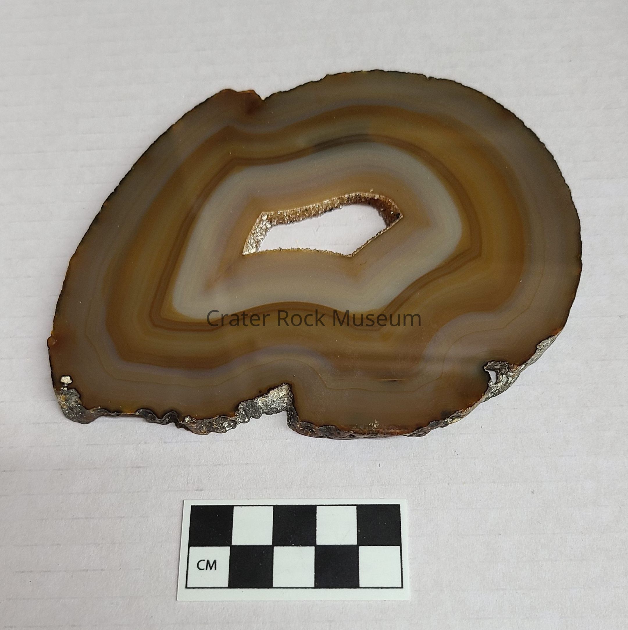 A 3/8" (.9 cm) thick slice of an agate from Brazil. Polished side shows open Crystalline lined hole in center surrounded by fortified Agate in Greys, Browns and Olives. Black is at outer edge.Dimensions