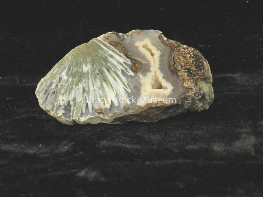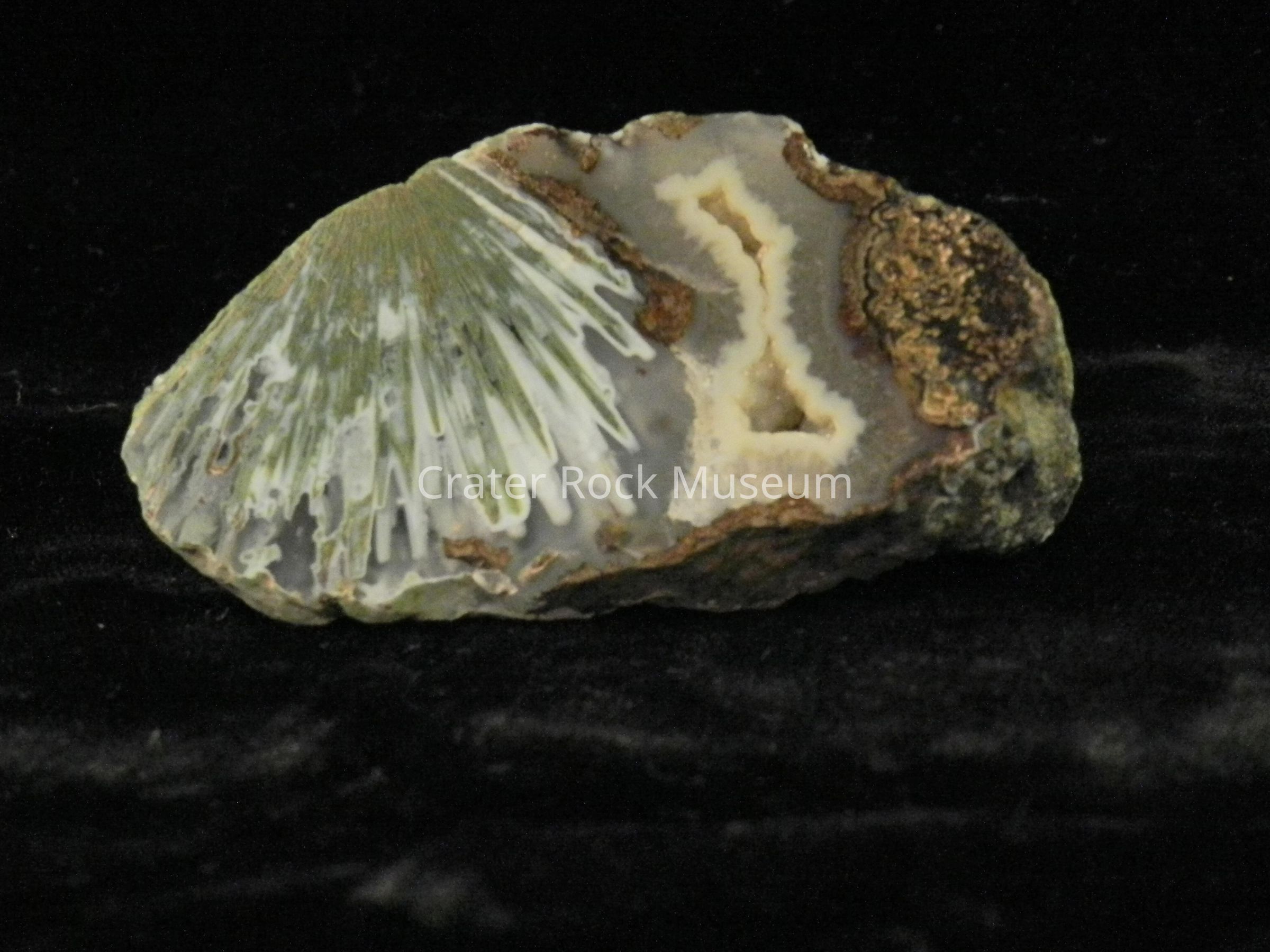 Description: Rounded back with polished face. Green and white "spray" with transparent white crystalline structure surrounding it. Two small hollows present.Collection