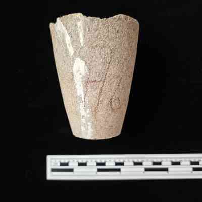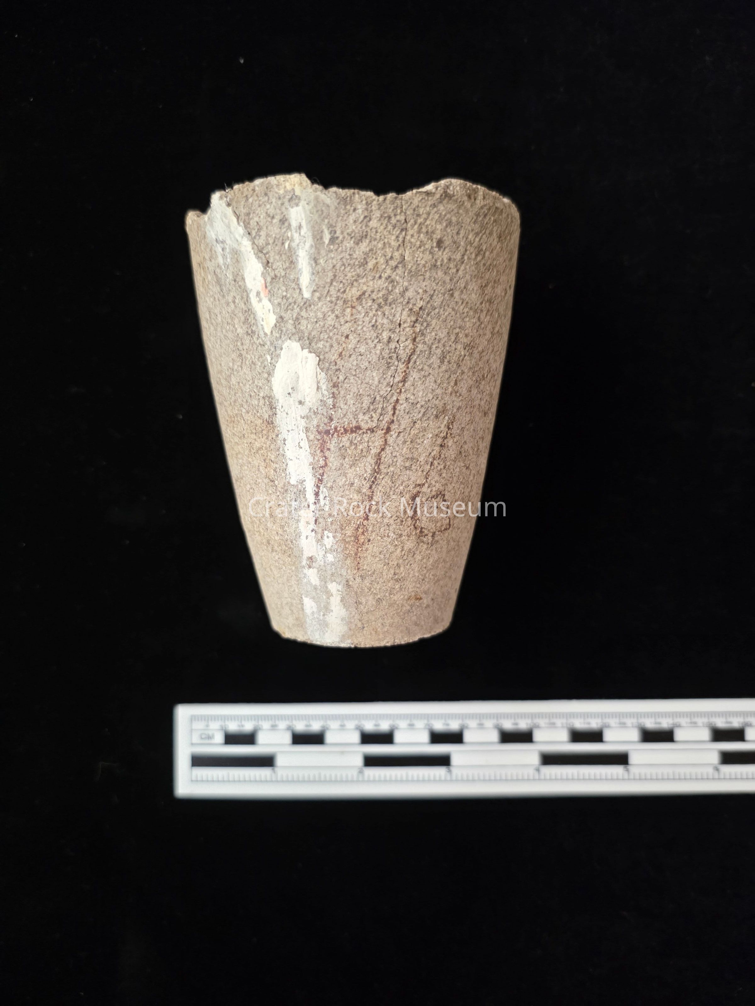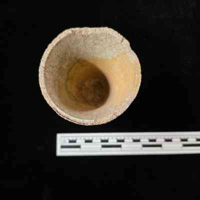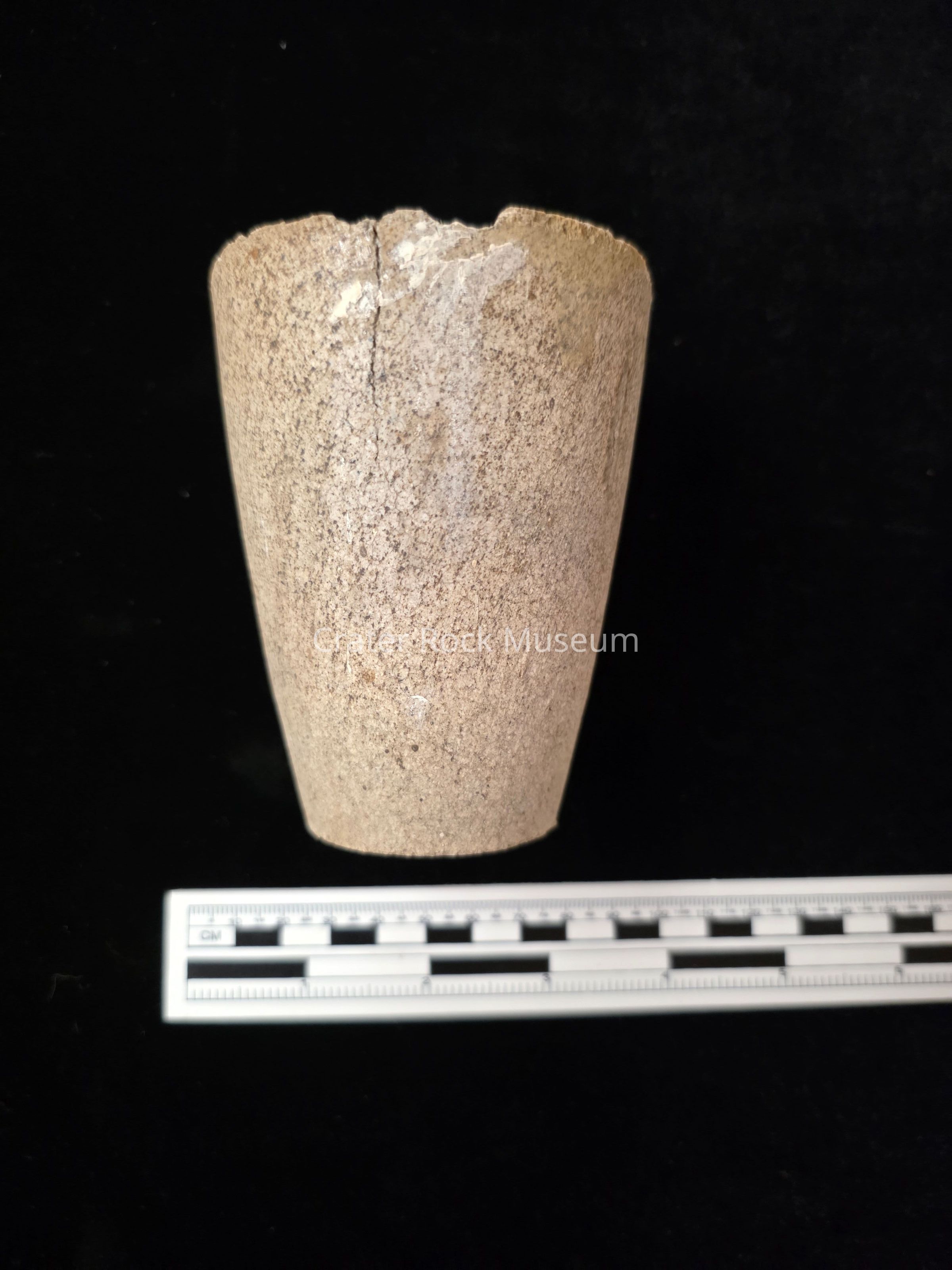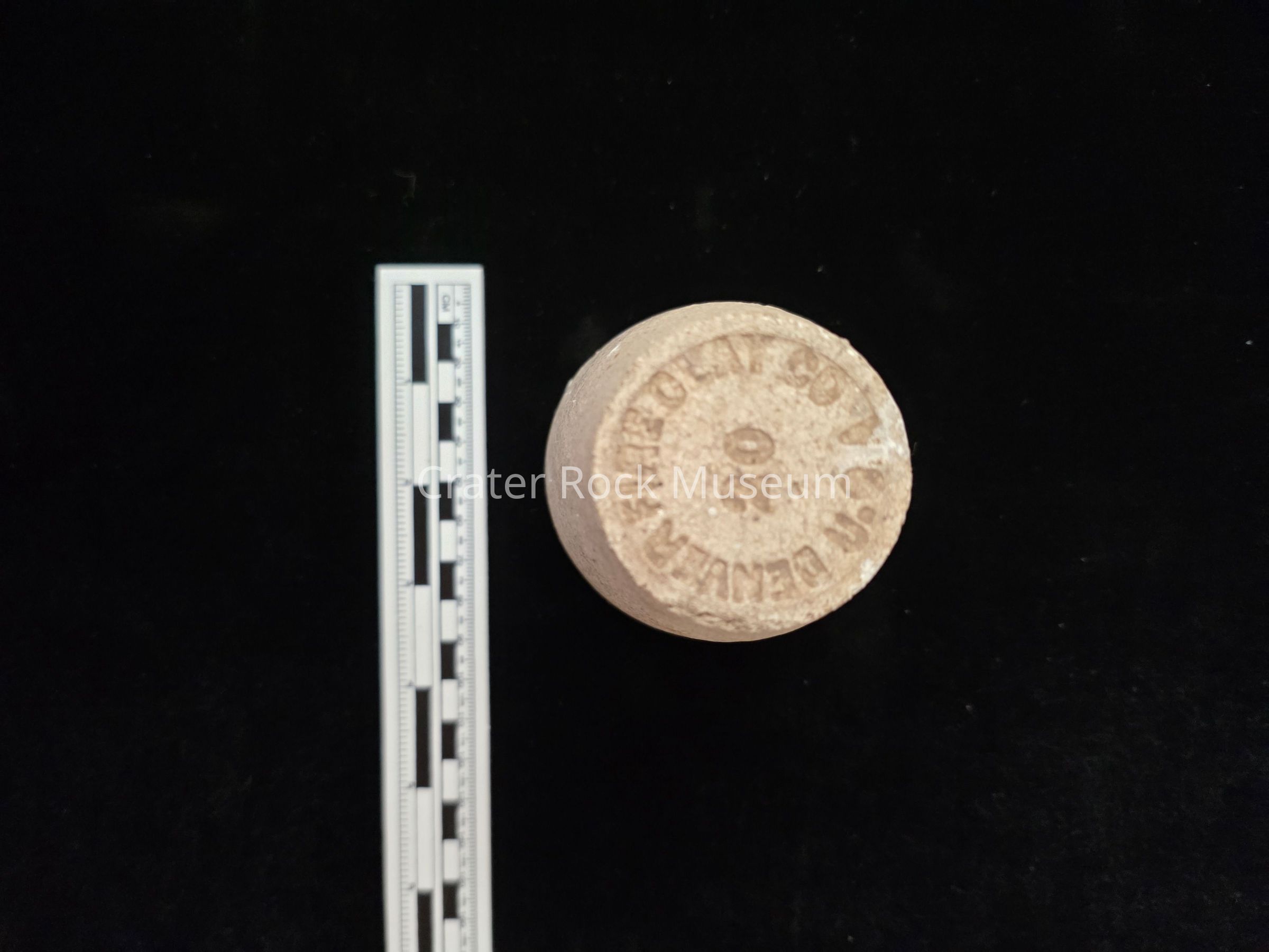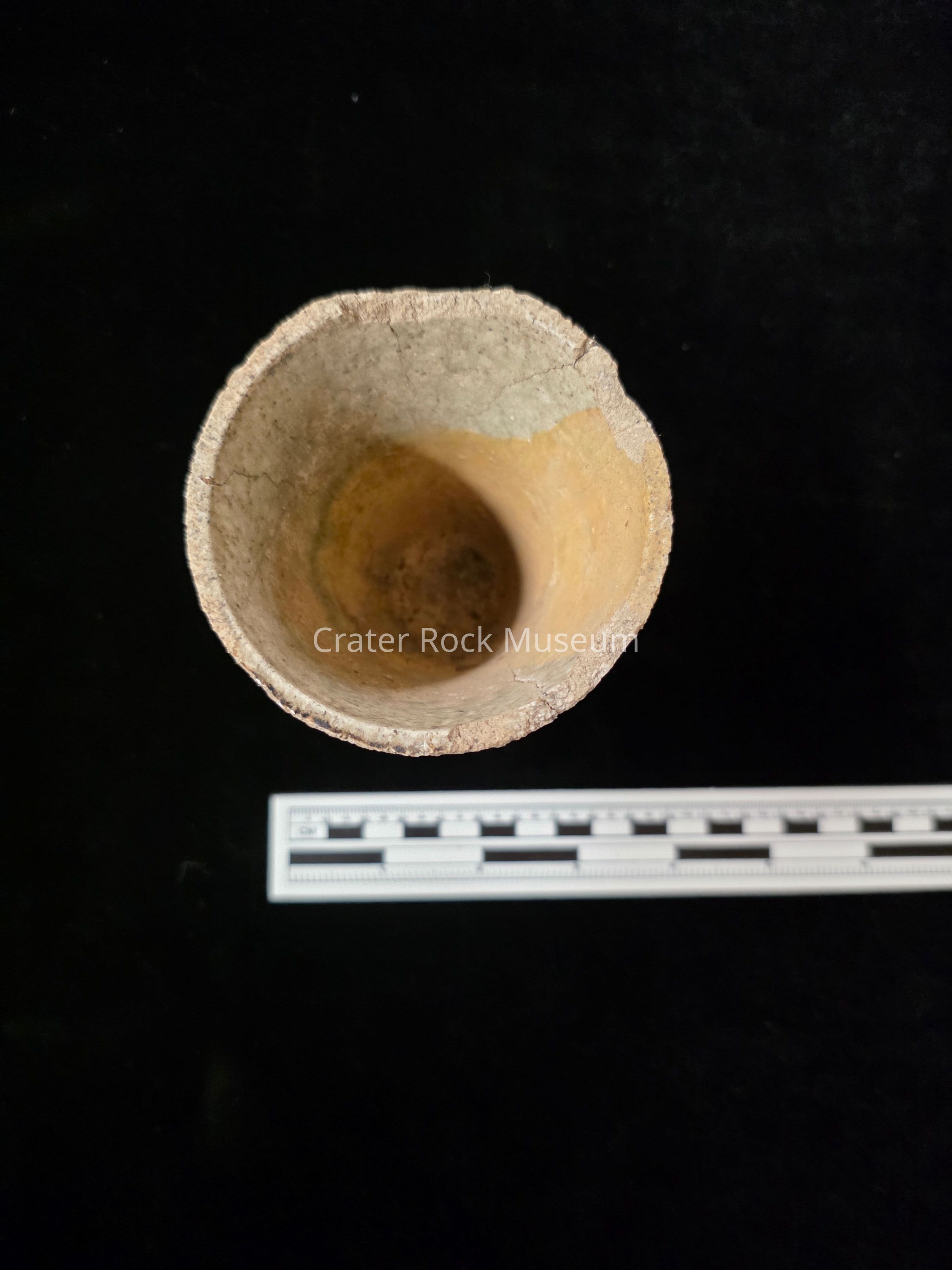 Cream colored ceramic crucible made between 1892-1937 by Denver Fire Clay Company. It is about 4" tall with a 3" diameter with white residue down two sides. The rim is damaged, with the exterior marked with a 'H6'. The base is stamped.Location