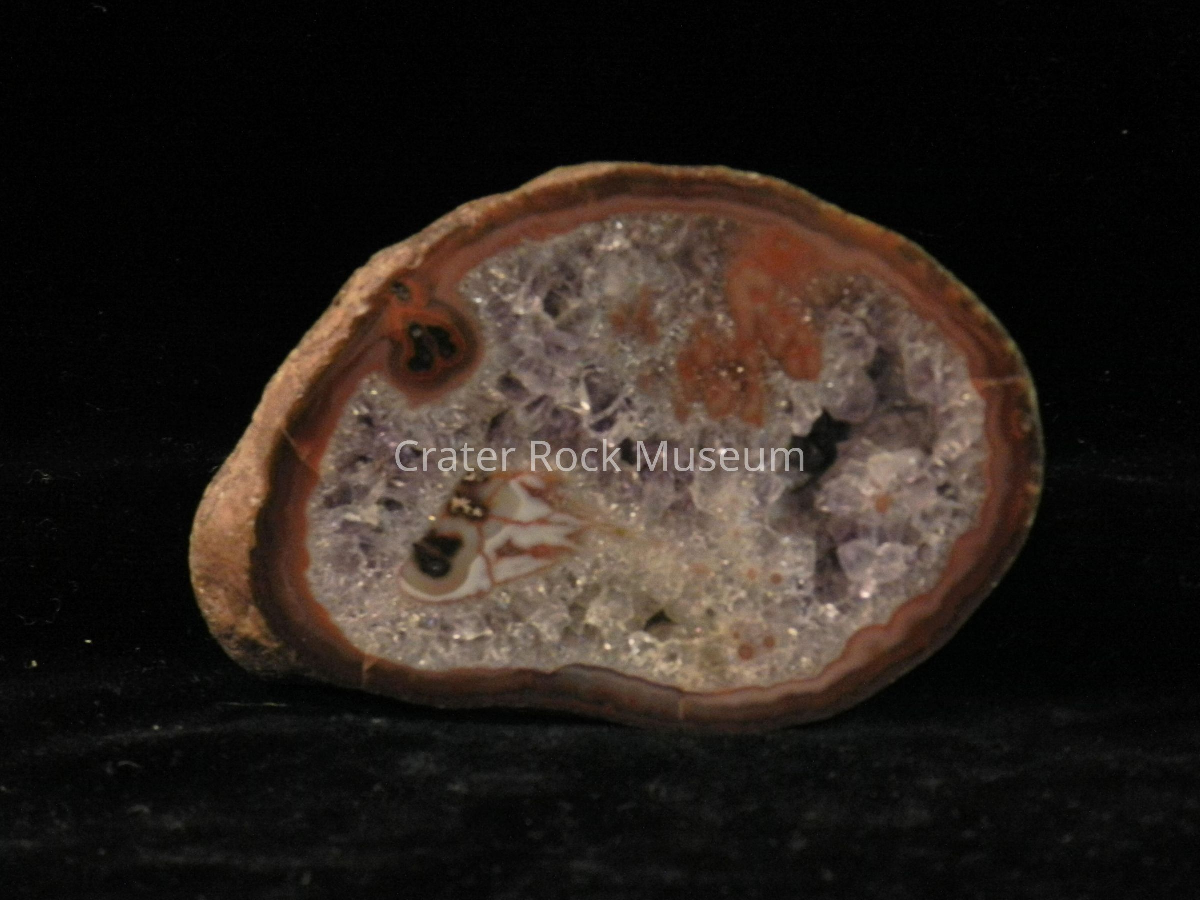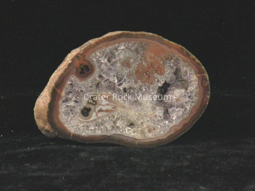 Description: Rounded back with polished face. Dark red band on outer edge with transparent purple and white crystalline structure in center.