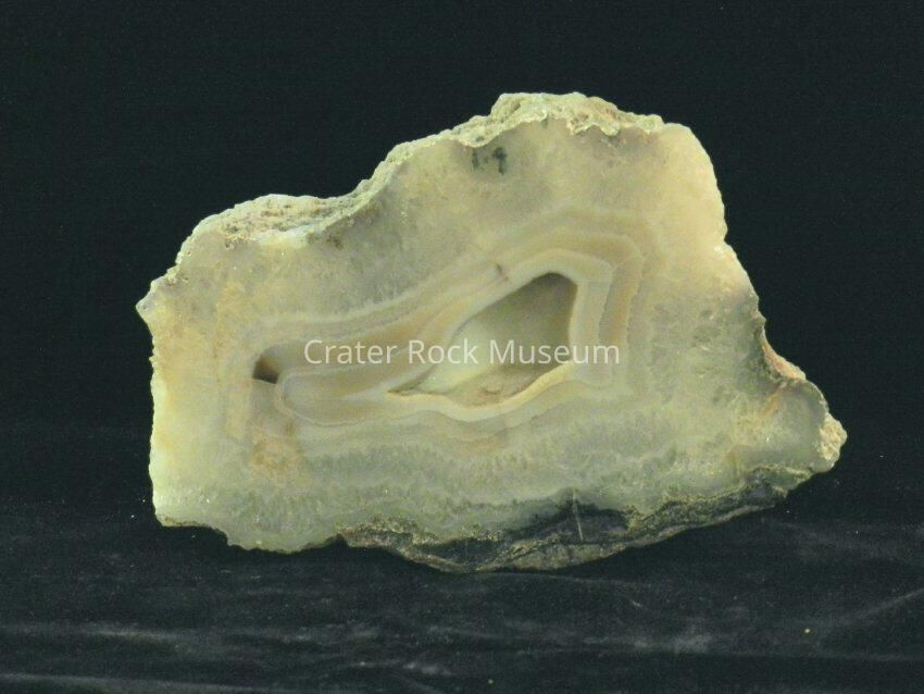 Description: Rocky, round back with polished face. Outer area has a translucent crystalline structure with creamy beige and white banded center with a hollow at center.Collection