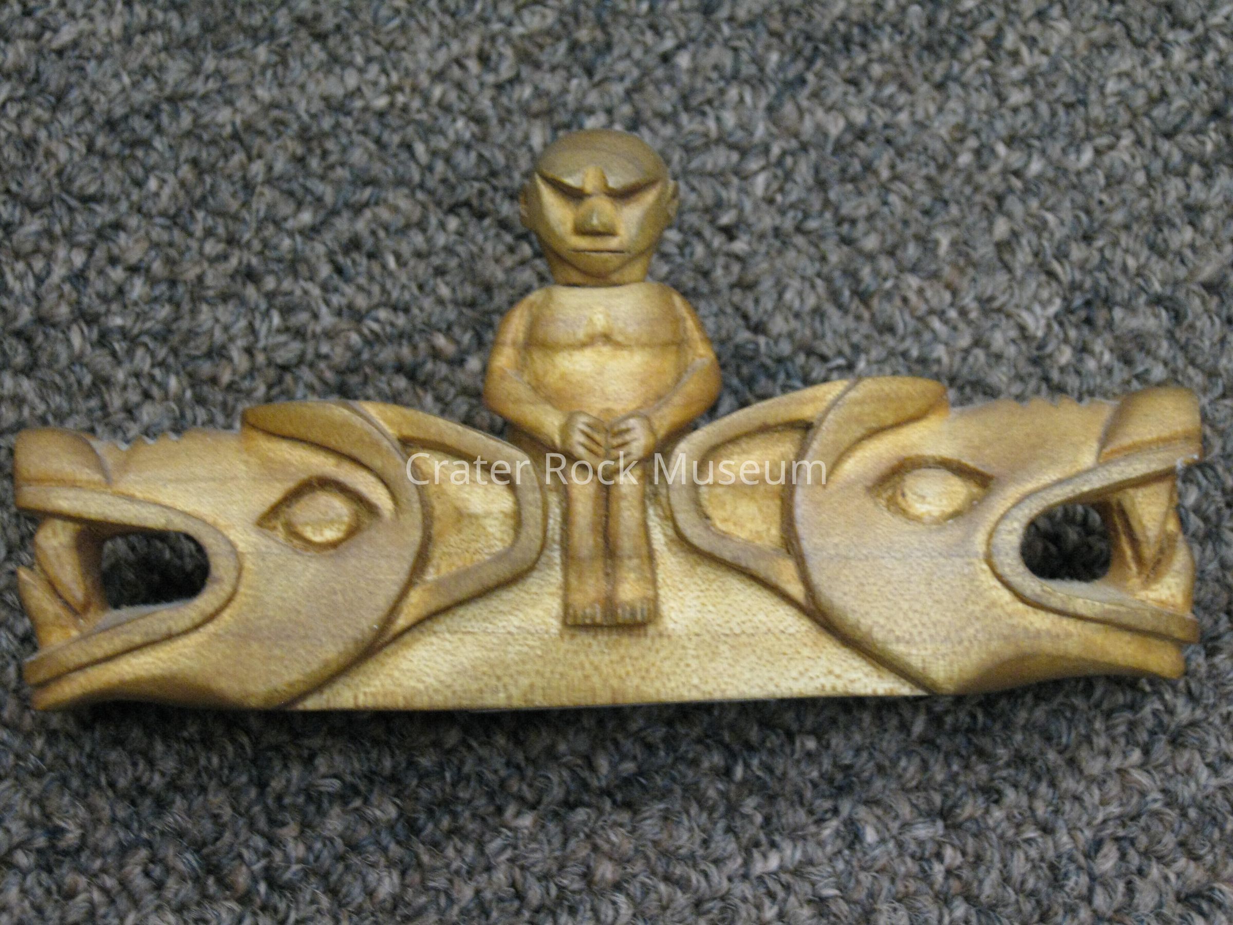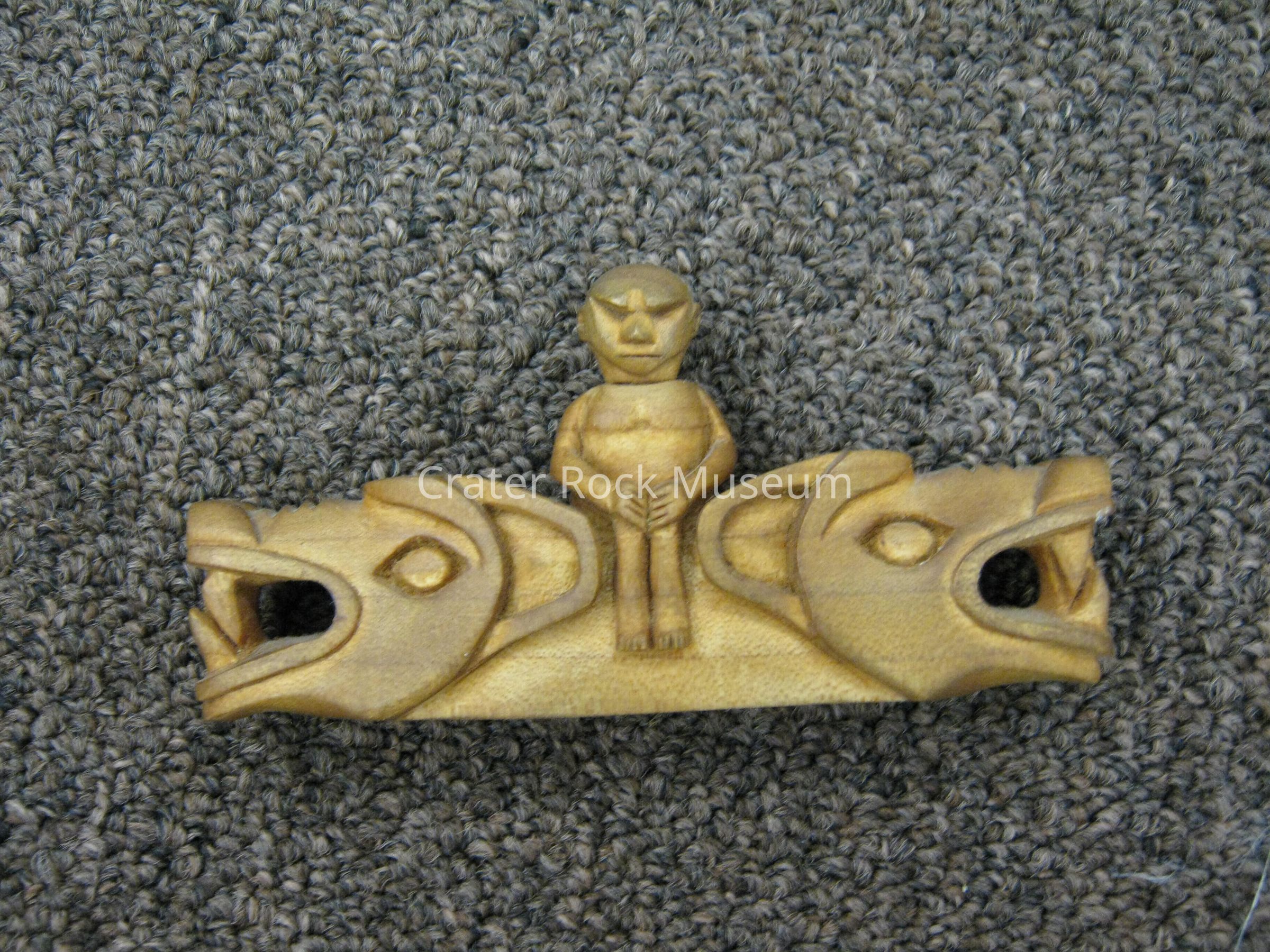 Description: Golden soul catcher. 2 bear heads on both ends with a man in the middle.