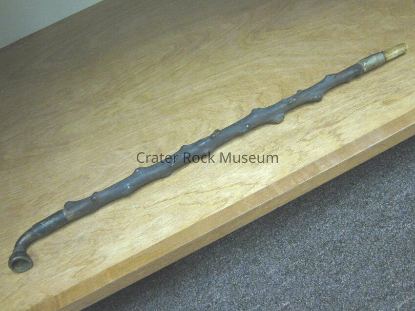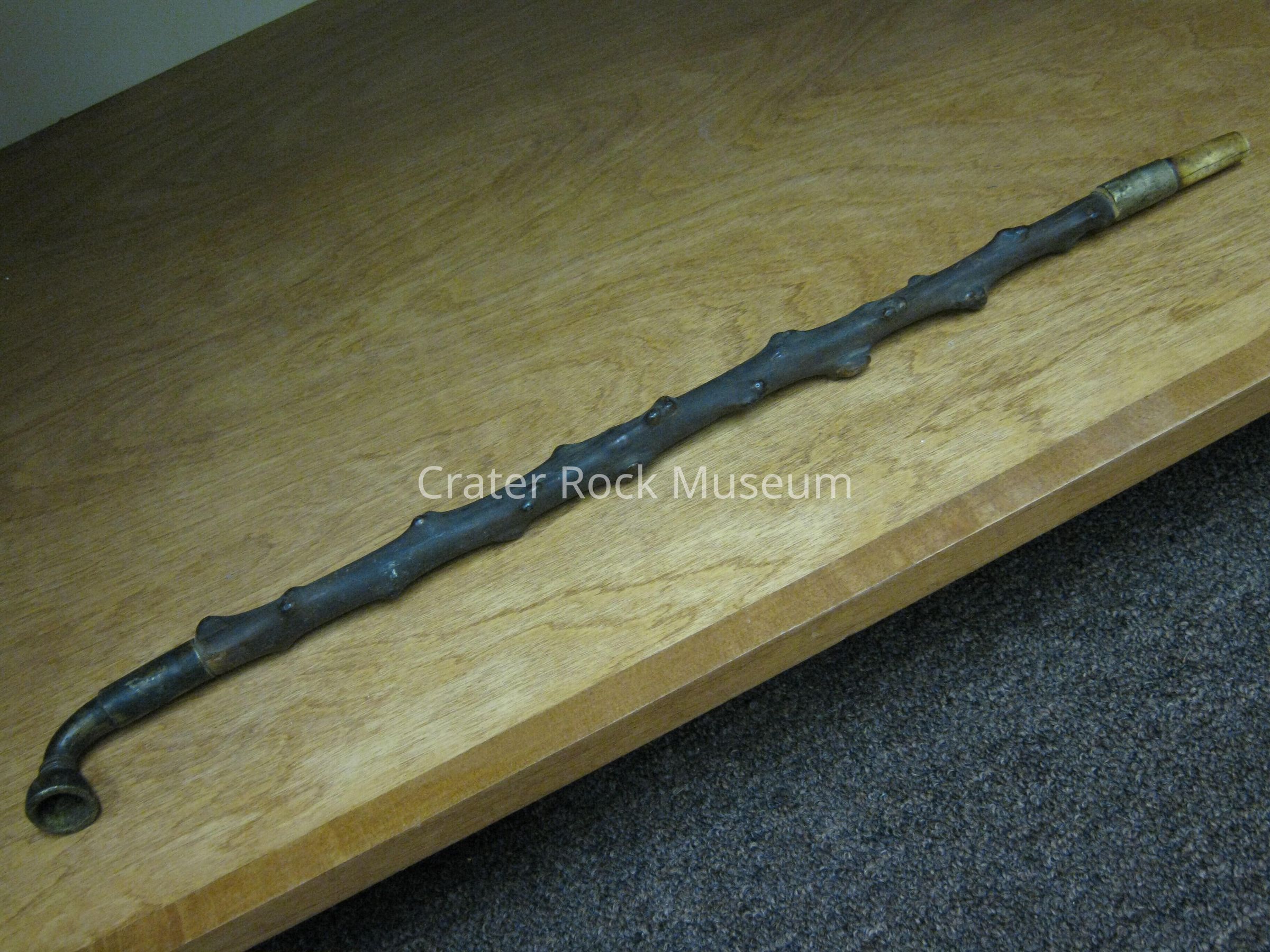A Chinese tobacco pipe with a long stem formed of a length of knotted wood. The bowl is likely brass and has a round, straight stem connection, turning 90 degrees up and broadening into a shallow hemisphere. Its likely from the early 20th century.Collection