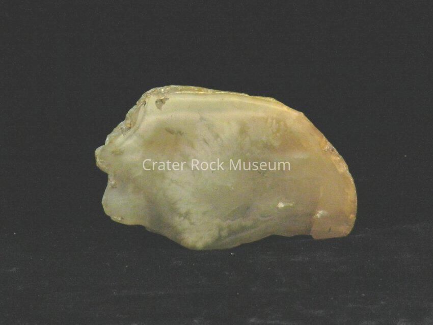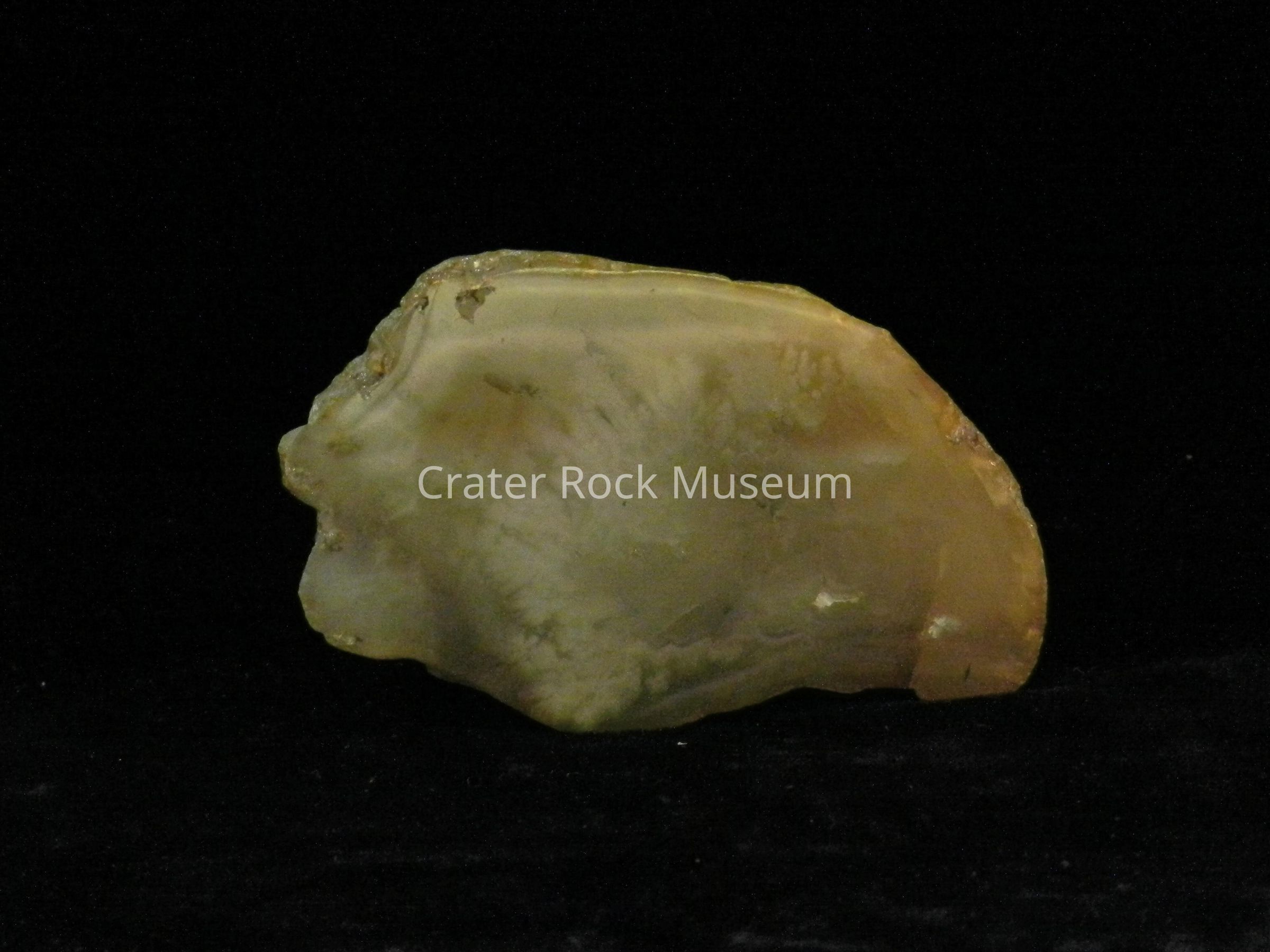 Description: Smooth rounded back with polished face. Translucent gray and white (plumes) with a tinge of a rusty gold outer edge.Collection