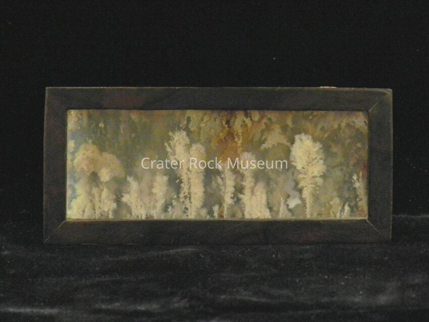 Description: Rectangular (in frame) Translucent browns and beige with white dendritic intrusions.Collection