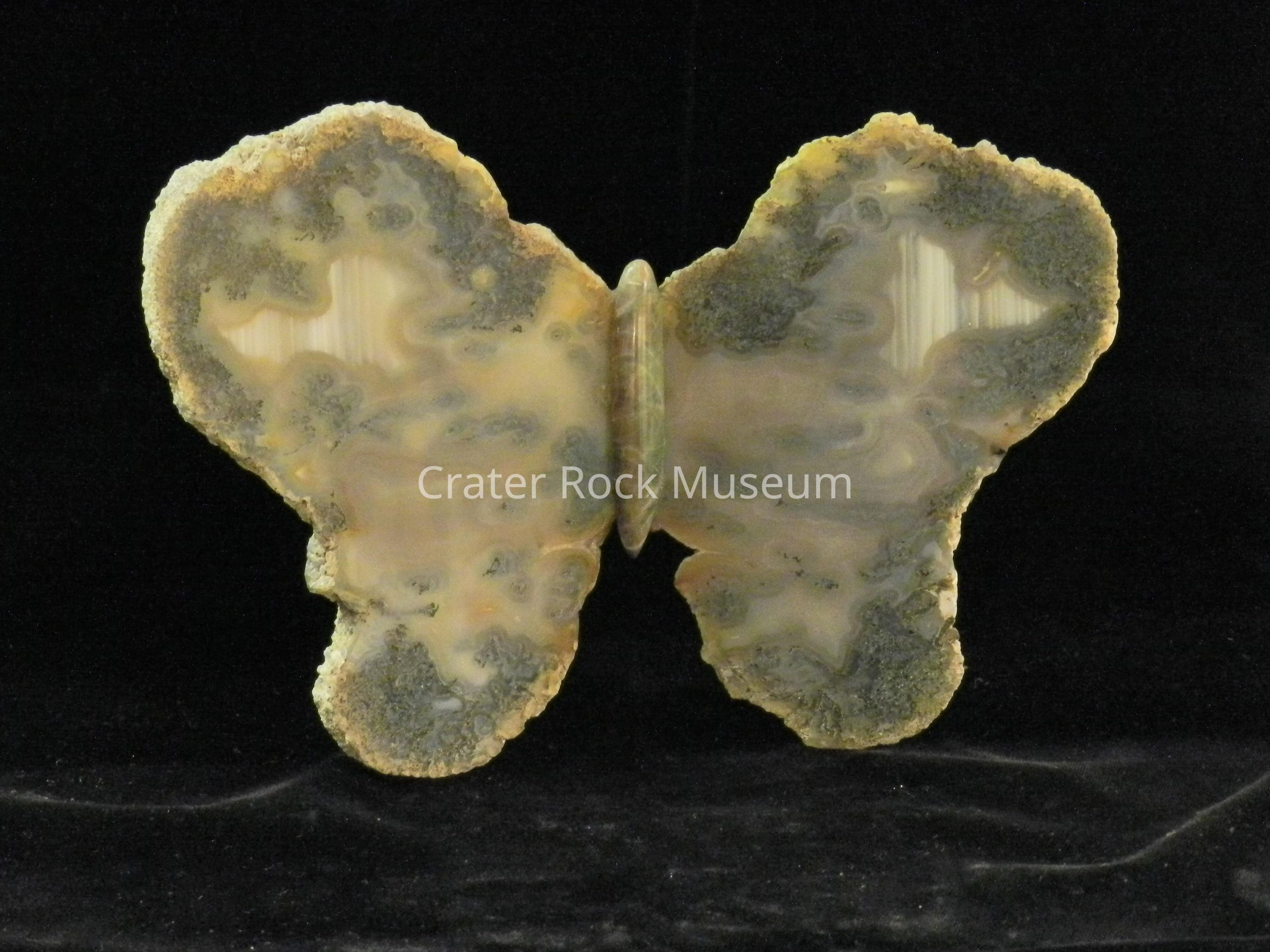 Description: (Butterfly) Creamy browns and tans towards center with green areas (sandy specks) and a light tan outer band.Collection