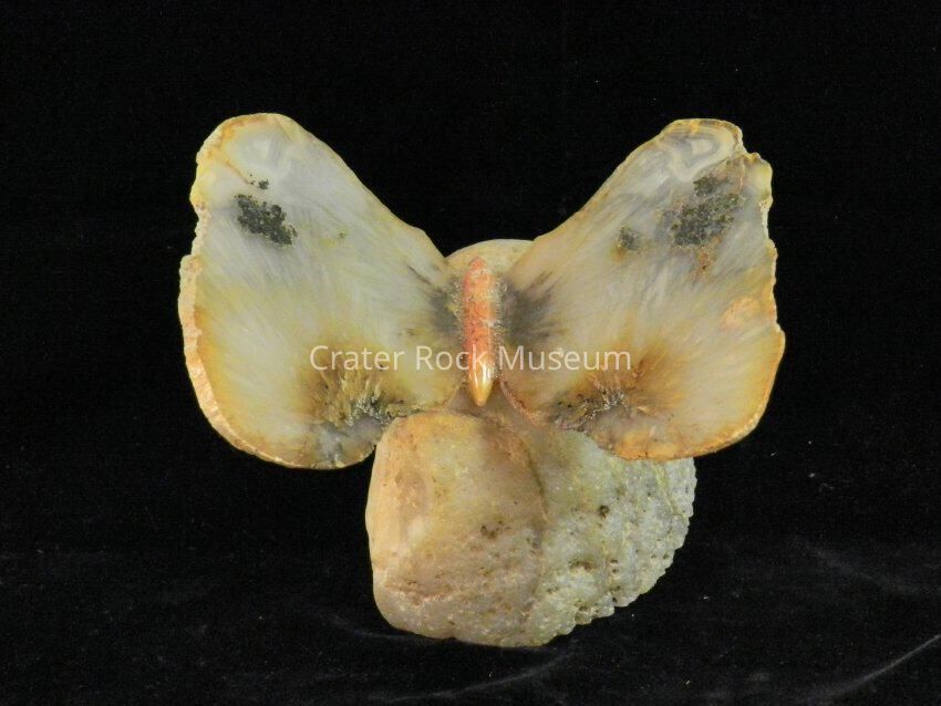 Description: (Butterfly) Translucent beige and reddish tan wings on a rounded back (large) pedestal.Collection