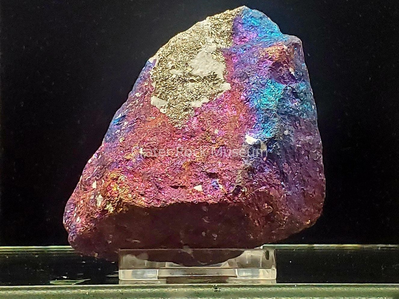 It has a copper-reddish colour on fresh exposures which quickly tarnishes to a pinkish grey, through to an iridescent purple, crimson or blue and eventually black, after exposure to air and moisture, due to formation of very thin coatings of more oxidised minerals.