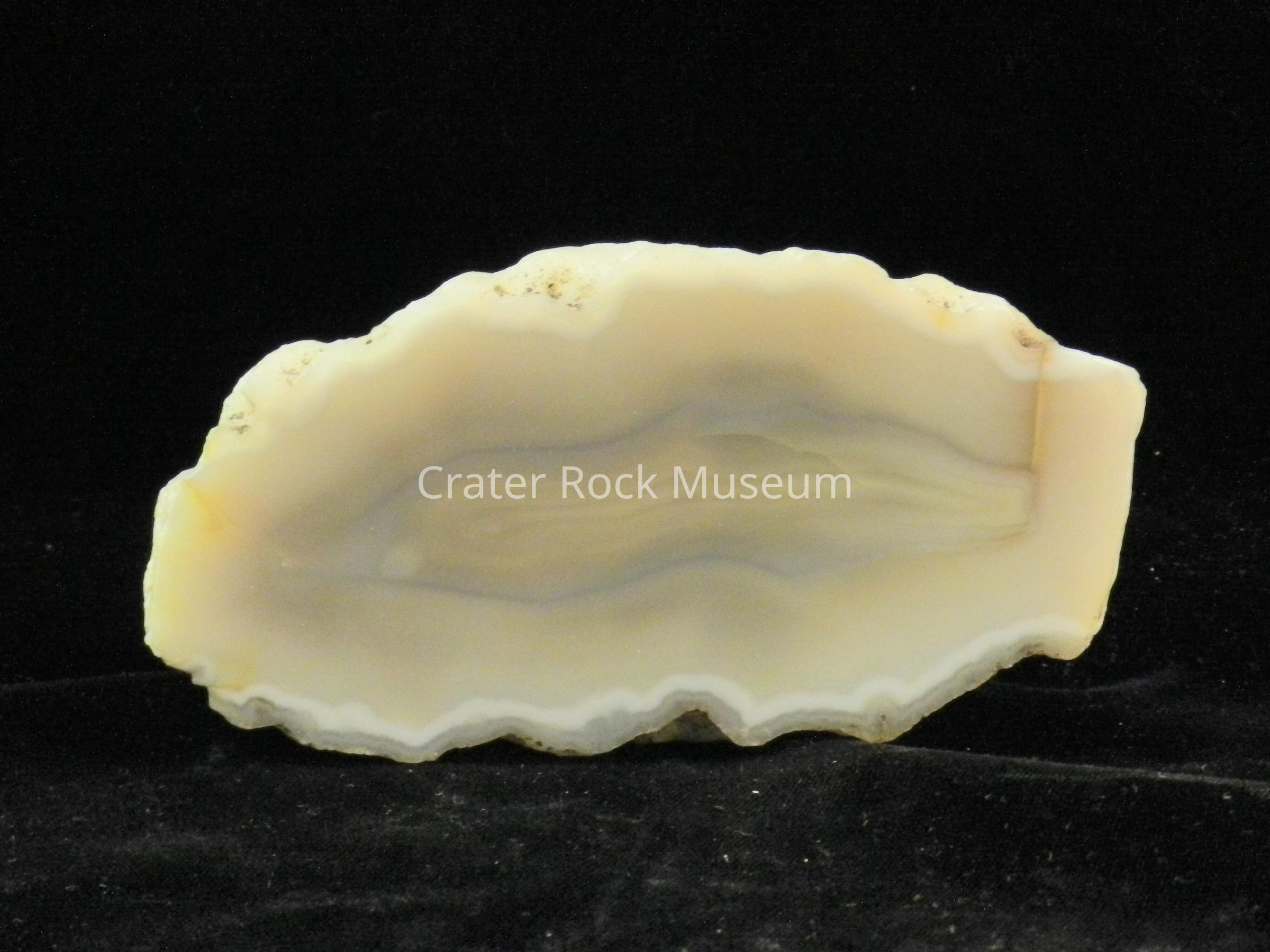 Description: Rough rounded back with polished face. Translucent creamy white outer areas with blue-gray banding towards the center. One white band on outer area.Collection