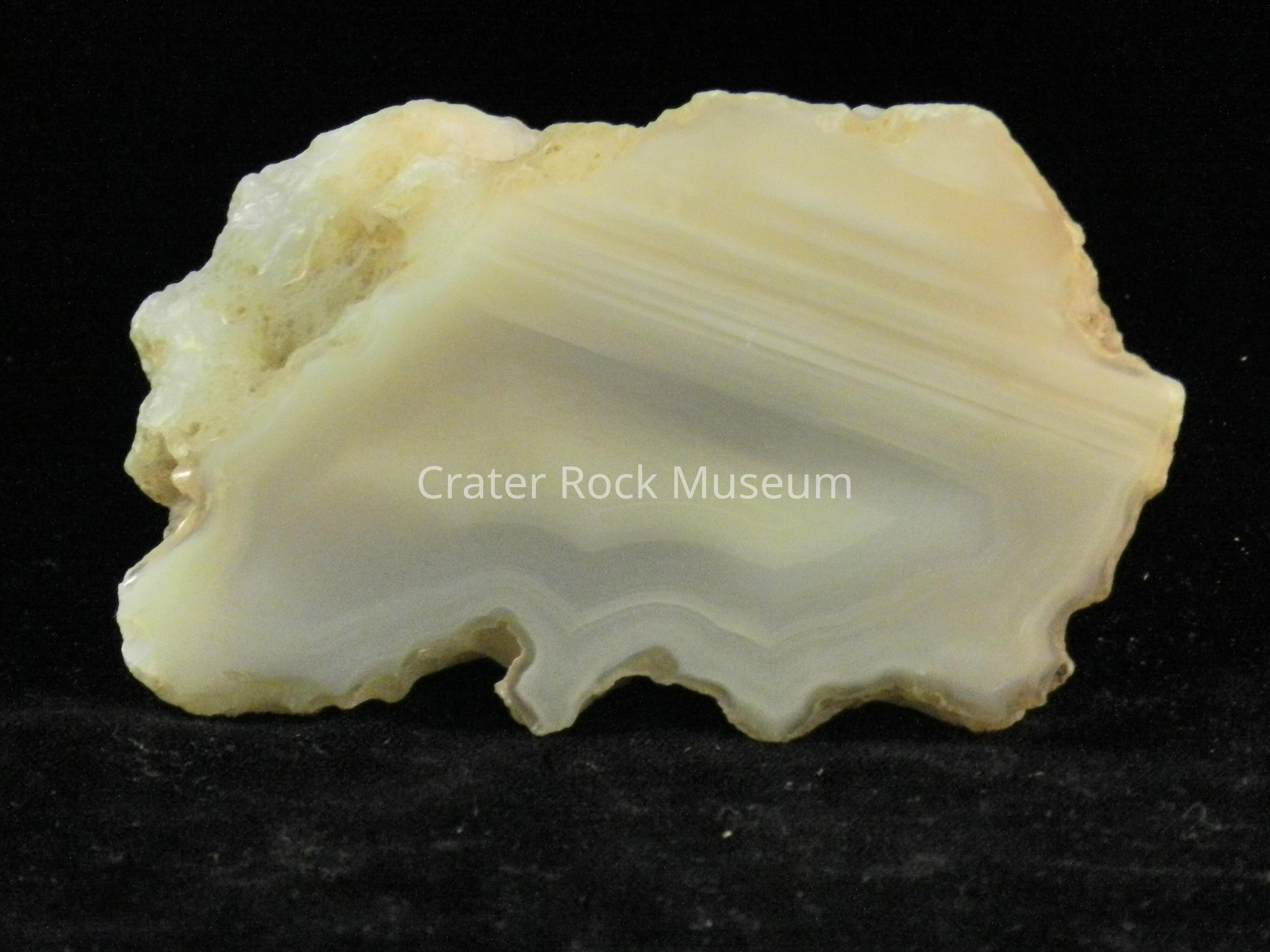 Description: Rough, rounded back with polished face, one half is creamy white to blue-gray symetrical banding and other half has white and blue-gray linear banding.Collection
